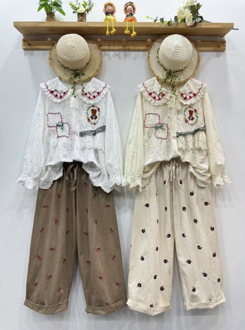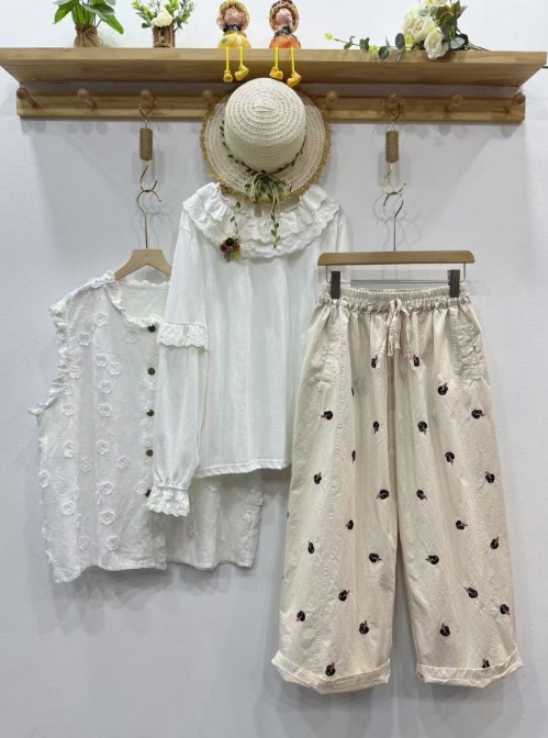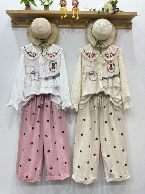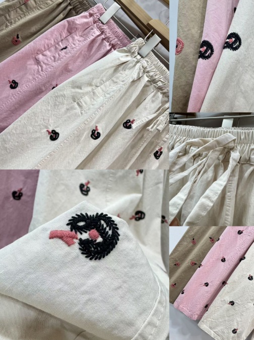 한국식 여성 새 도착 올매치 슬림 자수 엘레 허리 드로우 스트링 느슨한 스트레이트 다리 바지 여성용 캐주얼 바지