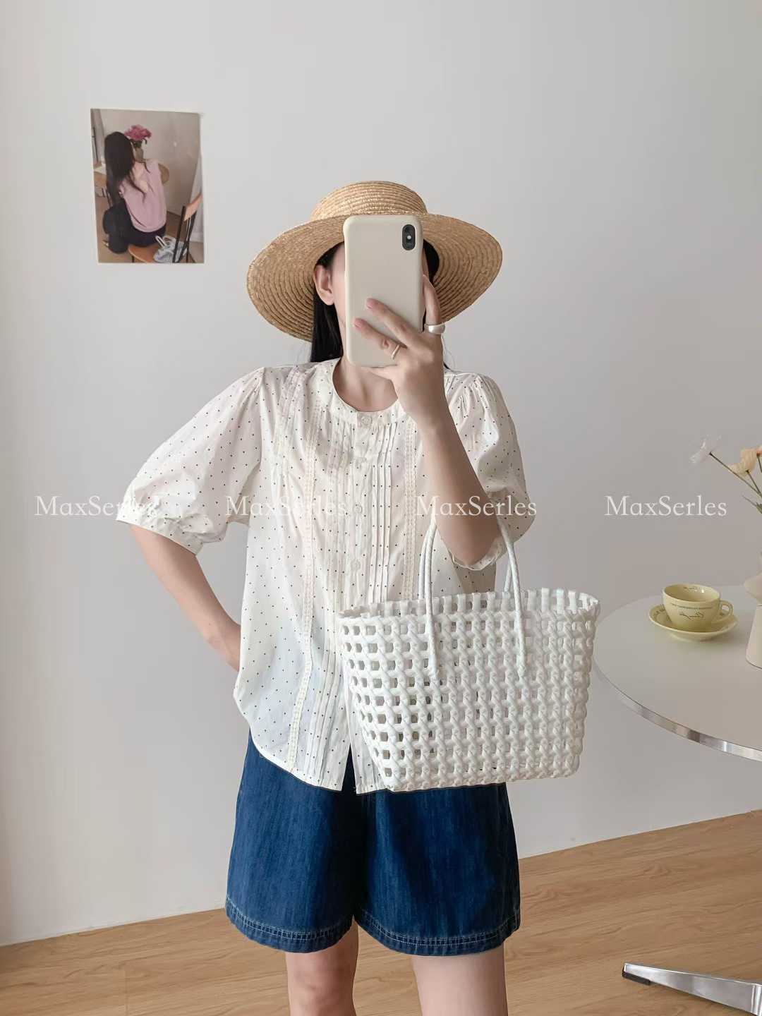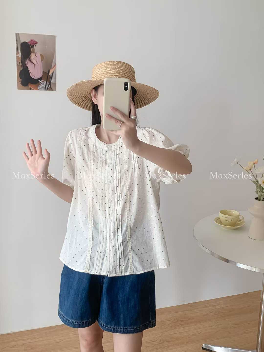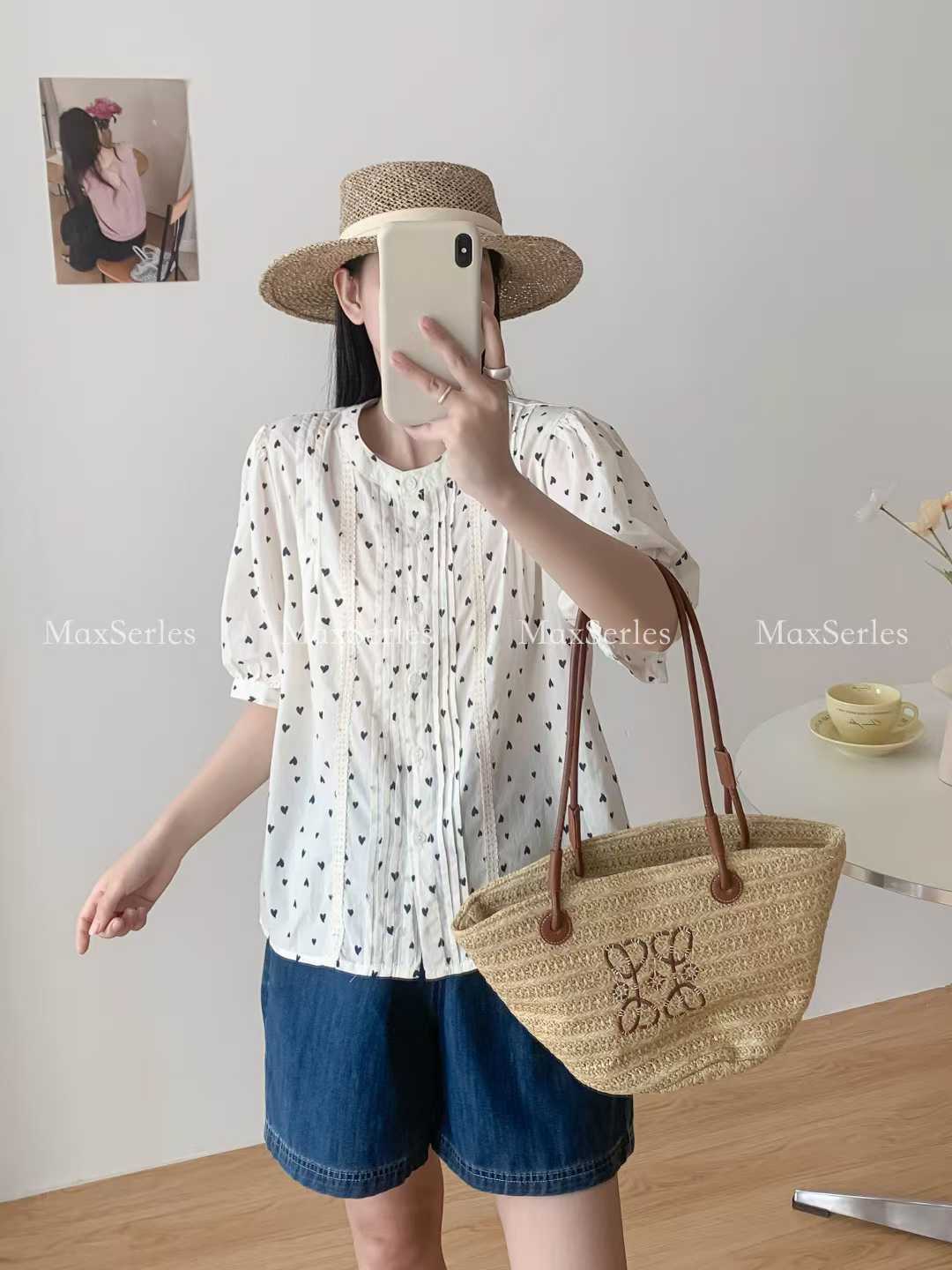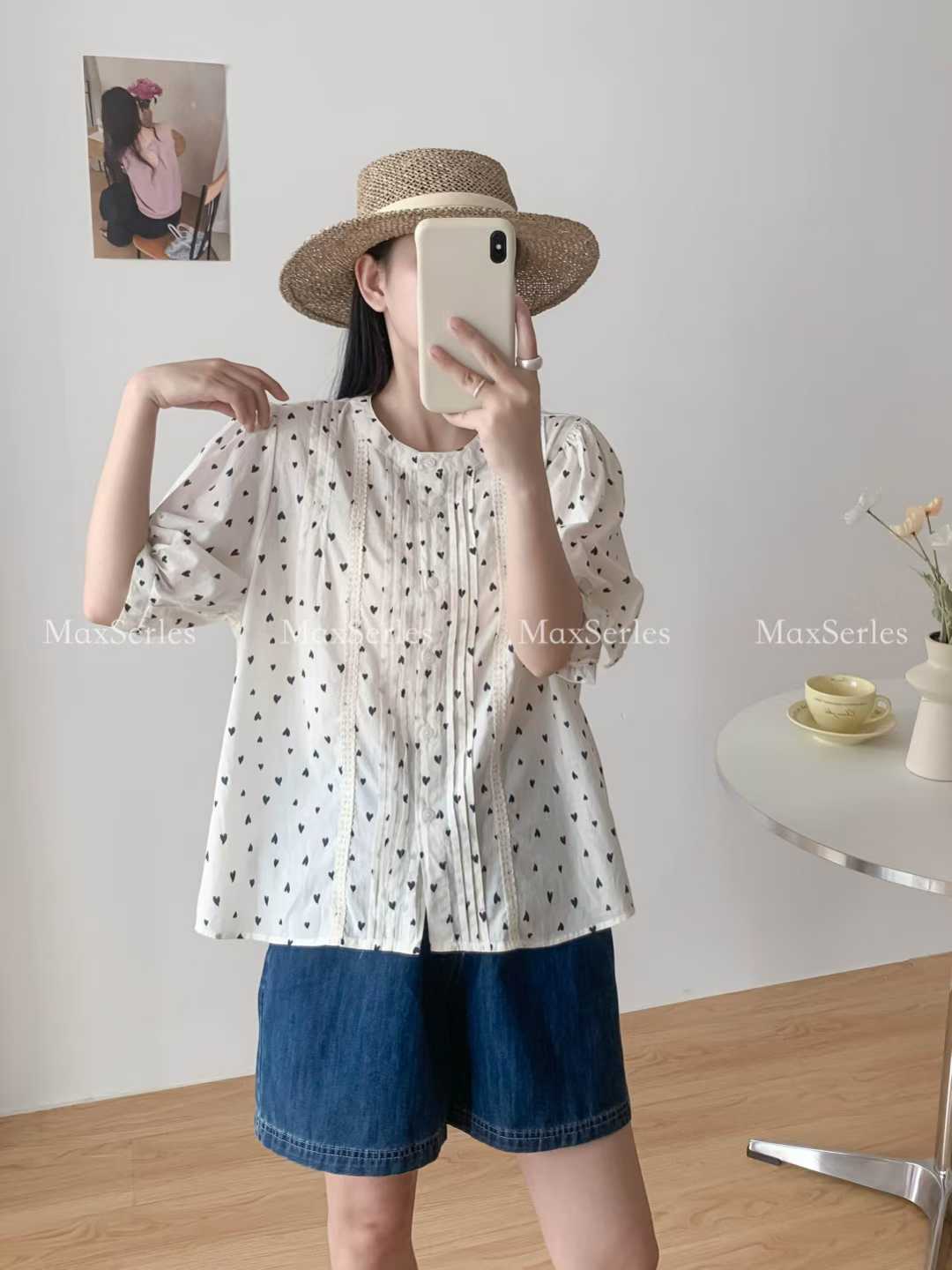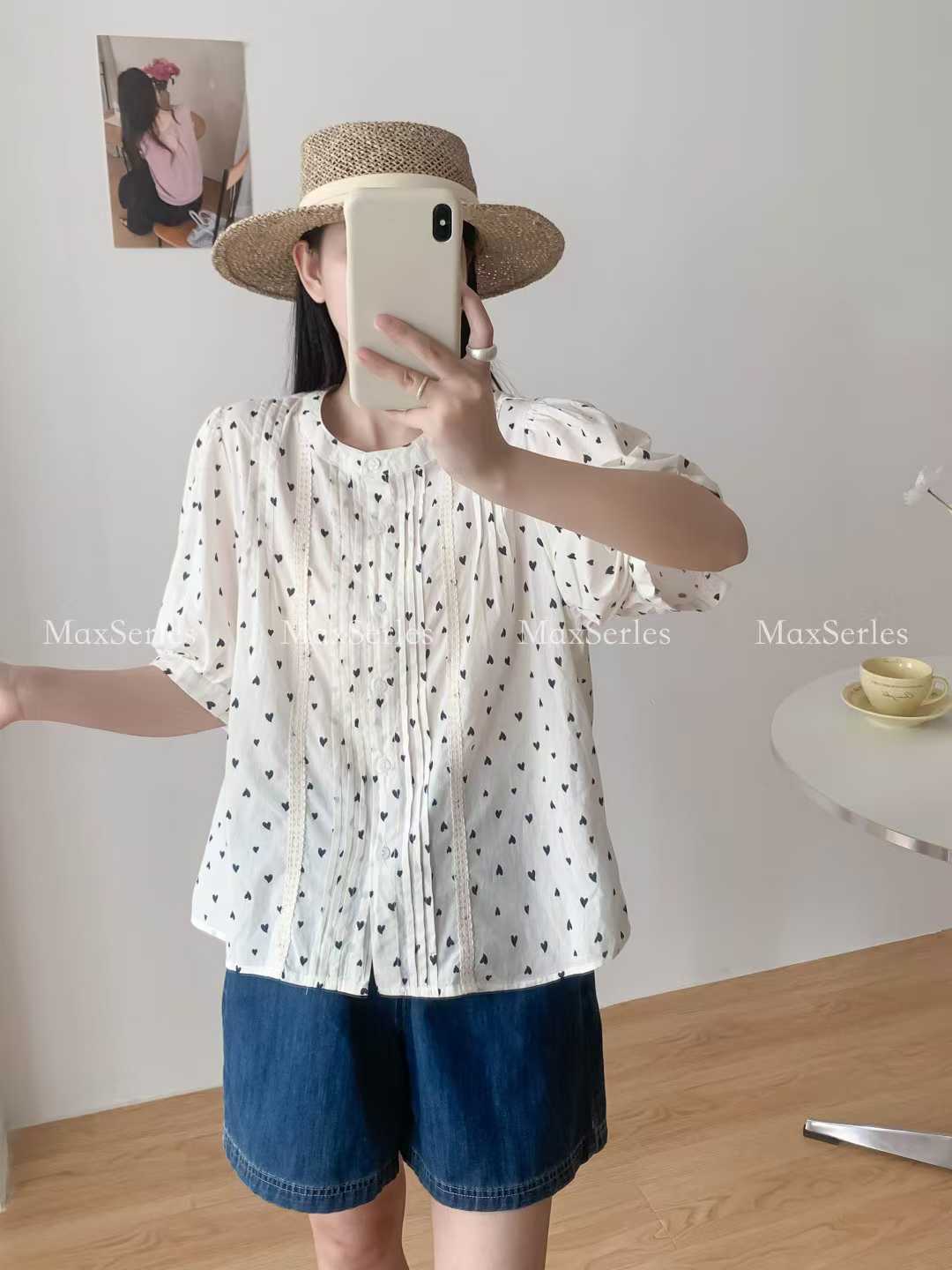 2025 여름 새로운 사랑 인쇄 된 점 Pleated 레이스 느슨한 짧은 소매 셔츠 카디건스토어 가기