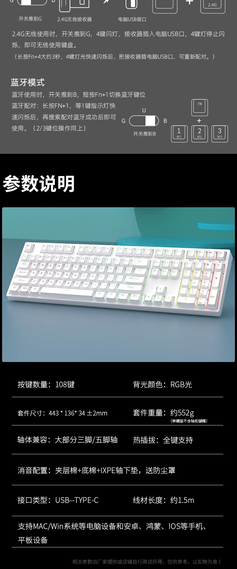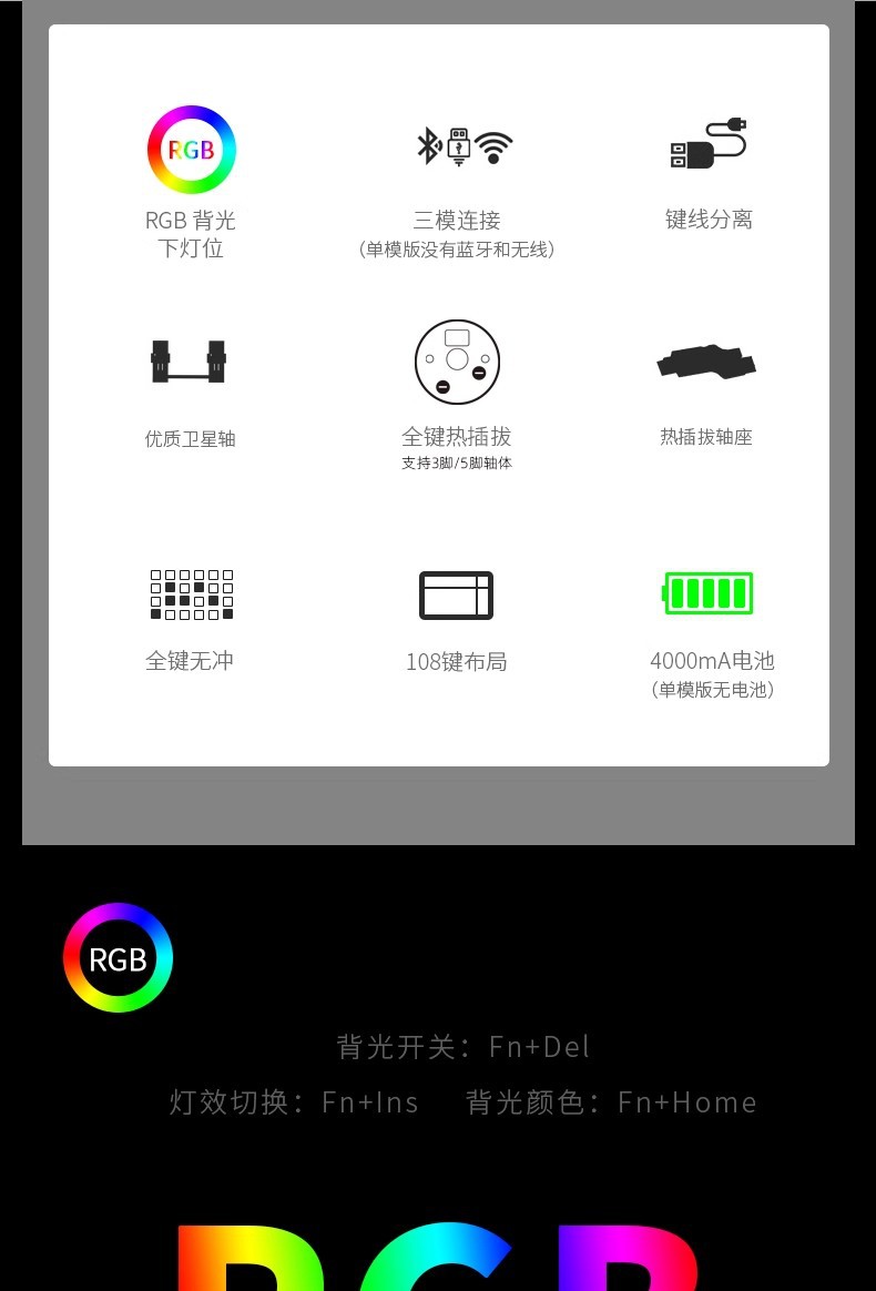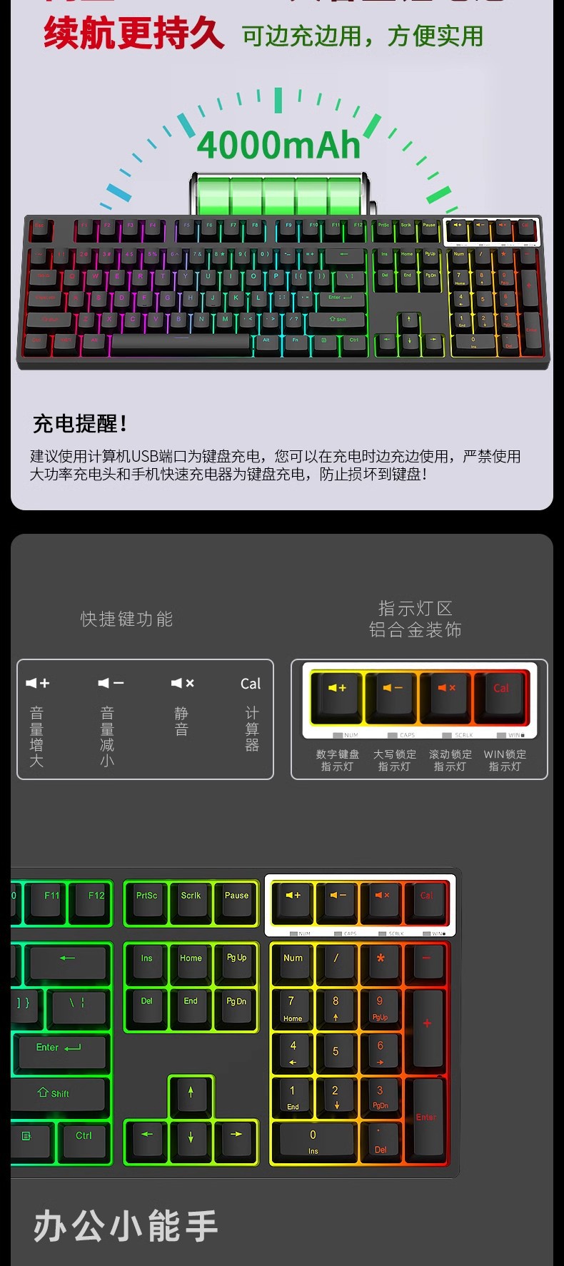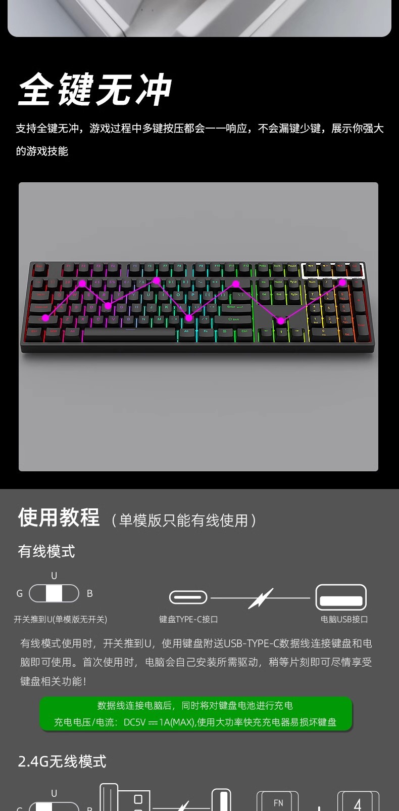 温馨提示:请只用键盘原配充电线连接电脑充电,勿连接手机充电器、充电宝或是其它快充设备充电,以免损坏键盘!此操作不在保修范围内。