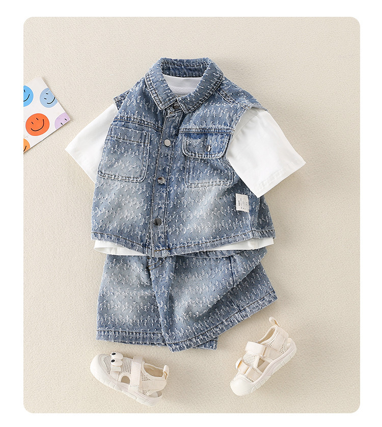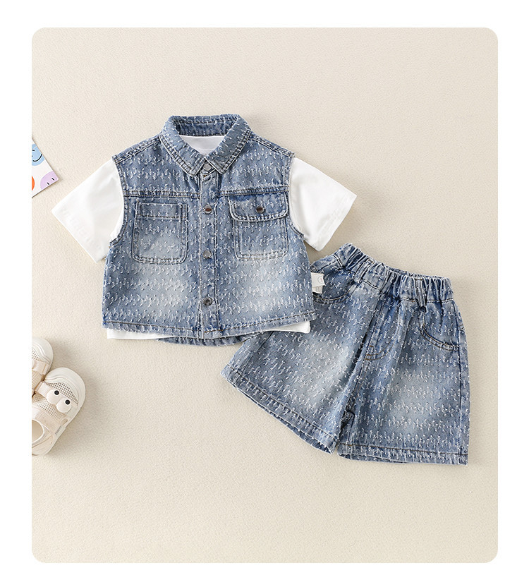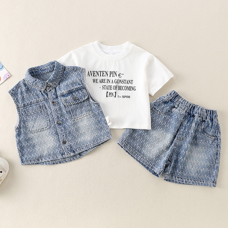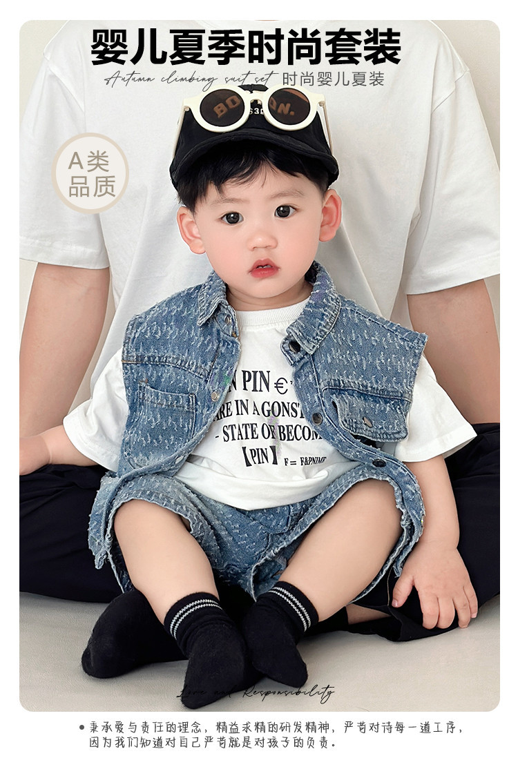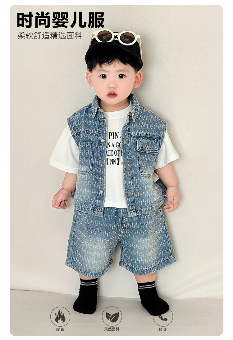 여름 아기 소년 부드러운 데님 패션 트렌드 작업복 조끼 탑 반바지 정장 여름 얇은 3 피스 세트