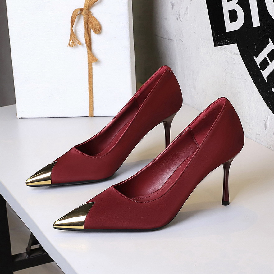 2627-1 얇은 발 뒤꿈치와 얕은 입 새틴 금속 뾰족한 슈퍼 하이힐 신발 여성 신발 유럽과 미국의 슬림 연회 하이힐스토어 가기