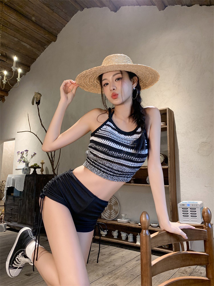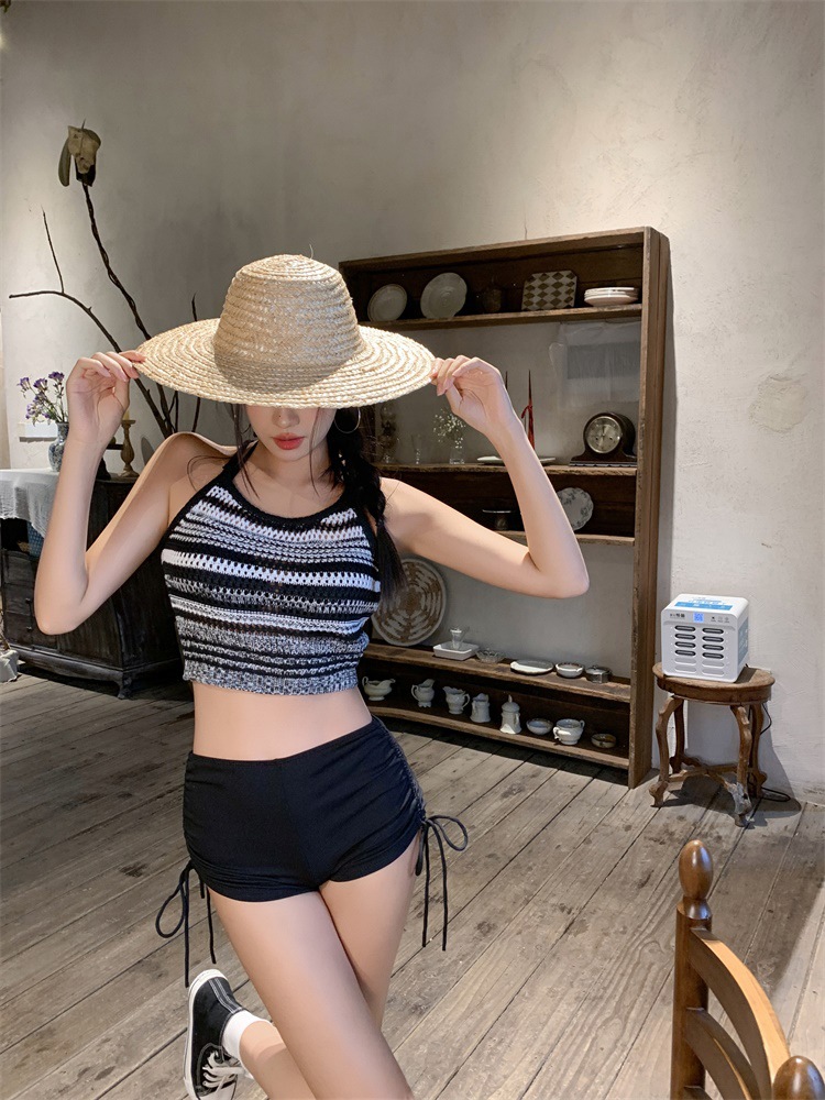 여성을위한 레트로 중공 스트라이프 수영복 2025 여름 한국어 버전 새로운 하이 웨이스트 스플릿 3 피스 핫 소녀 비키니 수영복스토어 가기