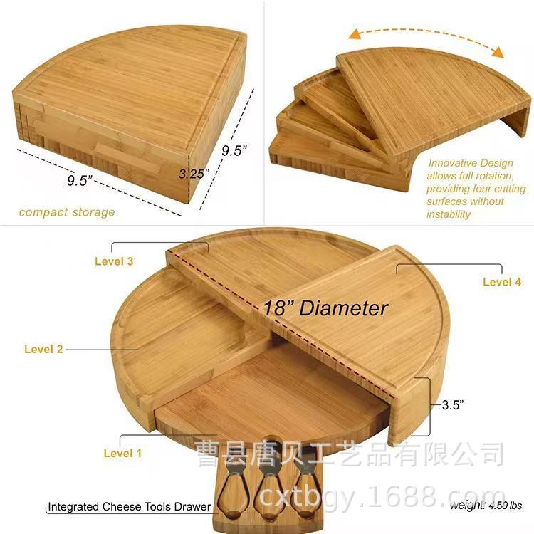 창의적인 대나무 치즈 보드 세트, 원형 개폐식 나무 치즈 보드, 칼과 포크 스테이크 빵 포함, 단단한 나무 디너 플레이트