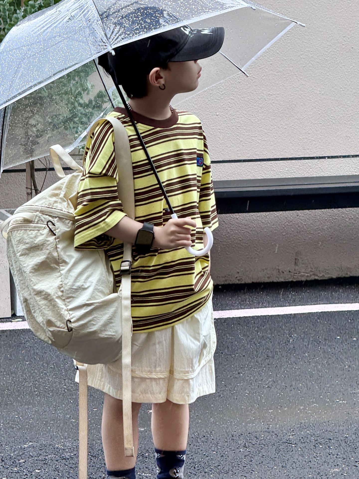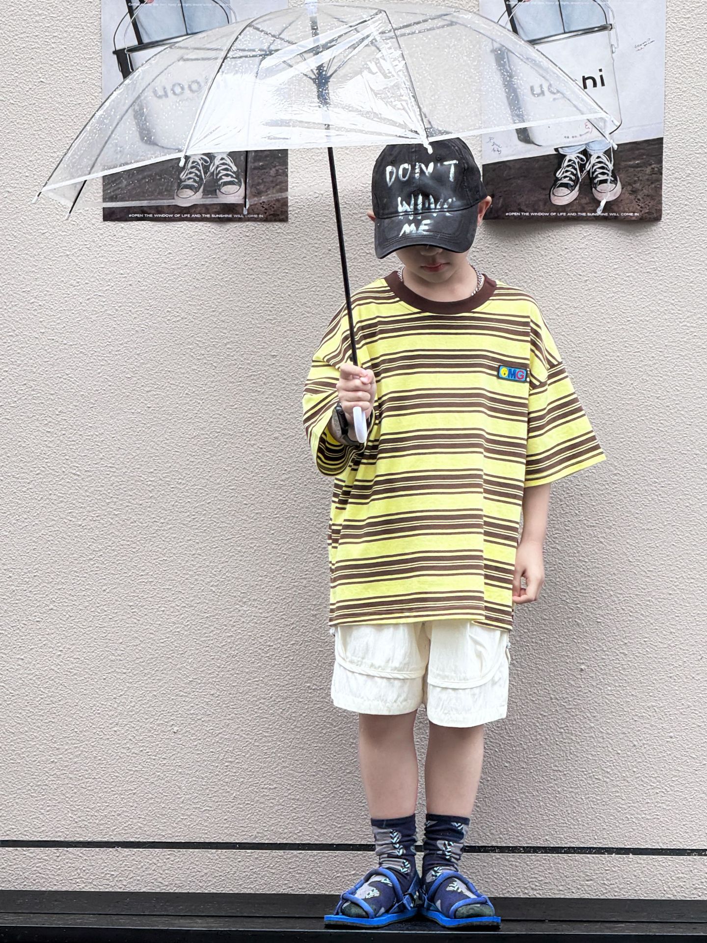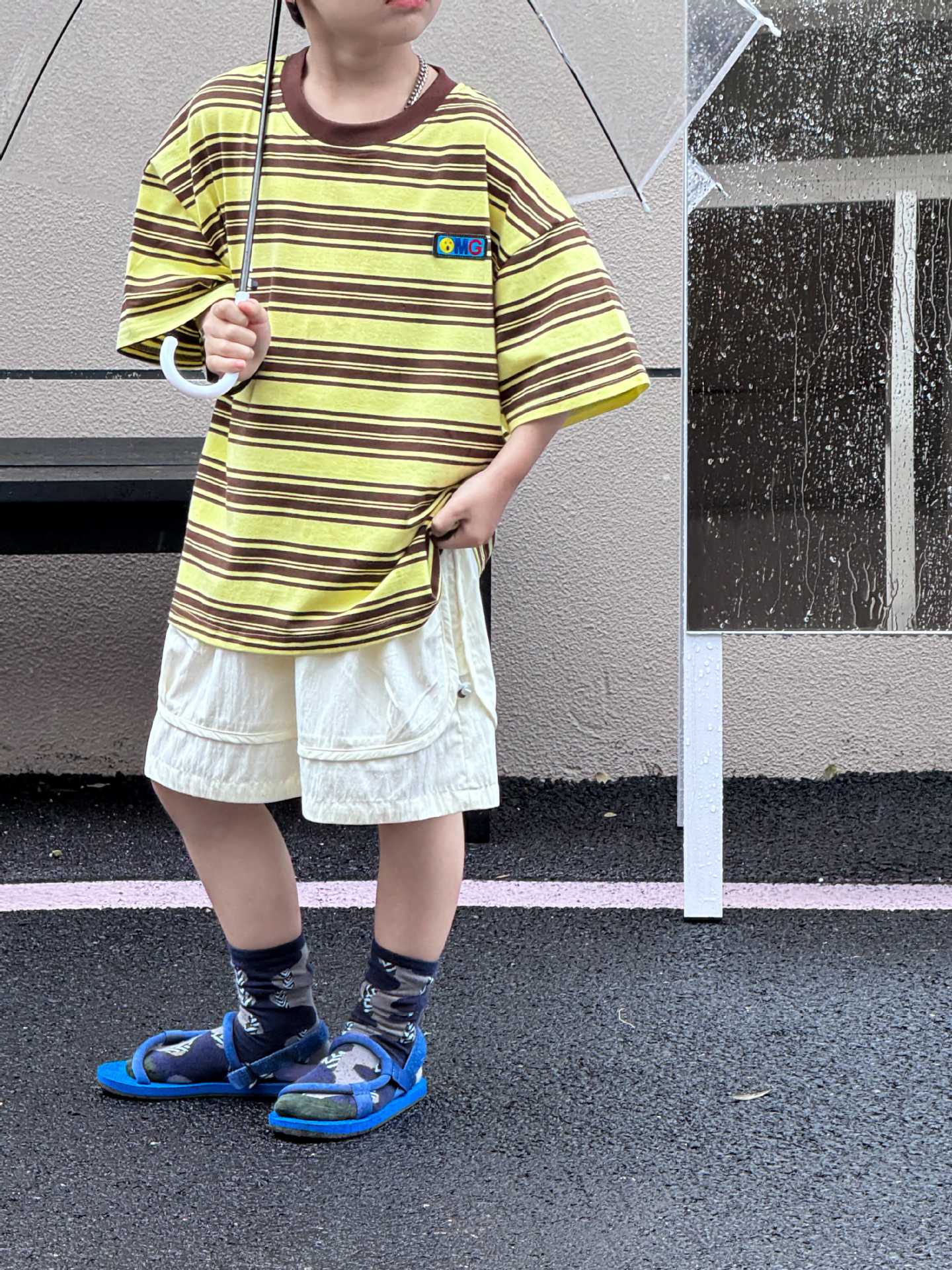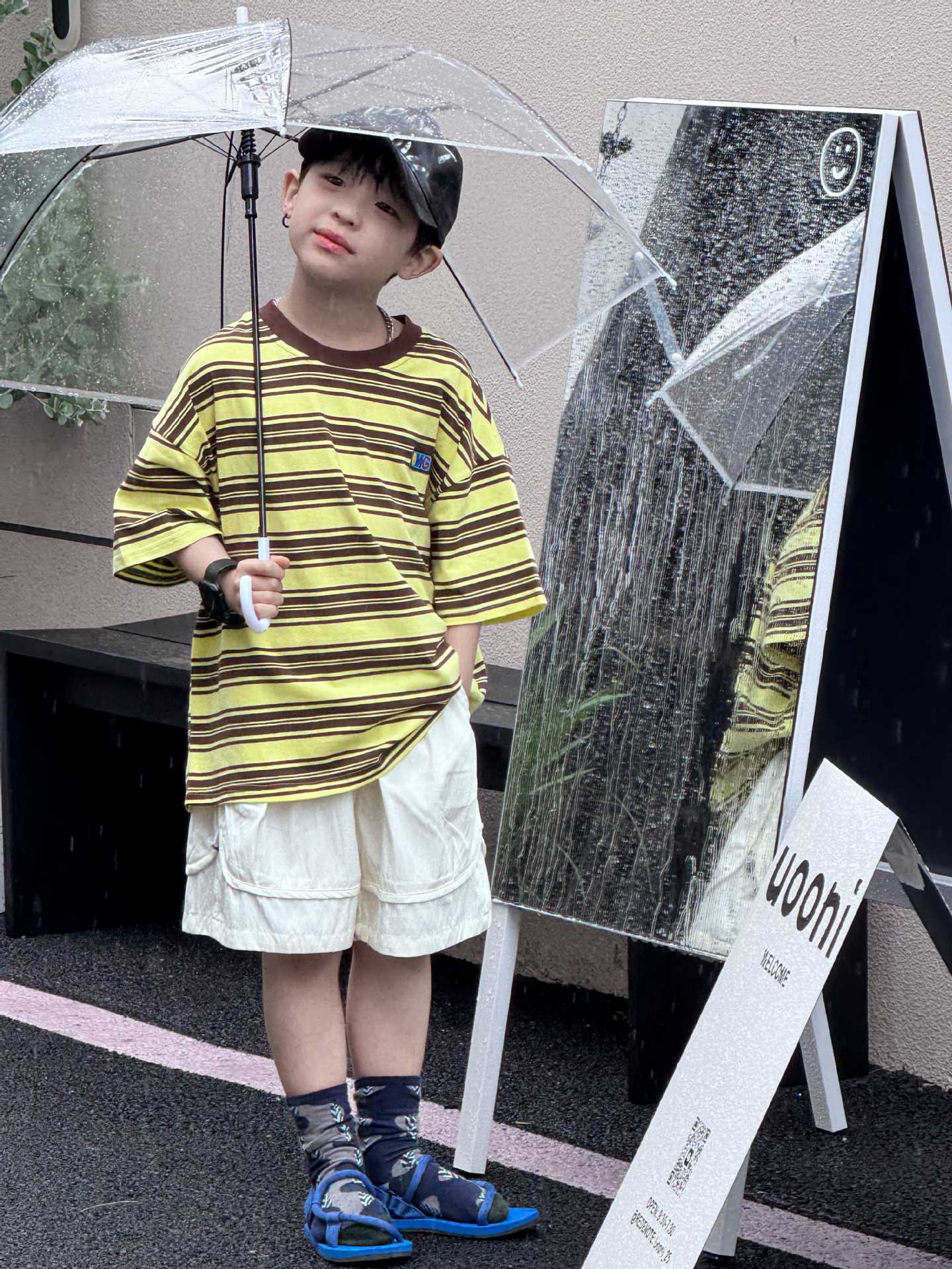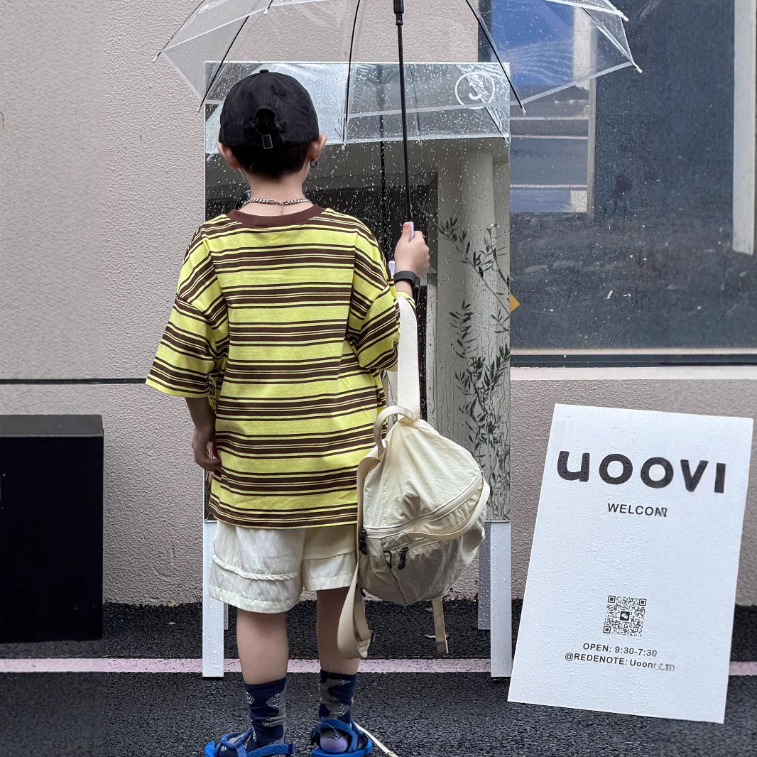 25 여름 한국 아동복 밝은 노란색 줄무늬 대비 컬러 코튼 라벨 크루 넥 반팔 티셔츠 탑스토어 가기