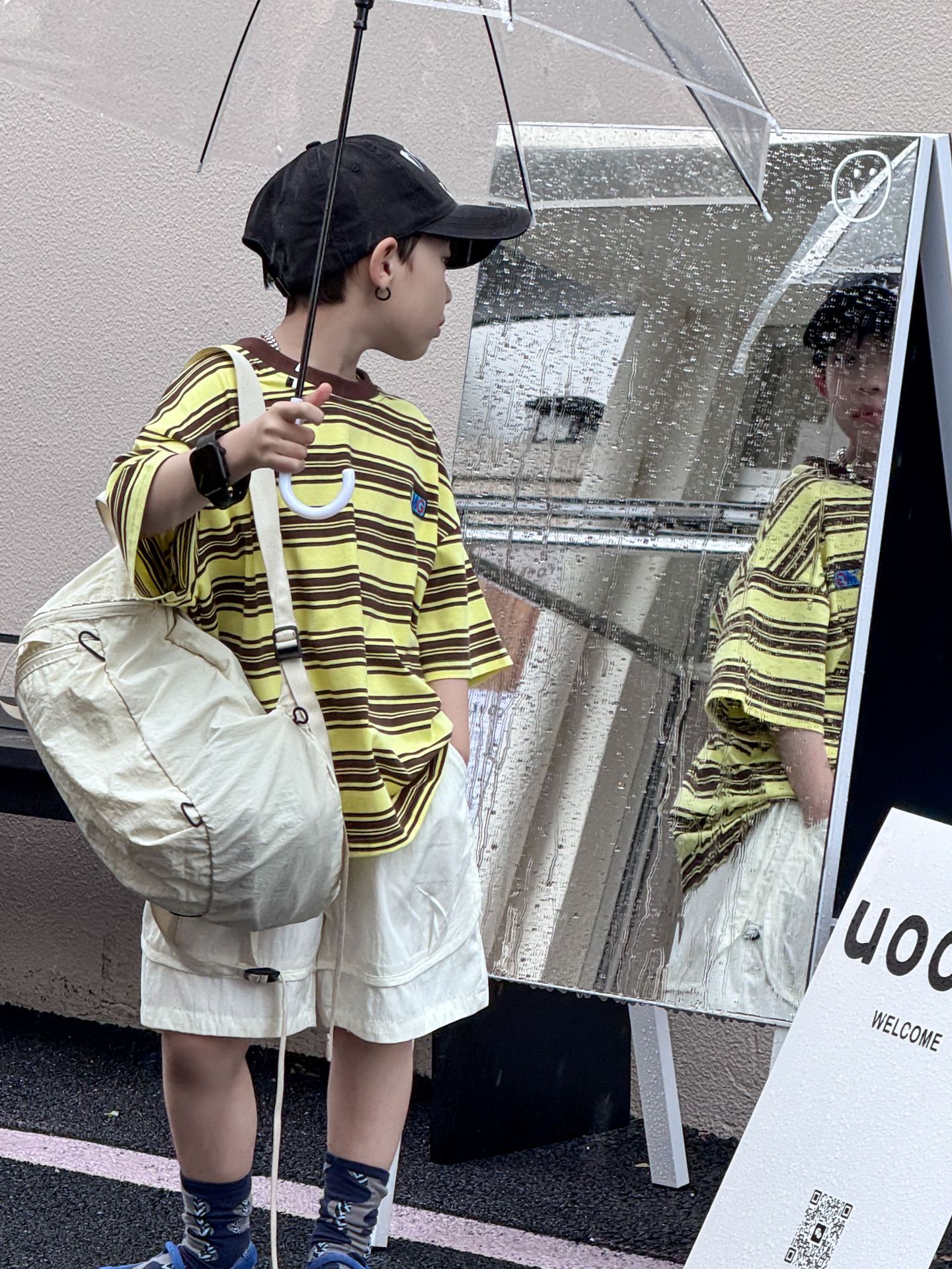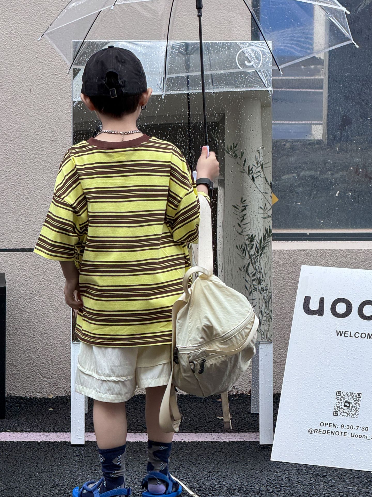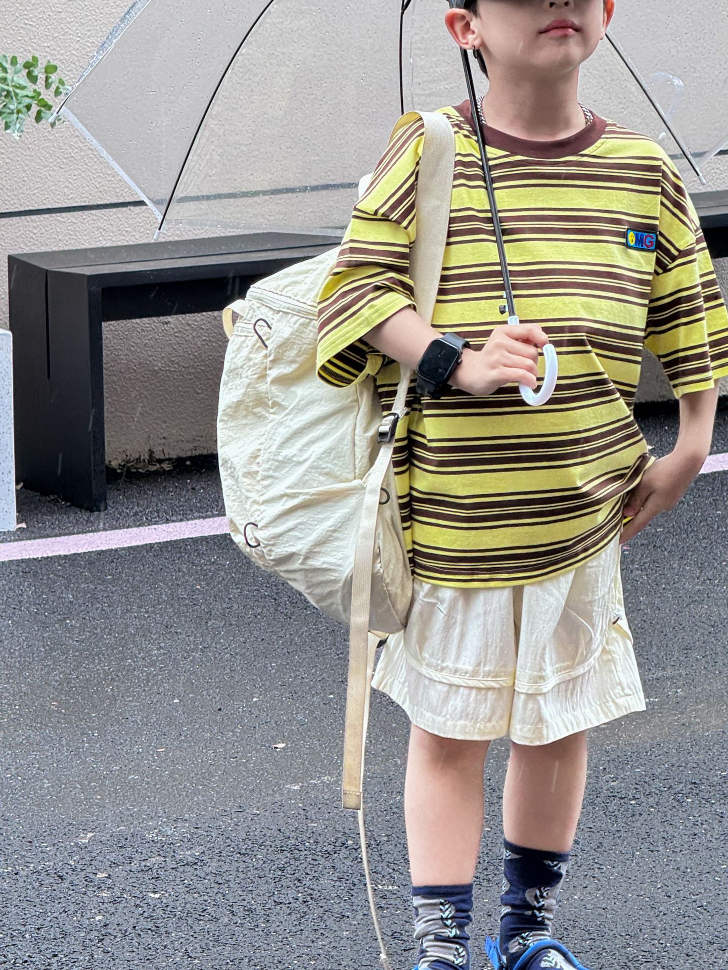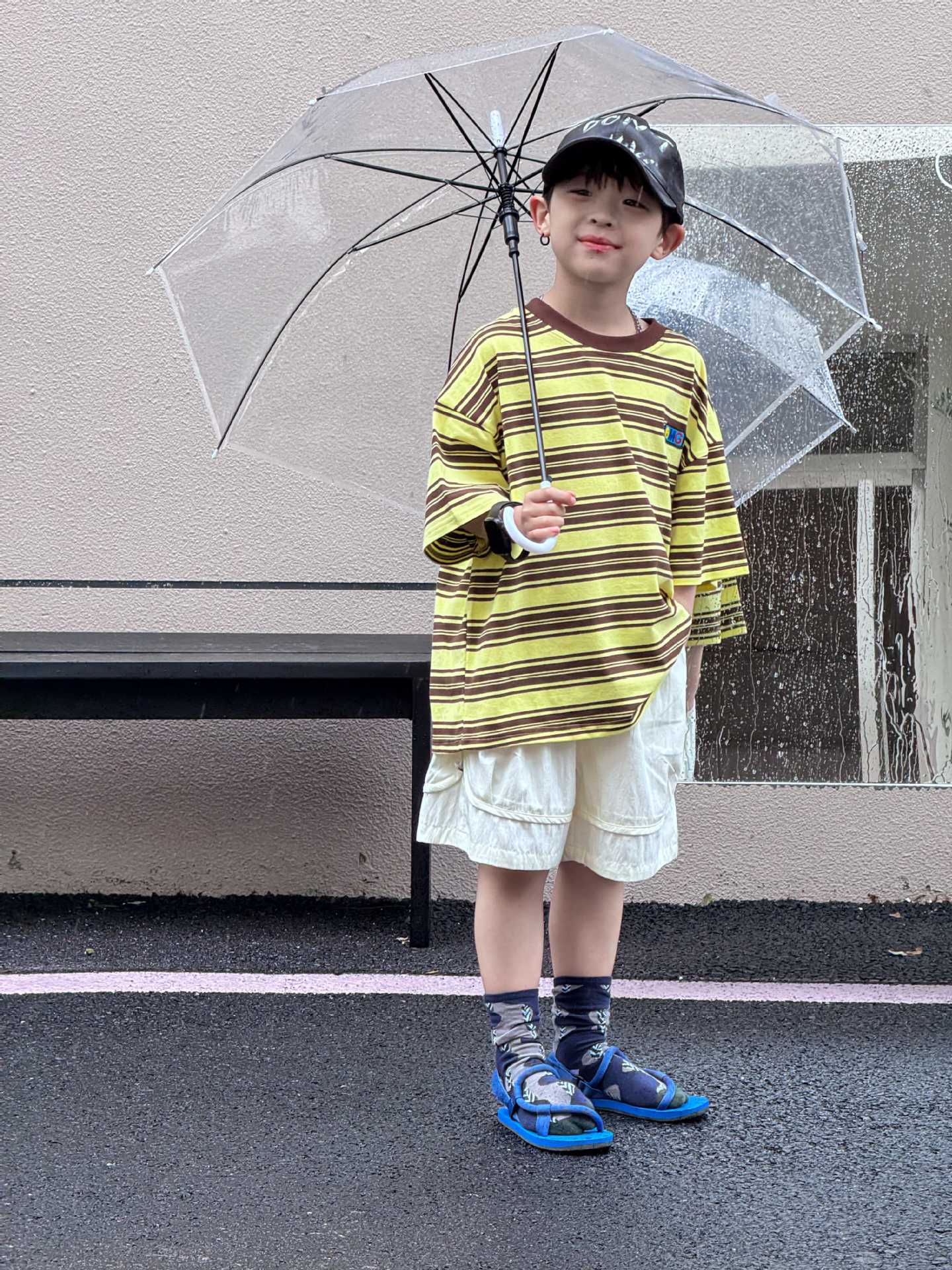 25 여름 한국 아동복 밝은 노란색 줄무늬 대비 컬러 코튼 라벨 크루 넥 반팔 티셔츠 탑스토어 가기