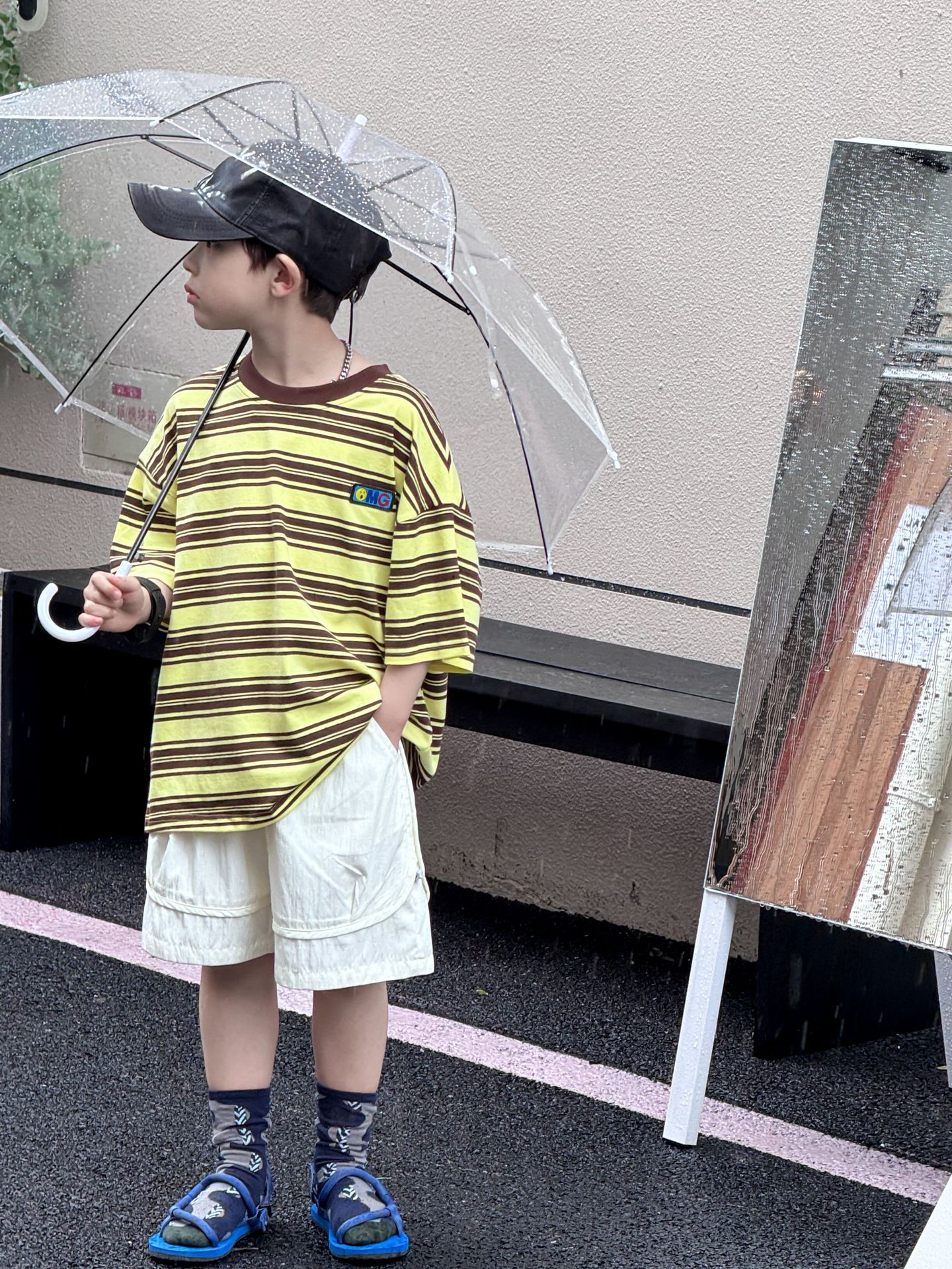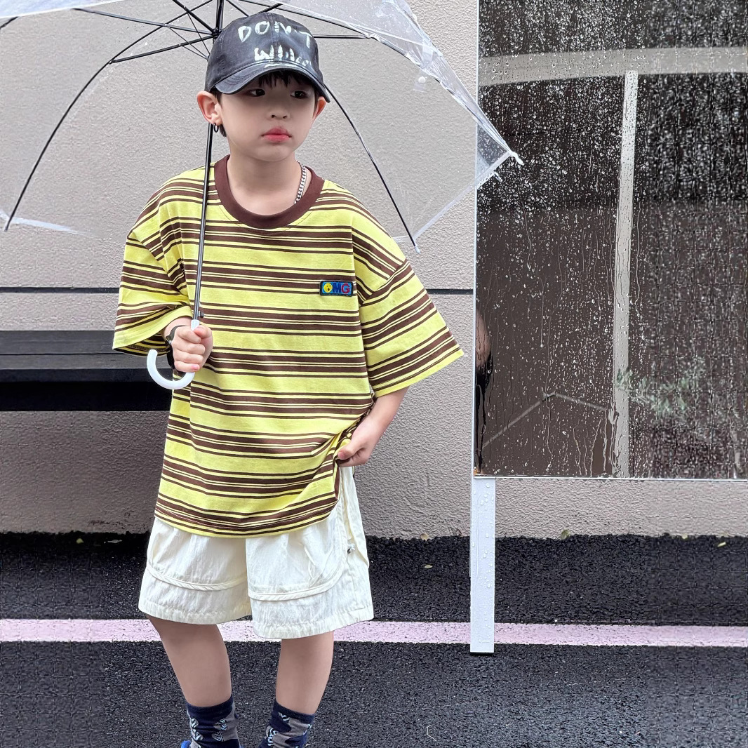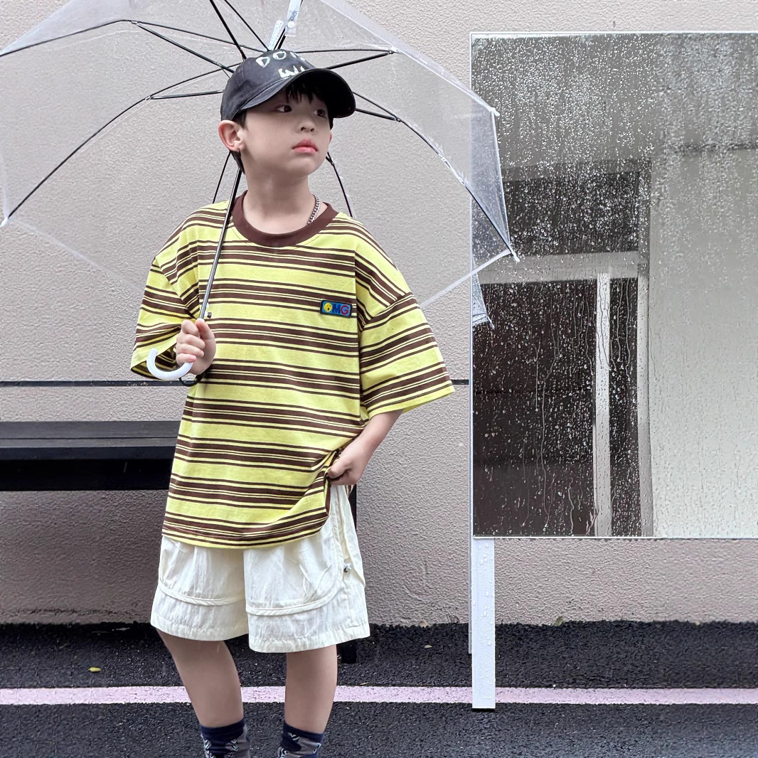 25 여름 한국 아동복 밝은 노란색 줄무늬 대비 컬러 코튼 라벨 크루 넥 반팔 티셔츠 탑