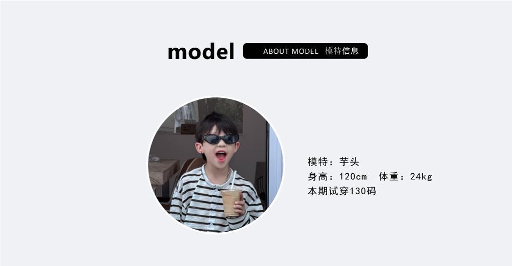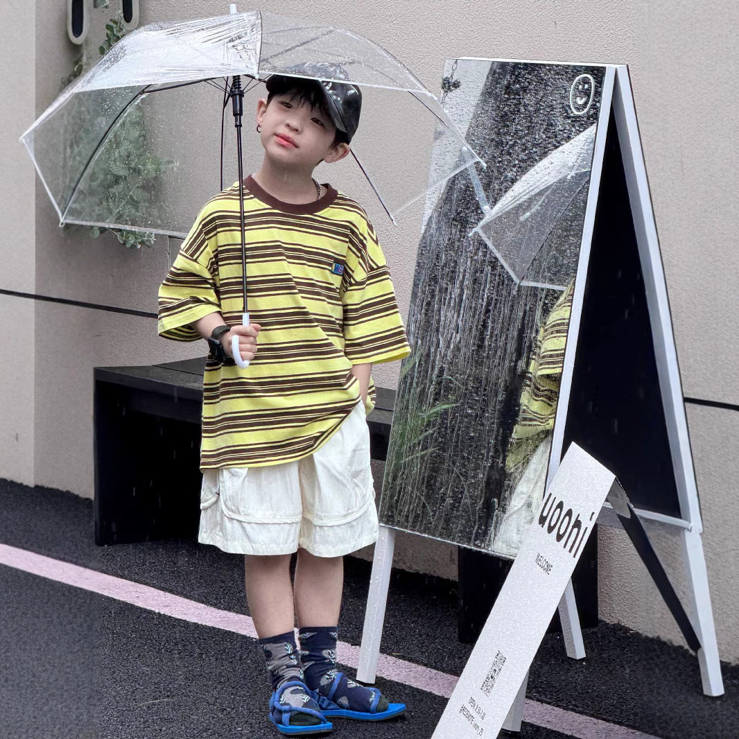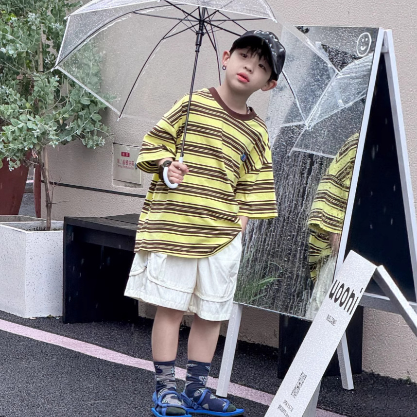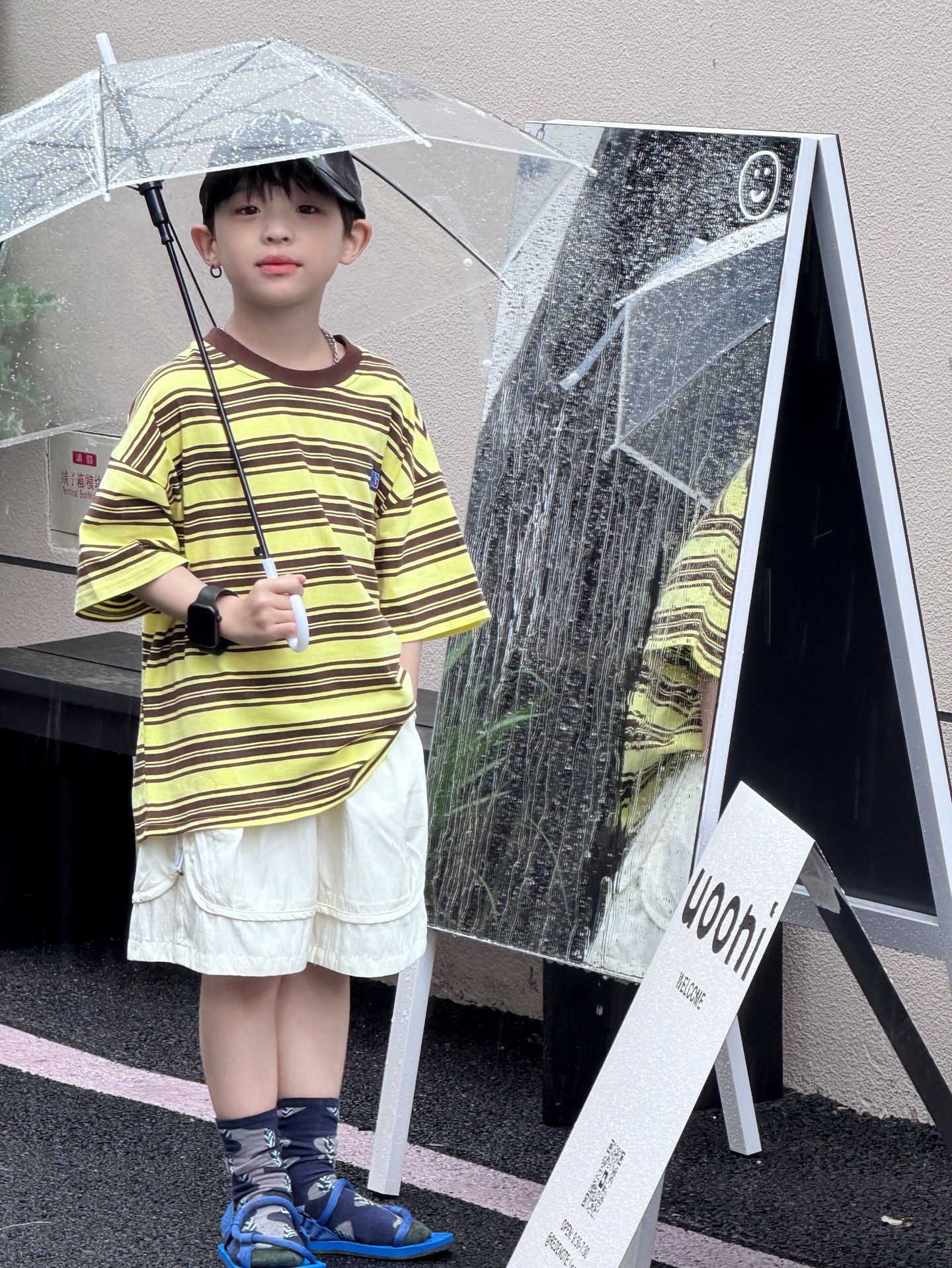 25 여름 한국 아동복 밝은 노란색 줄무늬 대비 컬러 코튼 라벨 크루 넥 반팔 티셔츠 탑