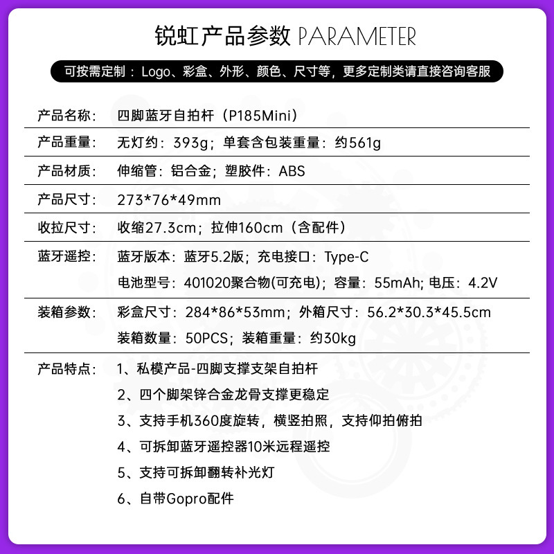P185MINI 알루미늄 합금 4피트 블루투스 셀카봉 360 ° 회전식 휴대용 PTZ 플로어 라이브 방송 스탠드스토어 가기