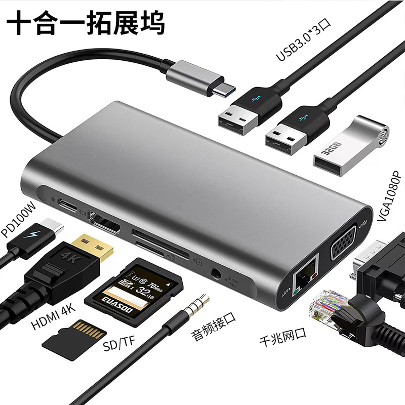 • 10-in-1 HDMI4K+VGA1080P+USB3.0*3+PD100W+SD/TF+오디오 인터페이스+기가비트 네트워크 포트