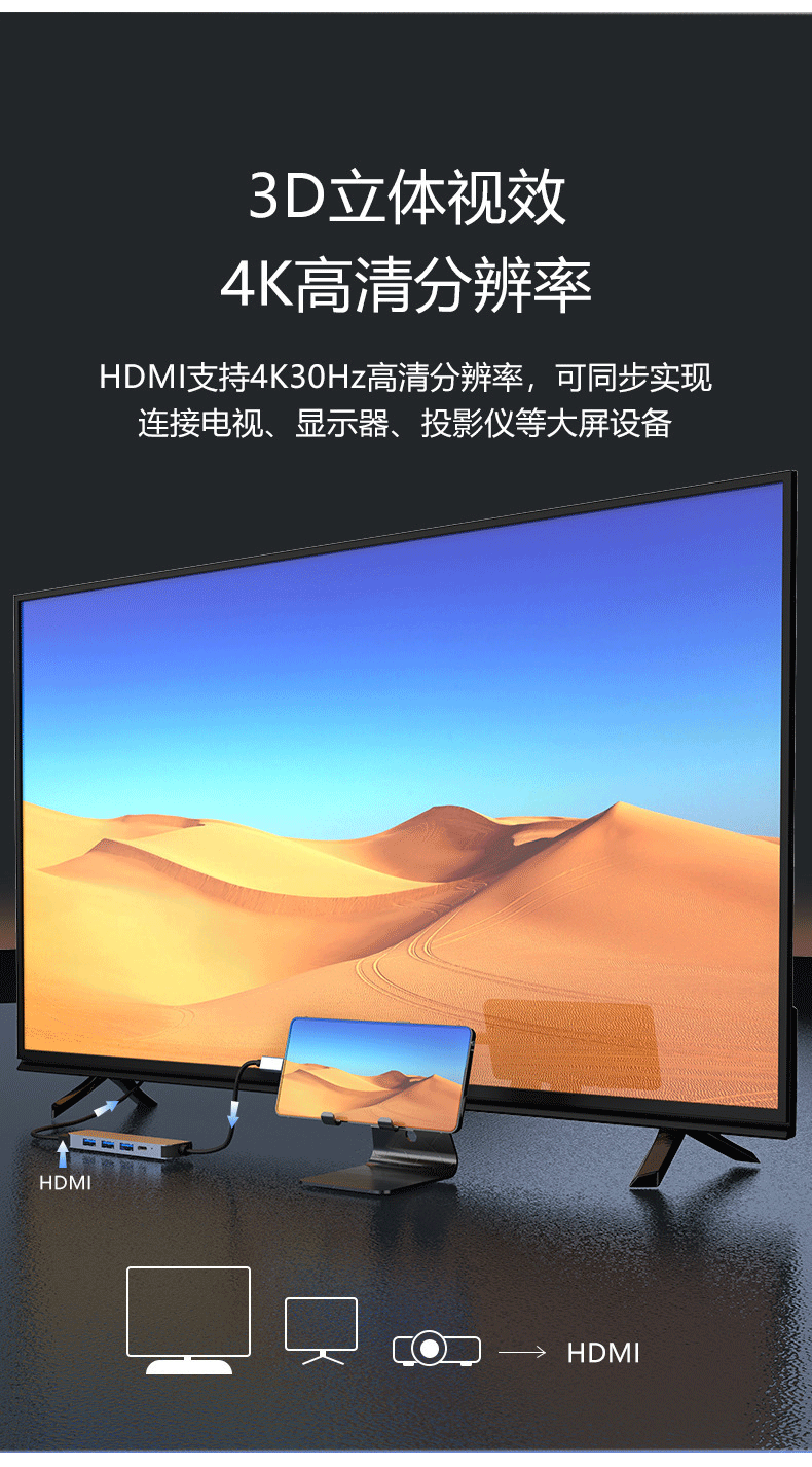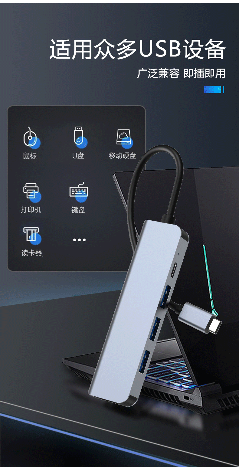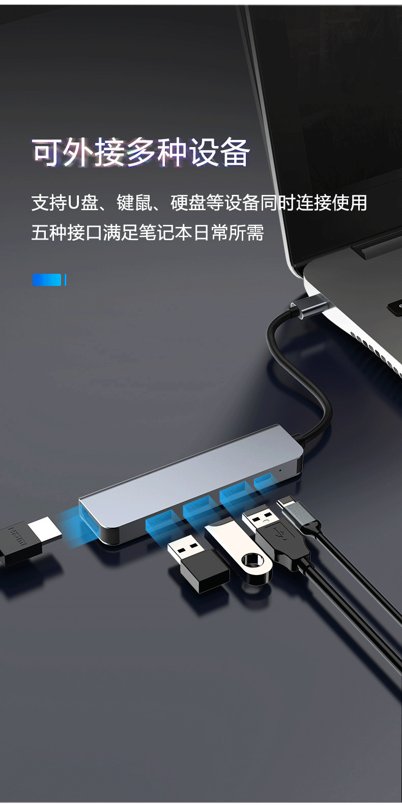 • 5-in-1 HDMI4k+USB3.0+USB2.0+SD/TF