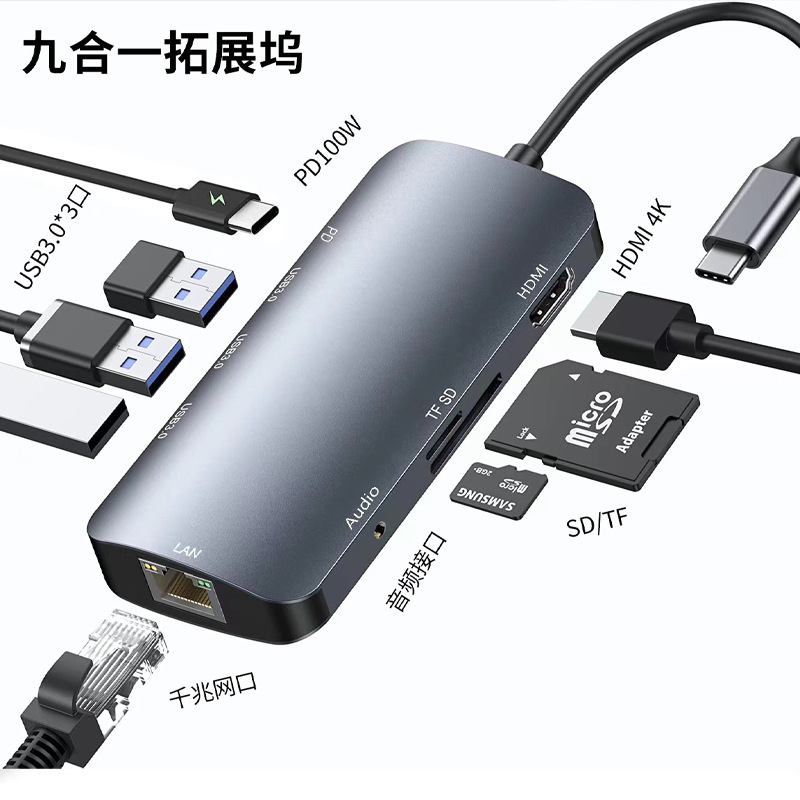 • 9-in-1 HDMI4K+USB3.0*3 포트+PD100W+SD/TF+오디오 인터페이스+기가비트 이더넷 포트