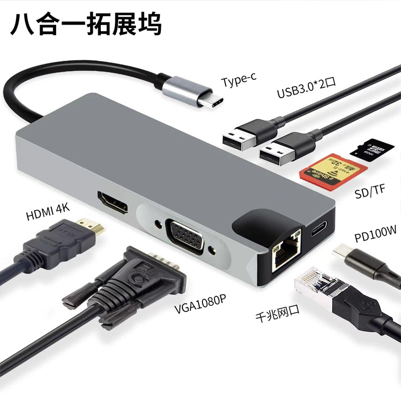 • 8-in-1 HDMI4K+VGA1080P+USB3.0*2+PD100W+SD/TF+기가비트 네트워크 포트