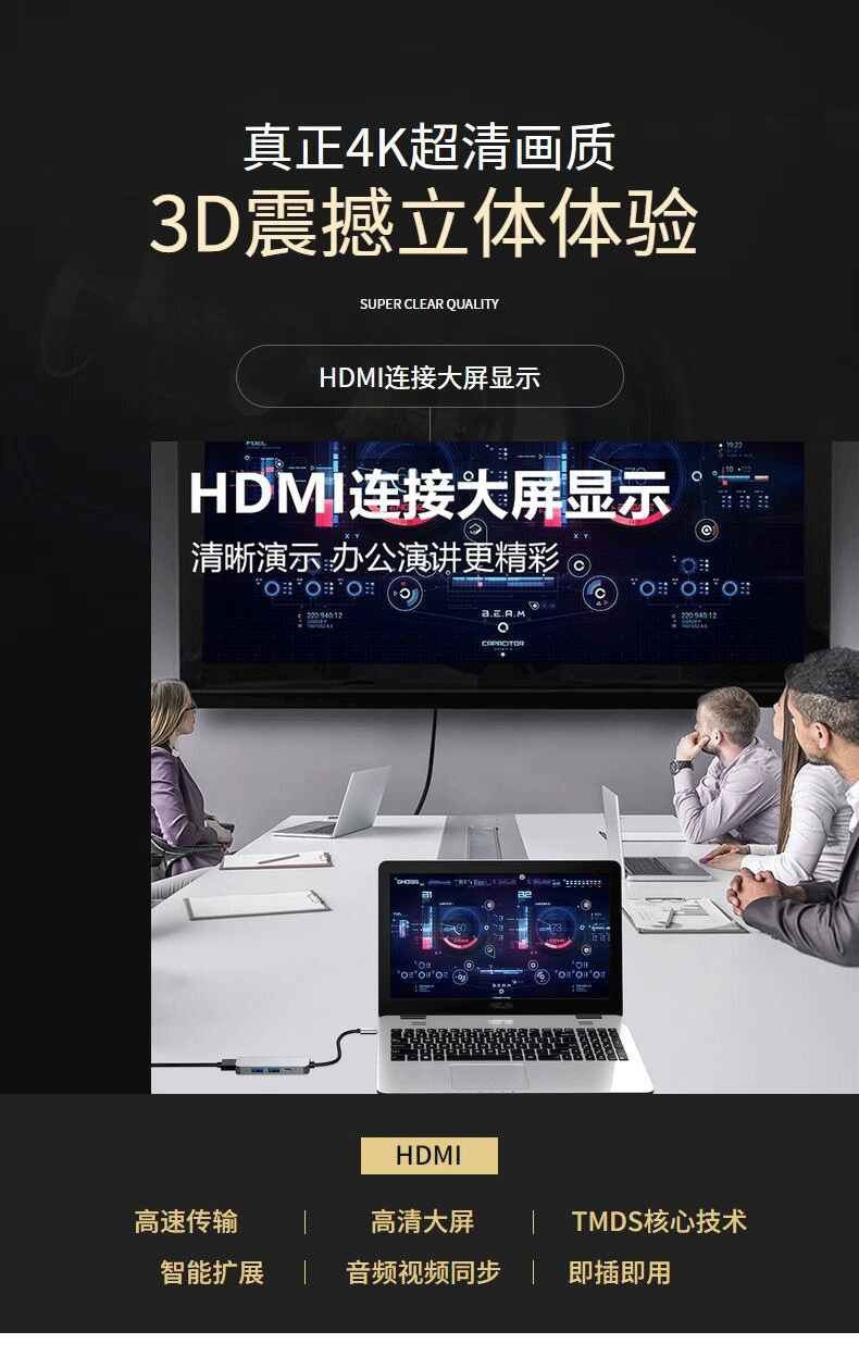 • 7-in-1 HDMI4k+USB3.0+USB2.0+PD100W+Typec+SD/TF