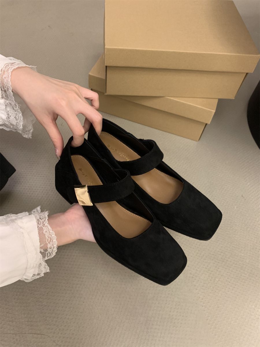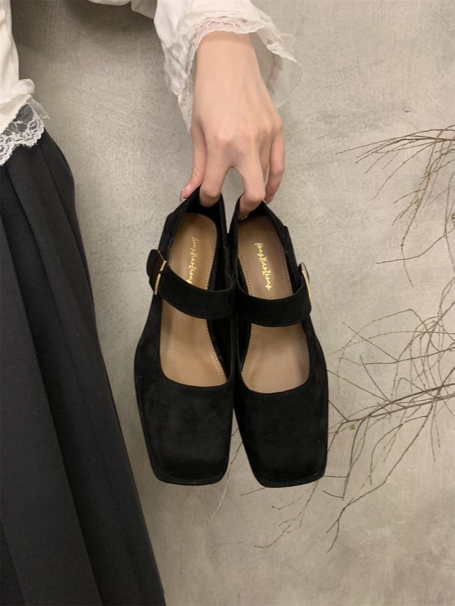 여성을 위한 우아한 스퀘어 토 펌프스 스웨이드 원 스트랩 메리 제인 슈즈 2025 새로운 소프트 솔 두꺼운 힐 요정 하이힐