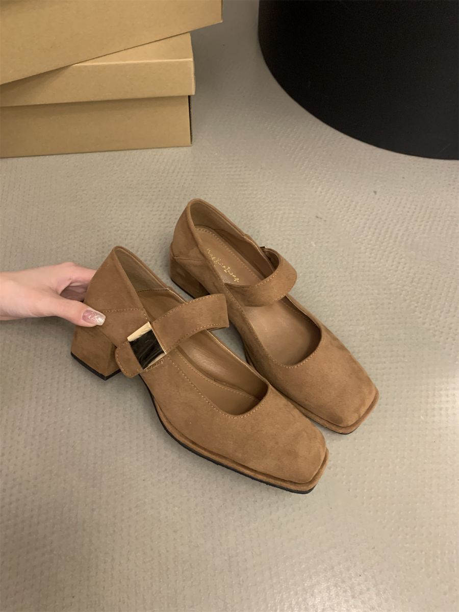 여성을 위한 우아한 스퀘어 토 펌프스 스웨이드 원 스트랩 메리 제인 슈즈 2025 새로운 소프트 솔 두꺼운 힐 요정 하이힐스토어 가기