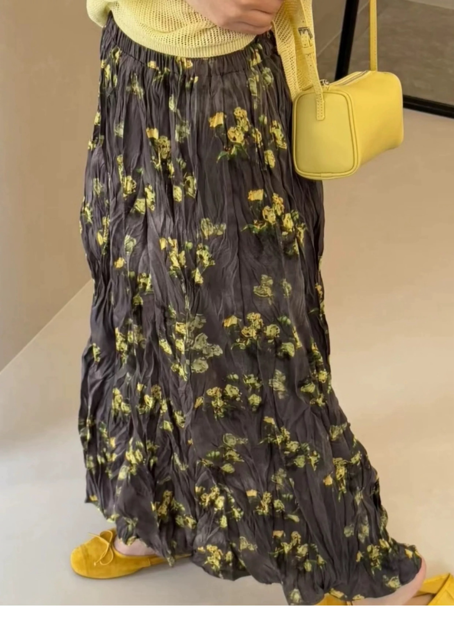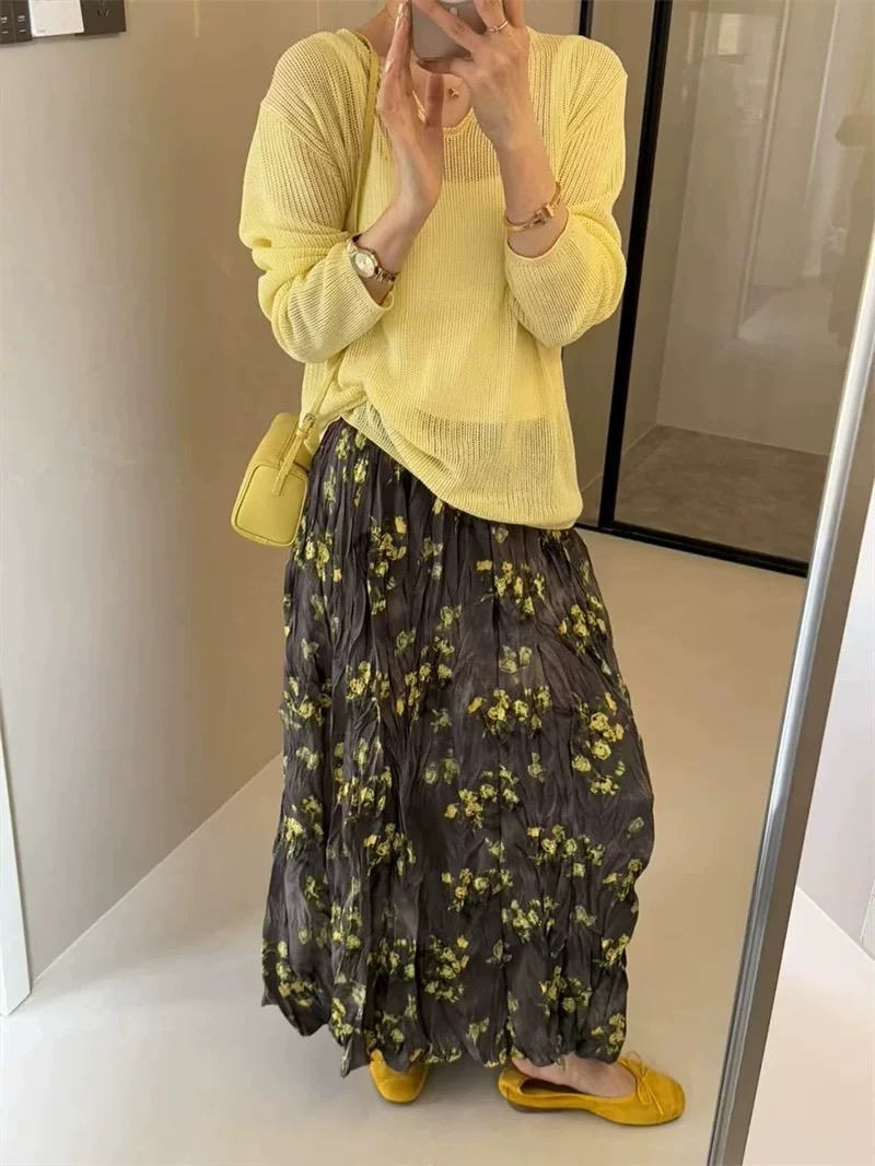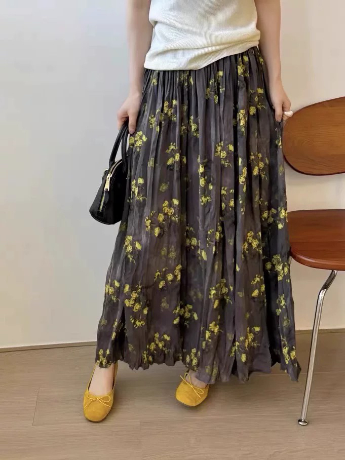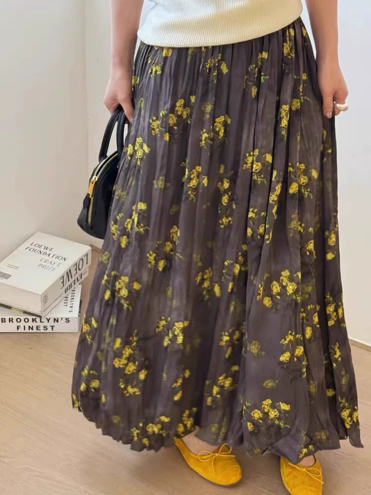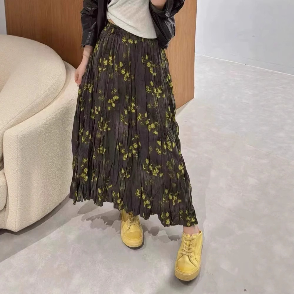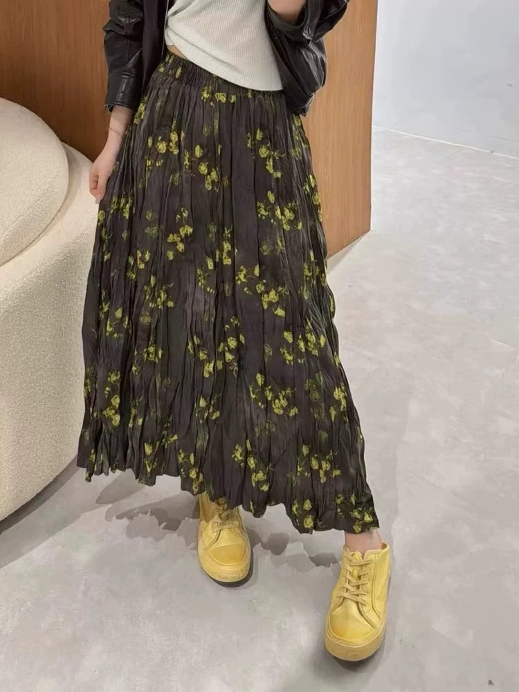 프랑스 스타일 빈티지 꽃 스커트 여성의 봄과 여름 중간 길이의 엘라 스토 허리 슬리밍 대형 스윙 주름 A-라인 스커트