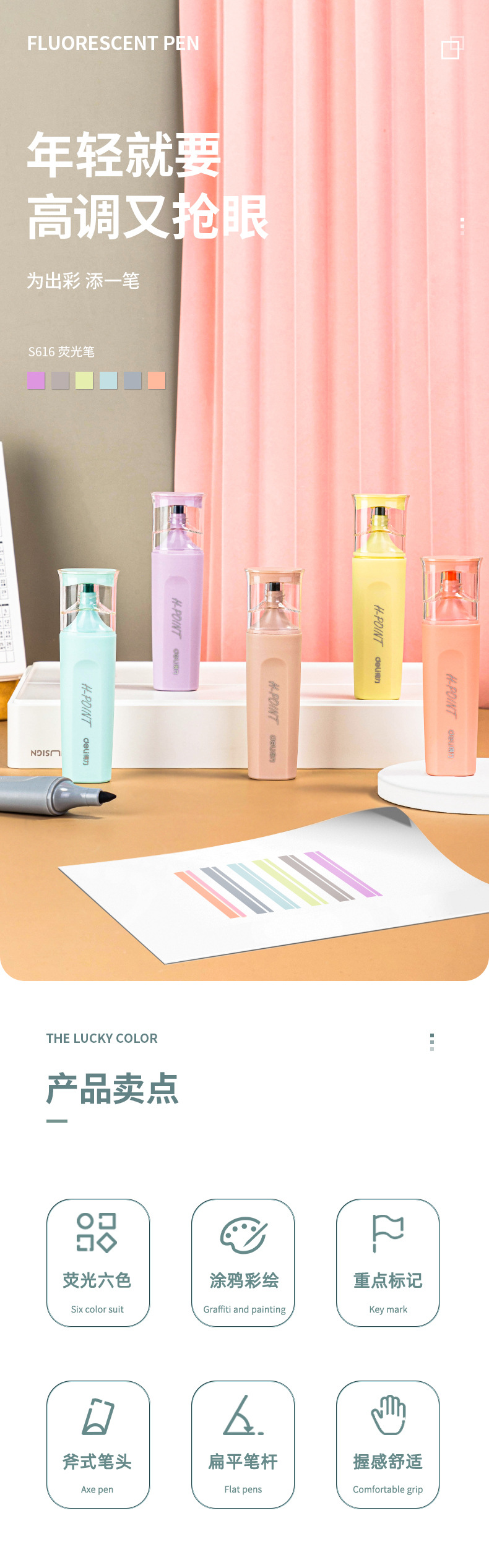 델리 S616 미스트 플랫 로드 소프트 컬러 6색 형광펜 학생 시험 키 마커 펜 핸드북 페인트스토어 가기