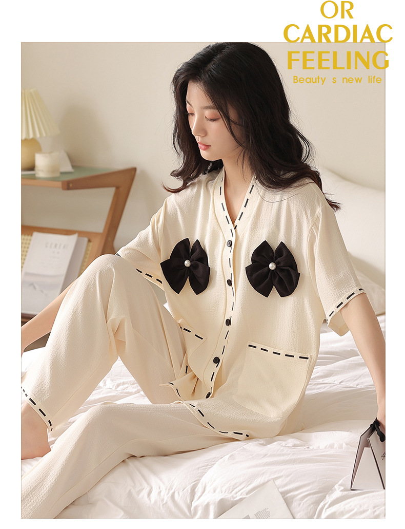 공주 스타일 여름 가장자리 짠 퍼프 코튼 파자마 여성의 봄과 여름 패션 캐주얼 반팔 바지 세트 얇은 홈 옷