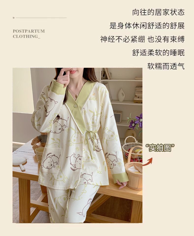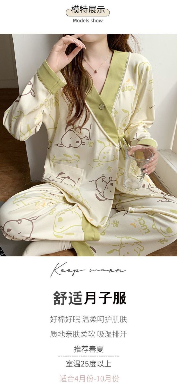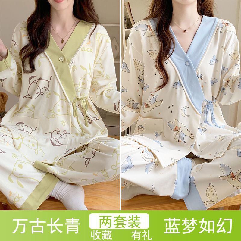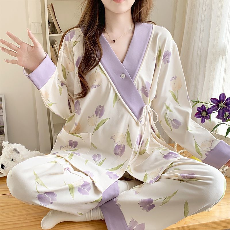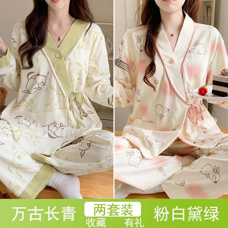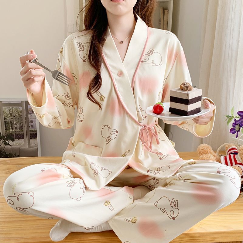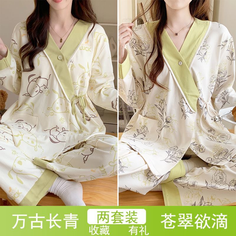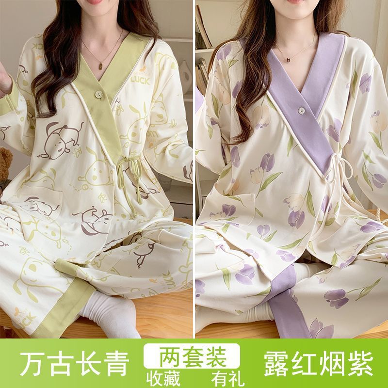 기모노 봄과 여름 얇은 땀 흡수 문 의류 임산부 잠옷 조정 가능한 허리 산후 모유 수유 세트