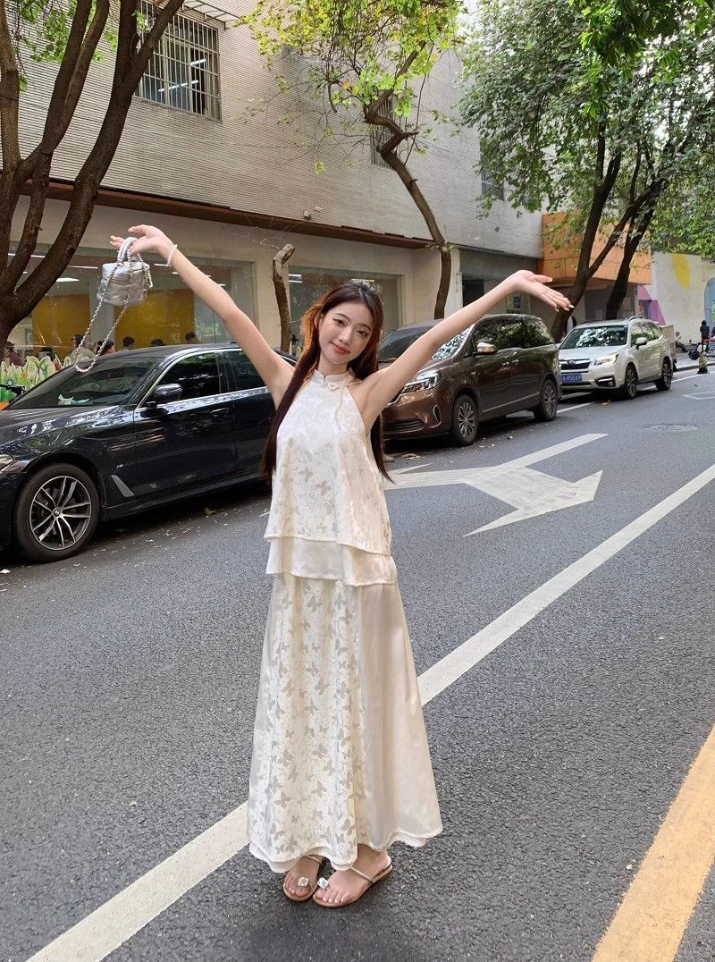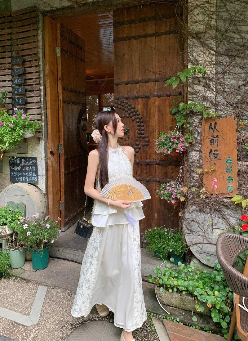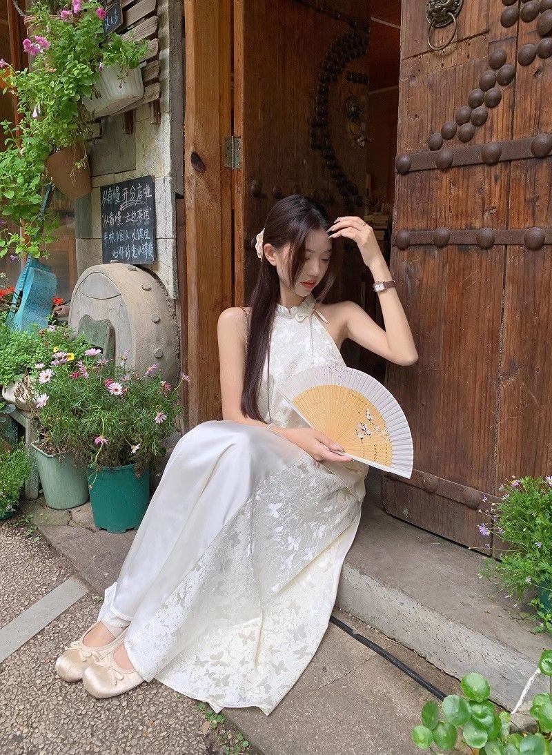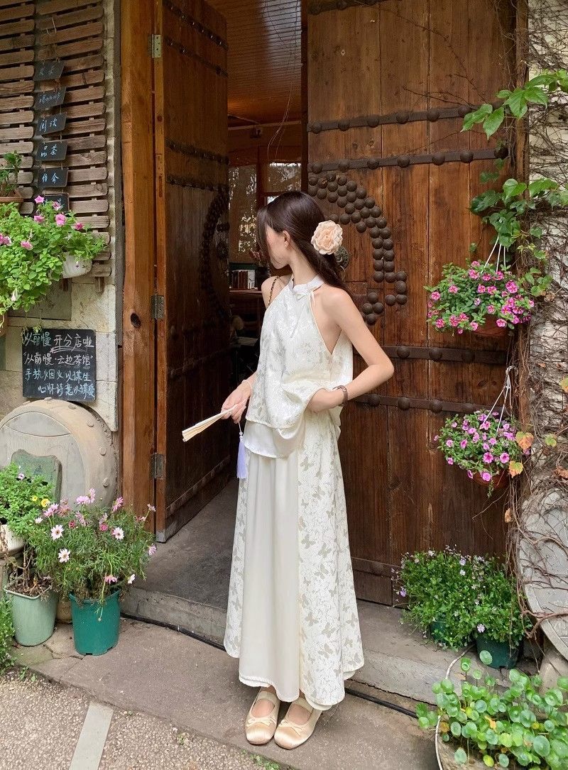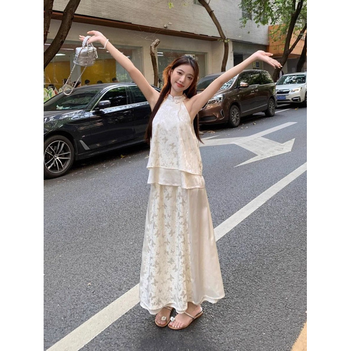 여름 여성을 위한 새로운 중국 스타일의 중국식 치파오, 시원한 느낌의 선명한 의상, 홀터넥 탑과 하프 스커트 세트