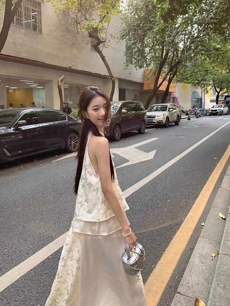 여름 여성을 위한 새로운 중국 스타일의 중국식 치파오, 시원한 느낌의 선명한 의상, 홀터넥 탑과 하프 스커트 세트스토어 가기