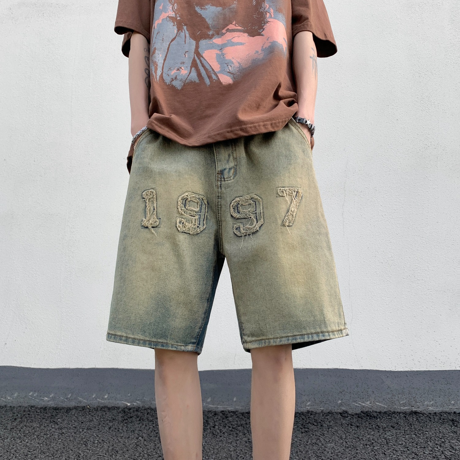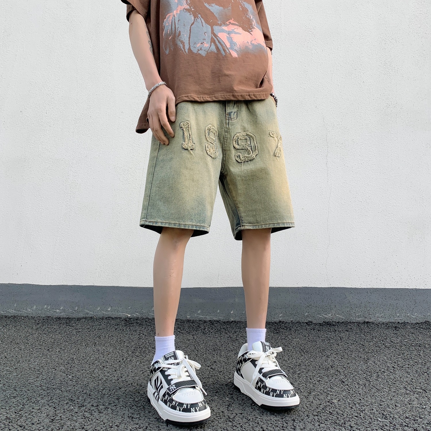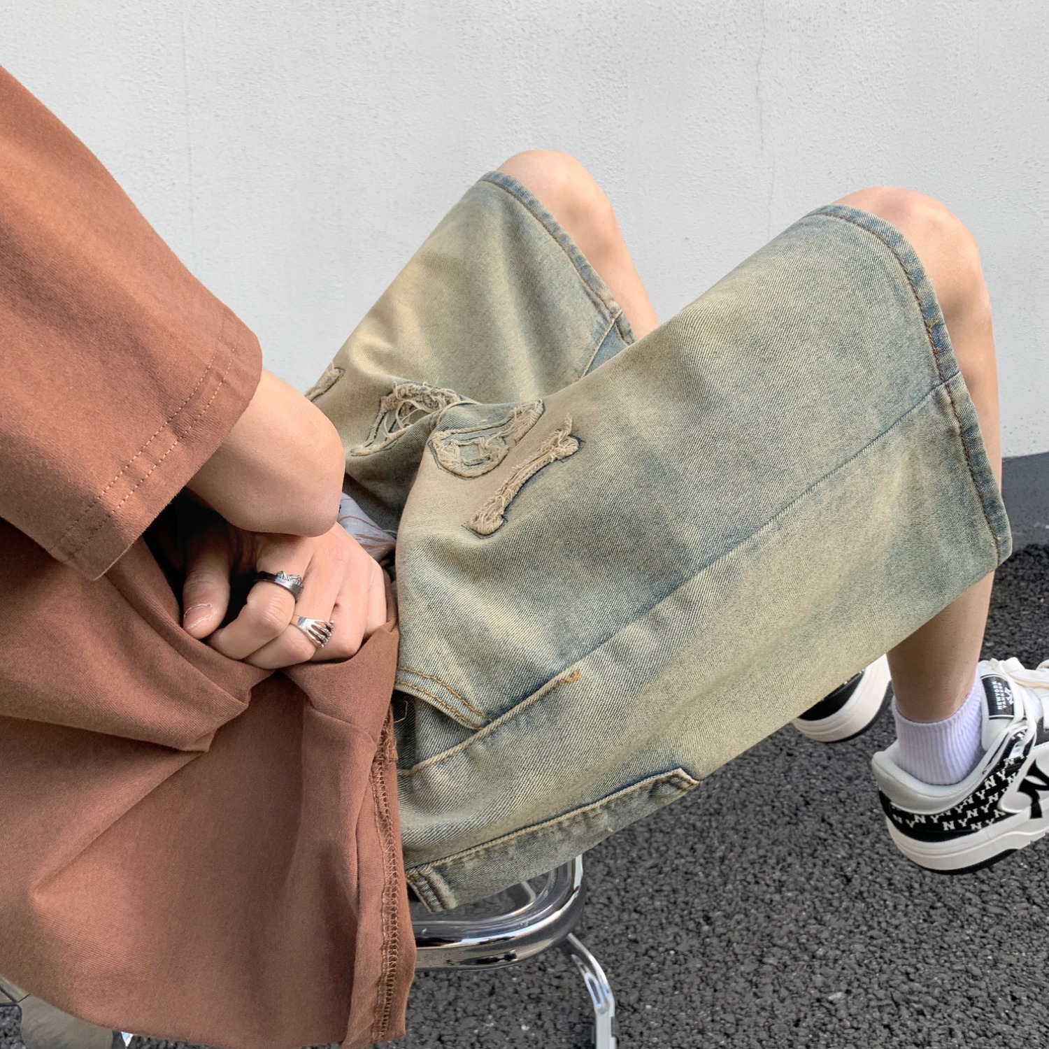 여름 루즈 워싱 디스트레스드 데님 반바지 남성용 와이드 레그 스트레이트 5부 팬츠 아메리칸 하이 스트리트 트렌디 브랜드 핸섬 팬츠
