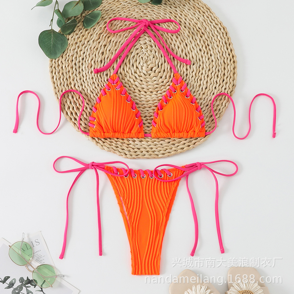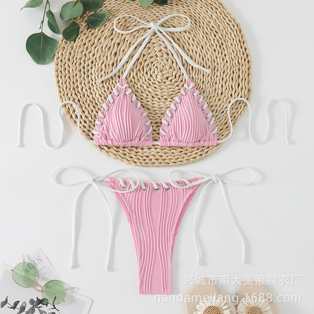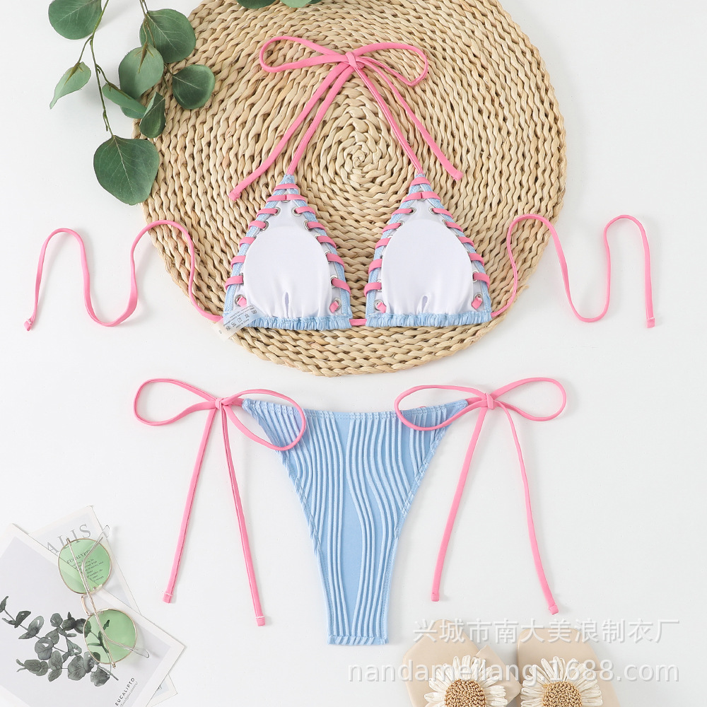 2025 유럽과 미국의 새로운 스타일 홀터넥 넥 타이 스트라이프 자카드 블랙 아이 로프 섹시한 비키니 여성 수영복 유럽과 미국스토어 가기