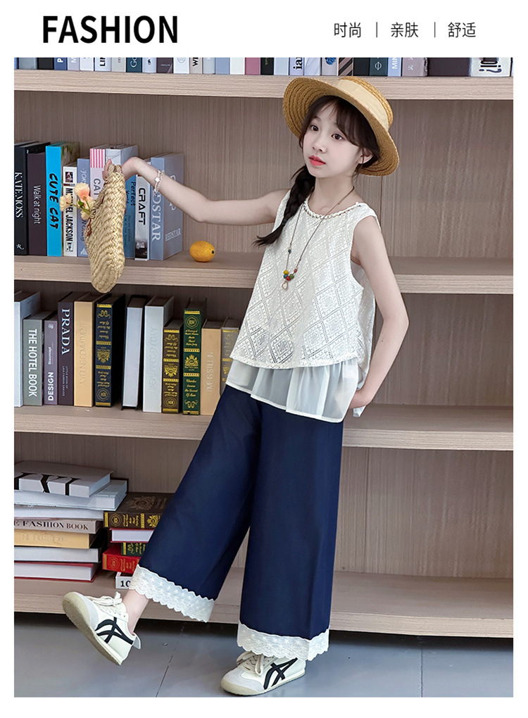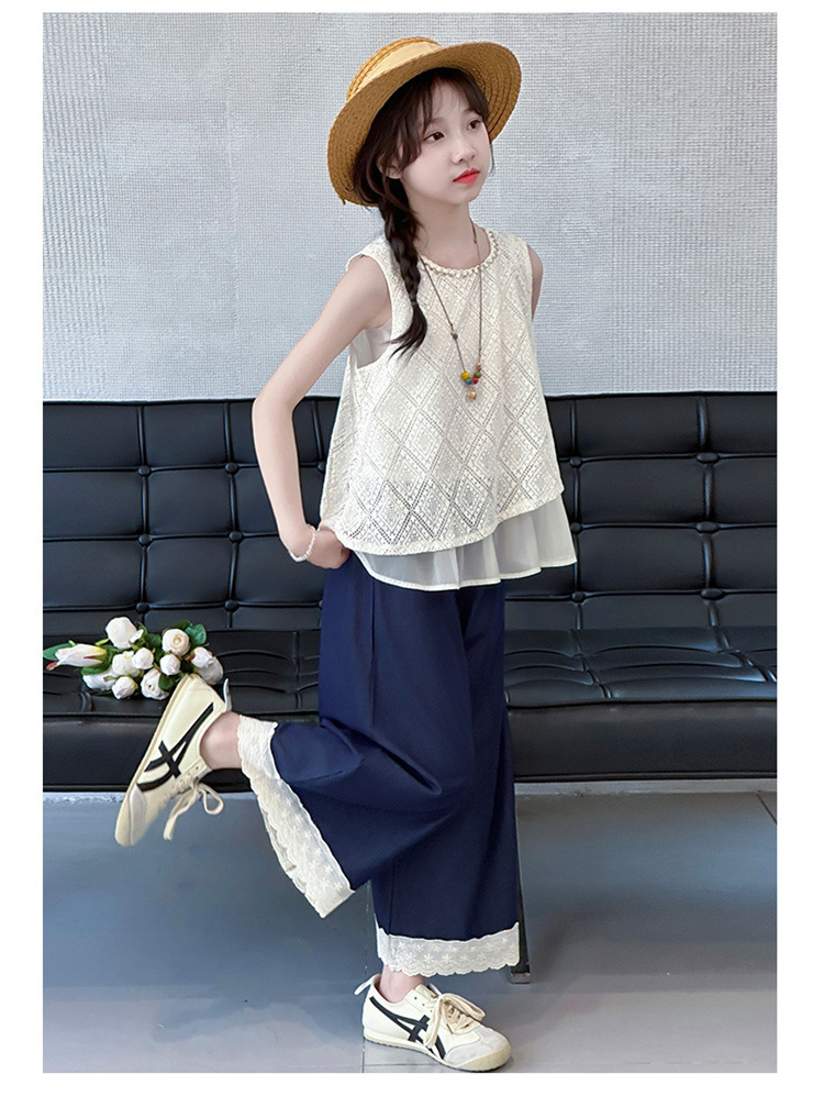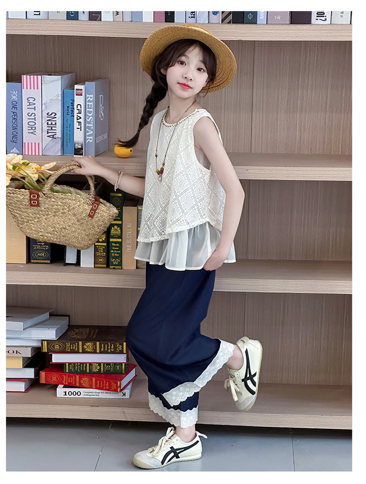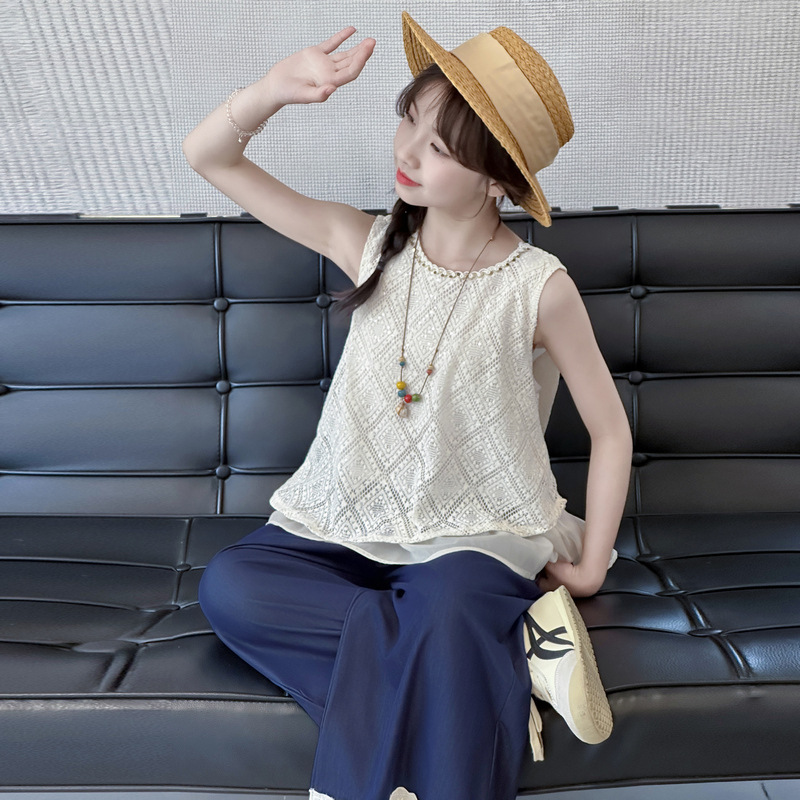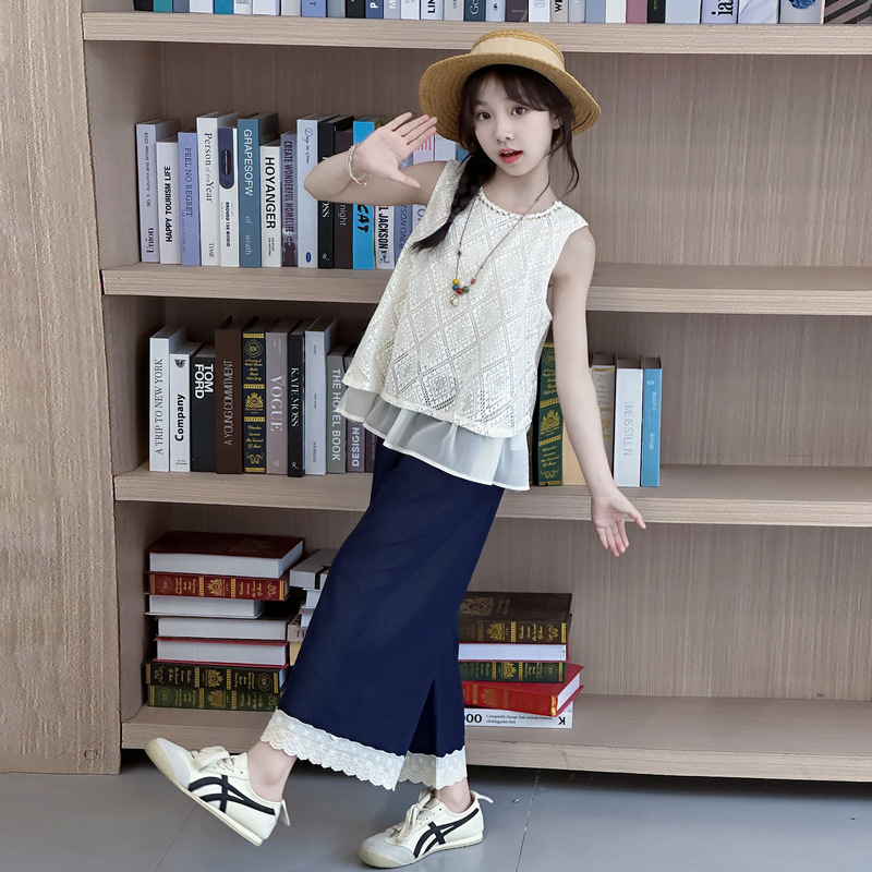소녀 세트 2025 년 여름 새로운 어린이 민소매 인형 셔츠 큰 어린이 레이스 데님 넓은 다리 바지 투피스 세트