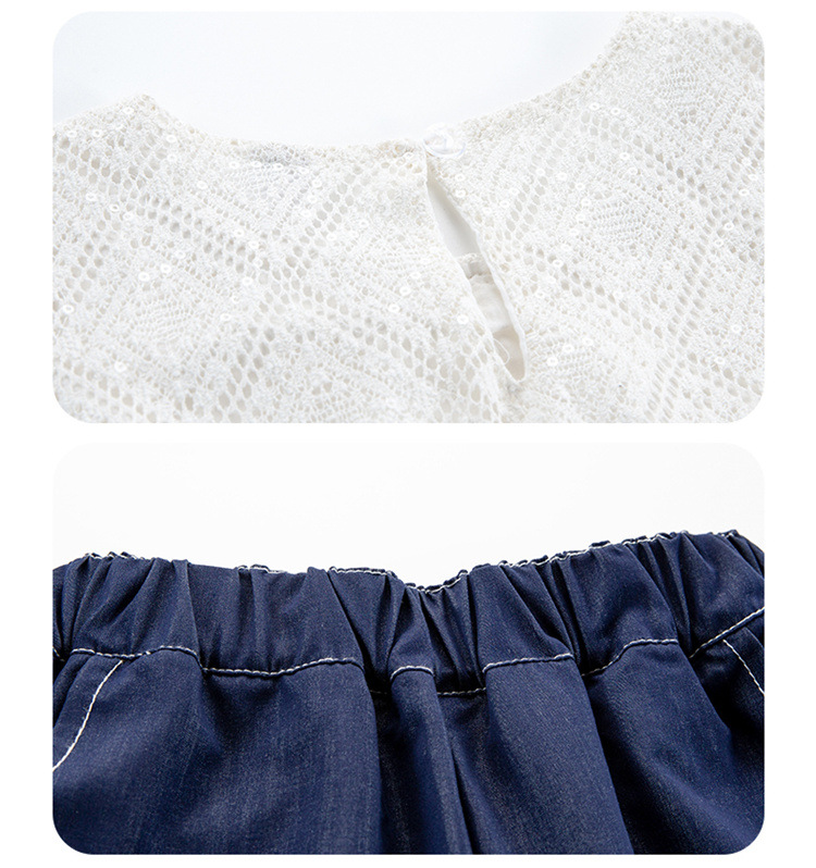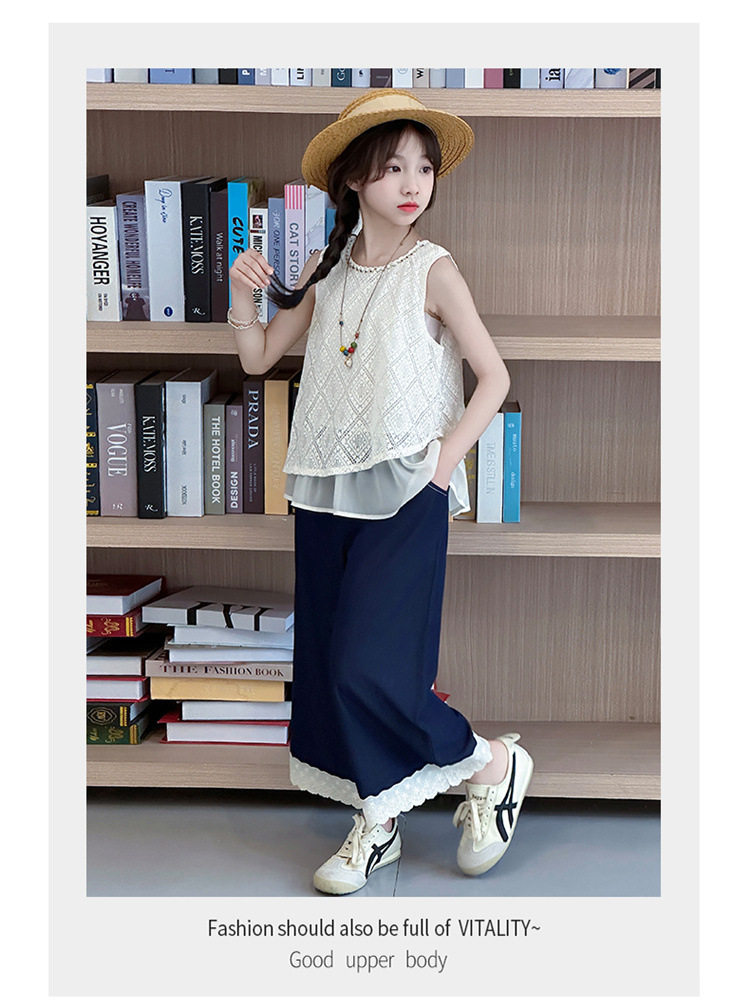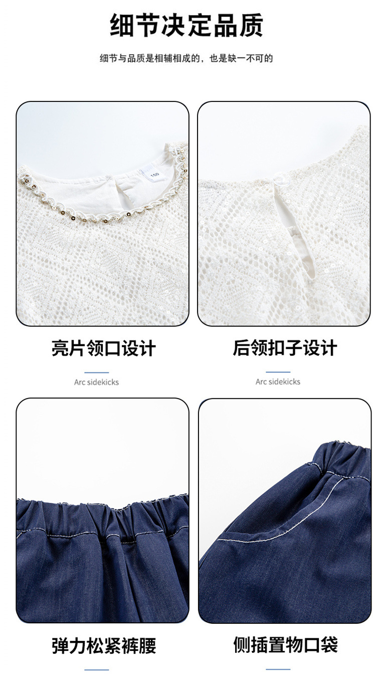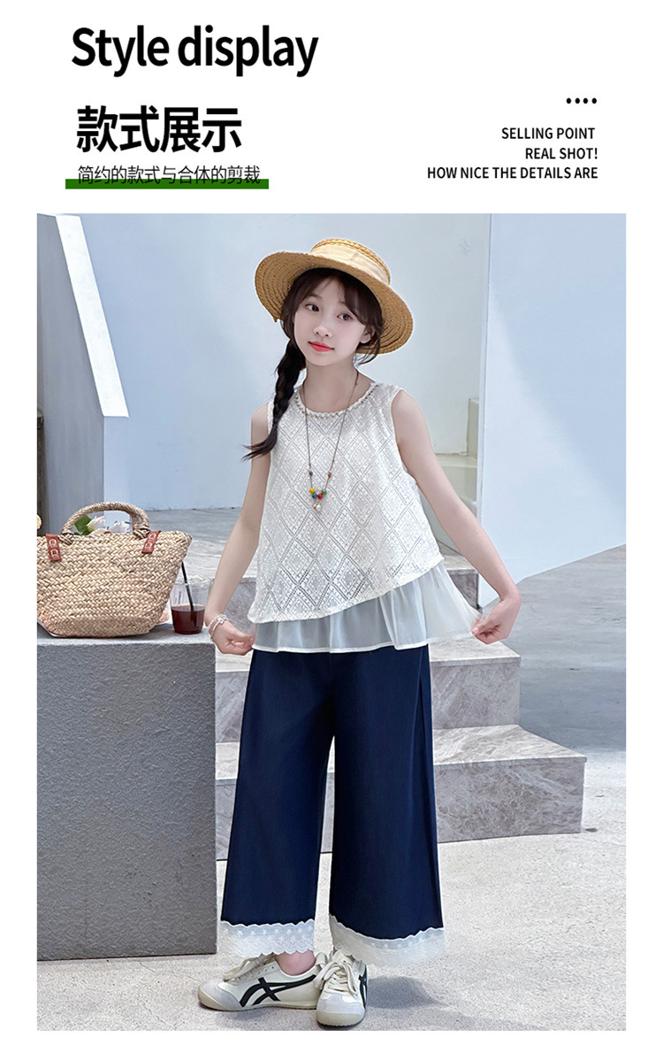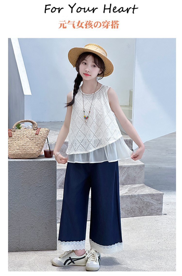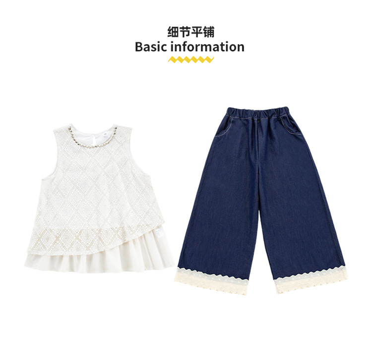 소녀 세트 2025 년 여름 새로운 어린이 민소매 인형 셔츠 큰 어린이 레이스 데님 넓은 다리 바지 투피스 세트스토어 가기