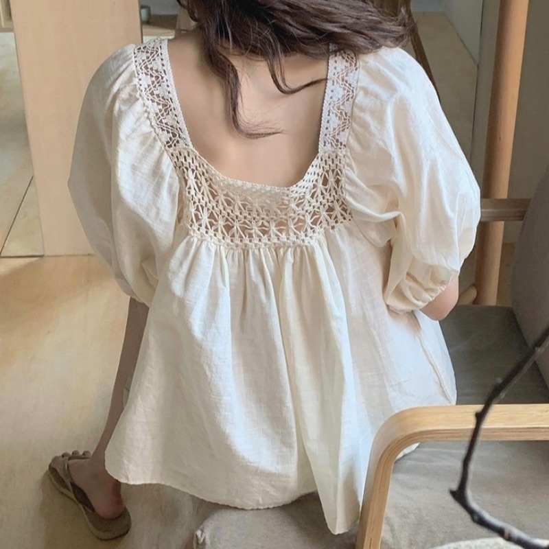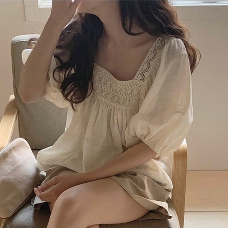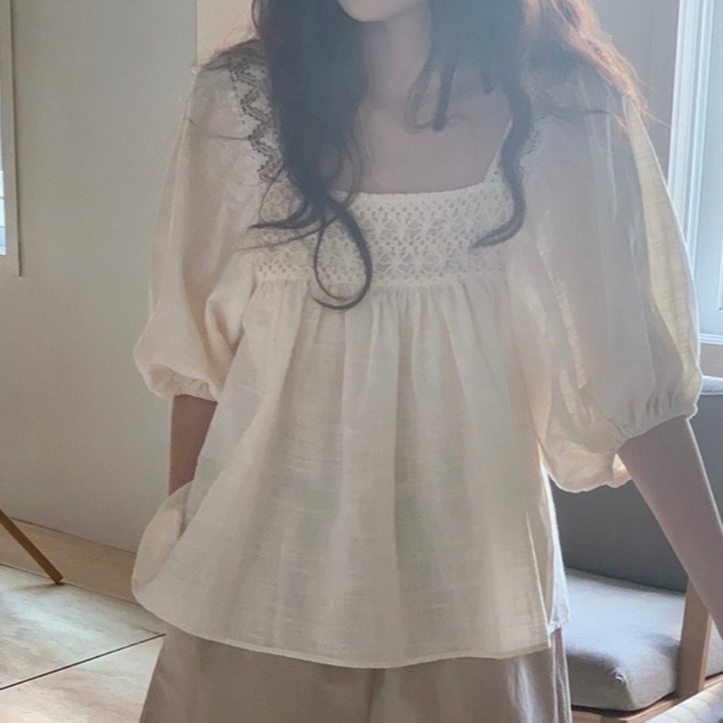 여성용 프렌치 스위트 할로우 크로셰 버블 슬리브 베이비돌 셔츠, 쇄골 노출, 복고풍 쉬폰 배 커버 탑스토어 가기