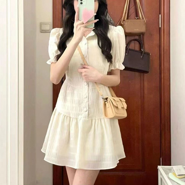 프렌치 한국 스타일의 달콤한 폴로 칼라 드레스 퍼프 슬리브 쉬폰 여성 여름 디자인 틈새 하이 웨이스트 기질 짧은 스커트스토어 가기