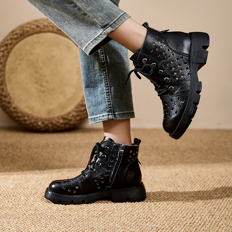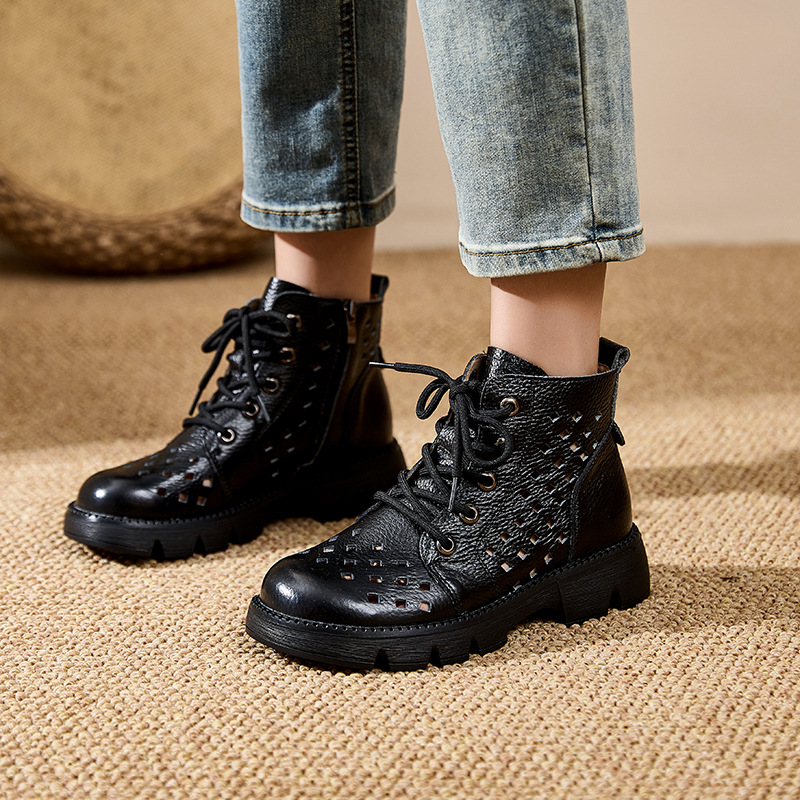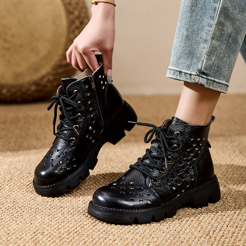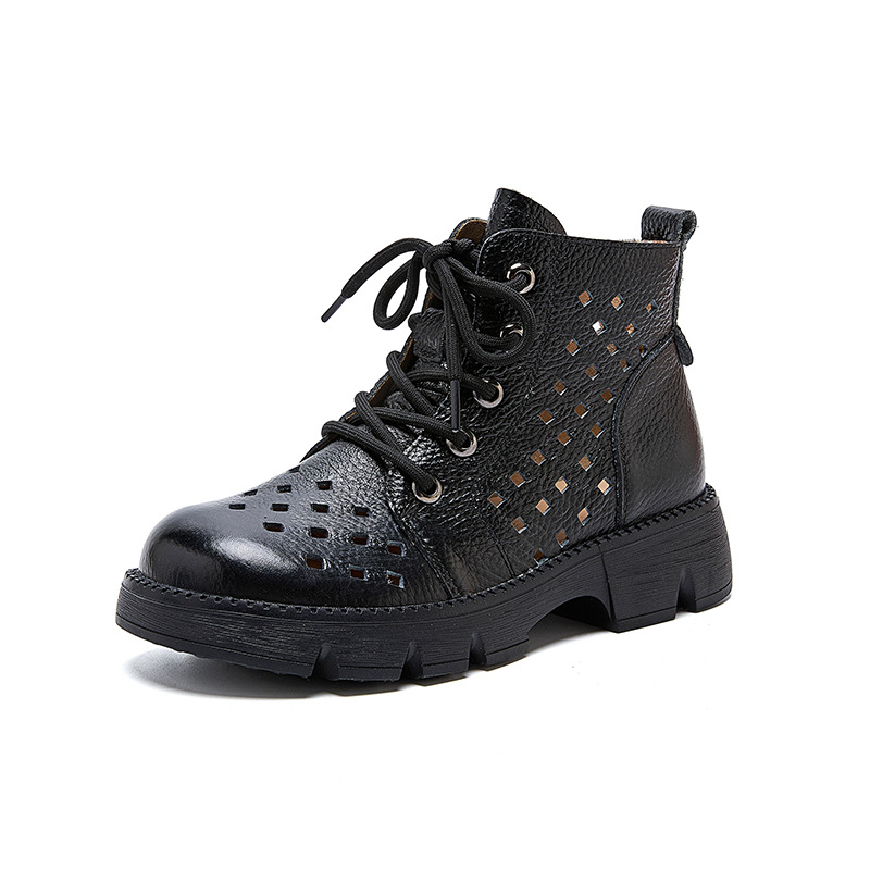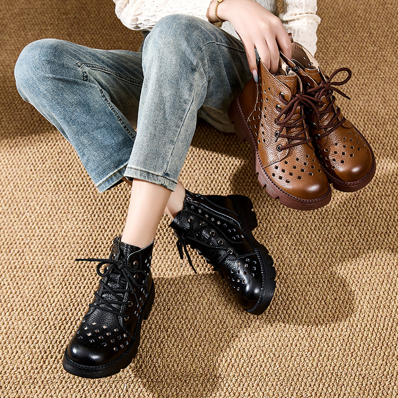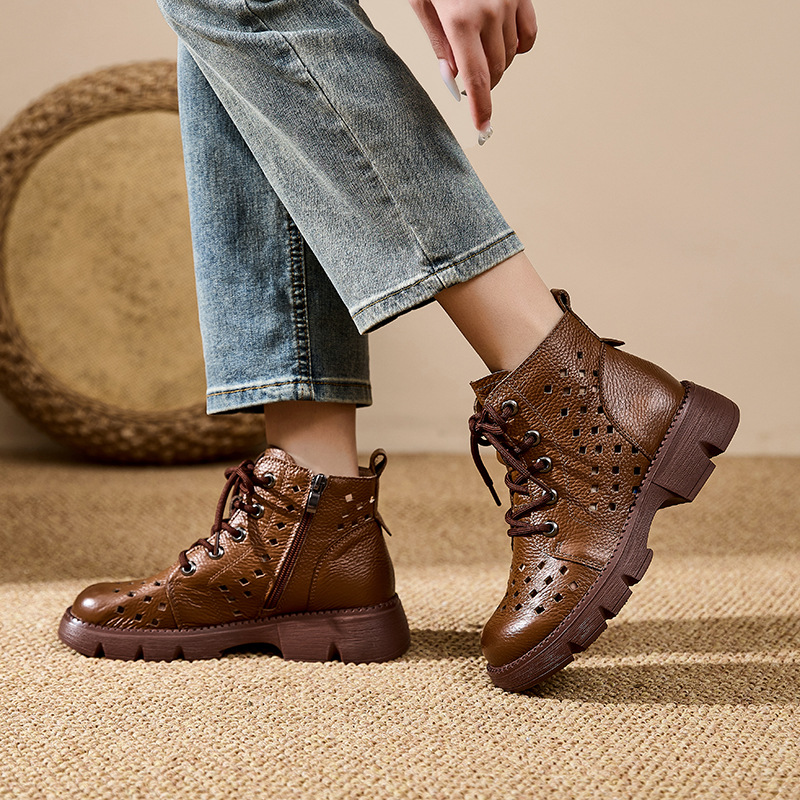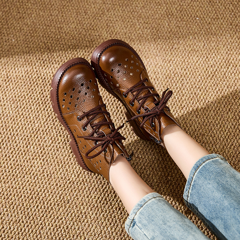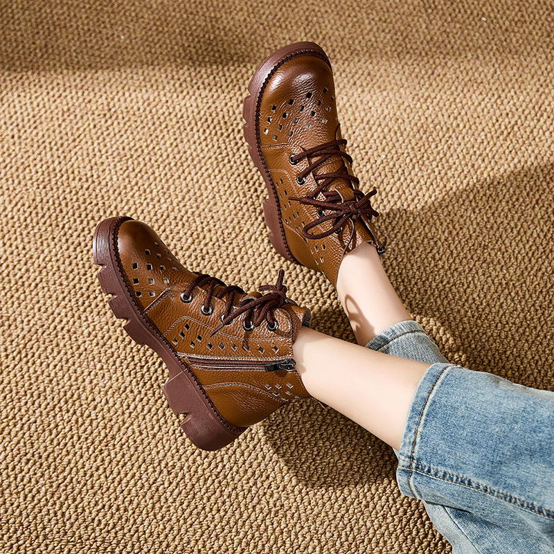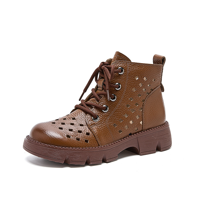 정품 가죽 중공 마틴 부츠 여름 얇은 여성 통기성 탑 레이어 Cowhide 부츠 짧은 소프트 하단 다크 브라운 짧은 부츠스토어 가기