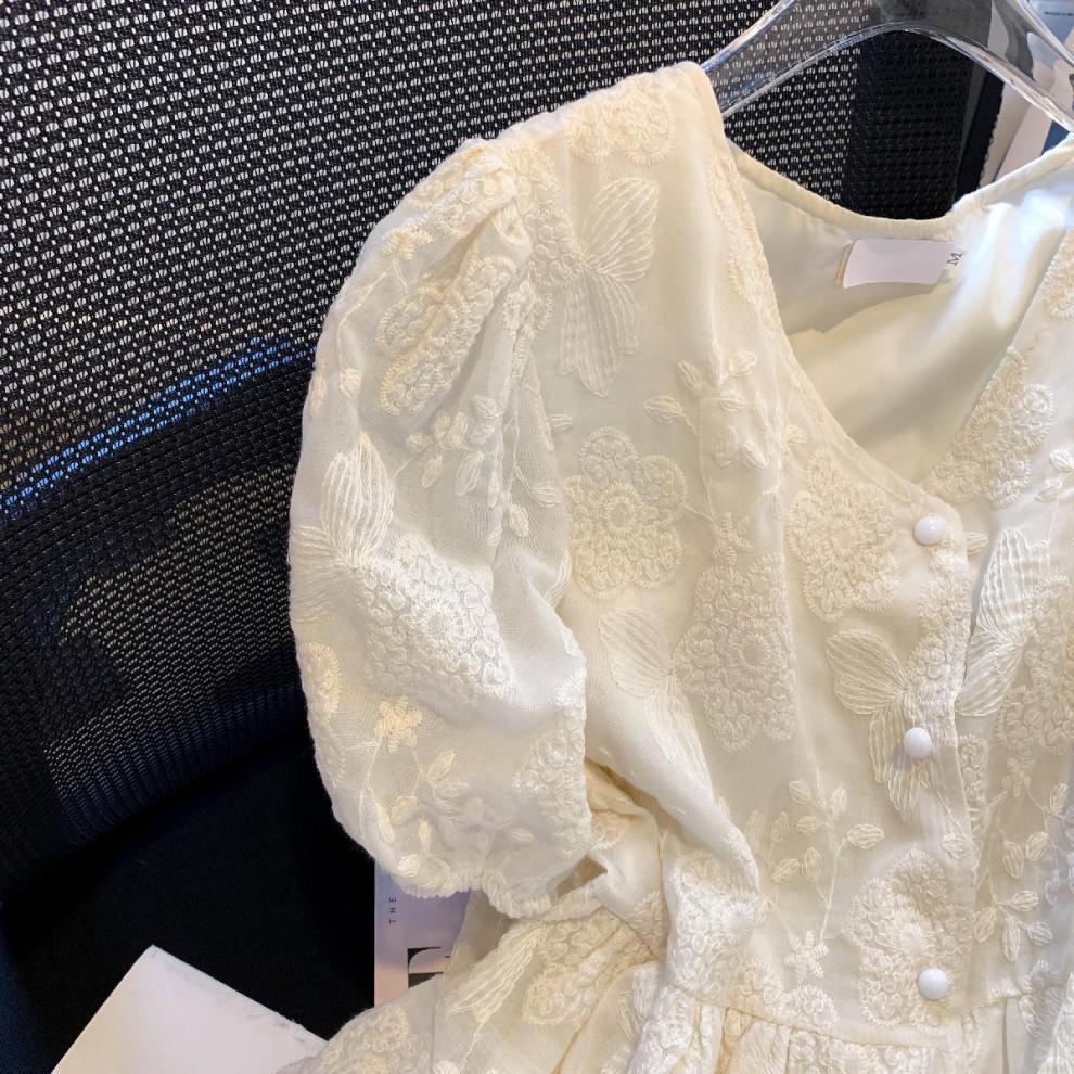 자수 자카드 크래프트 퍼프 슬리브 프랑스 스타일 디자인 센스 V 넥 타이트 허리 유행 루즈 쉬폰 짧은 소매 레이스 셔츠스토어 가기