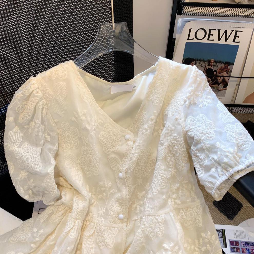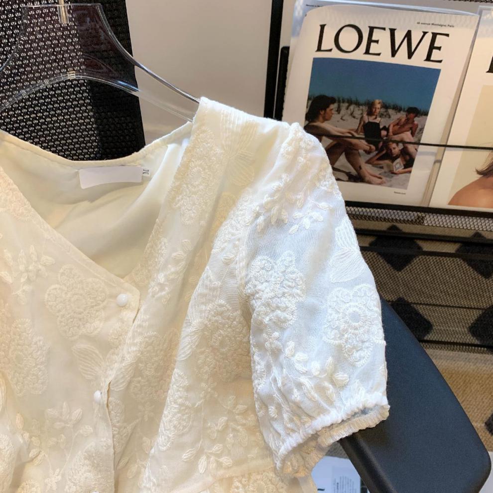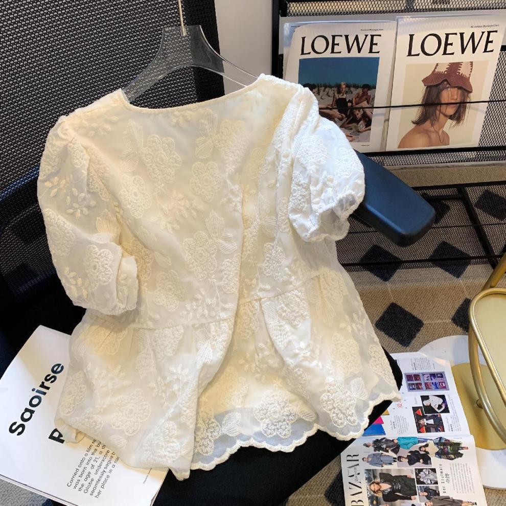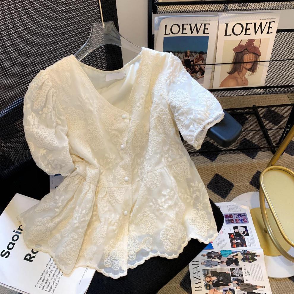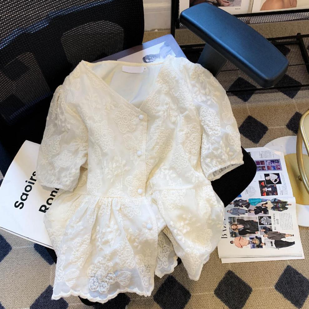 자수 자카드 크래프트 퍼프 슬리브 프랑스 스타일 디자인 센스 V 넥 타이트 허리 유행 루즈 쉬폰 짧은 소매 레이스 셔츠