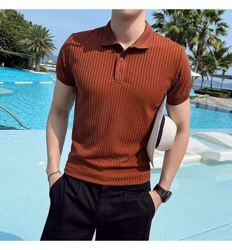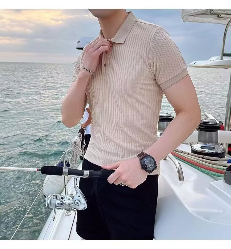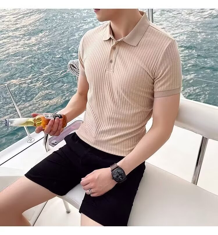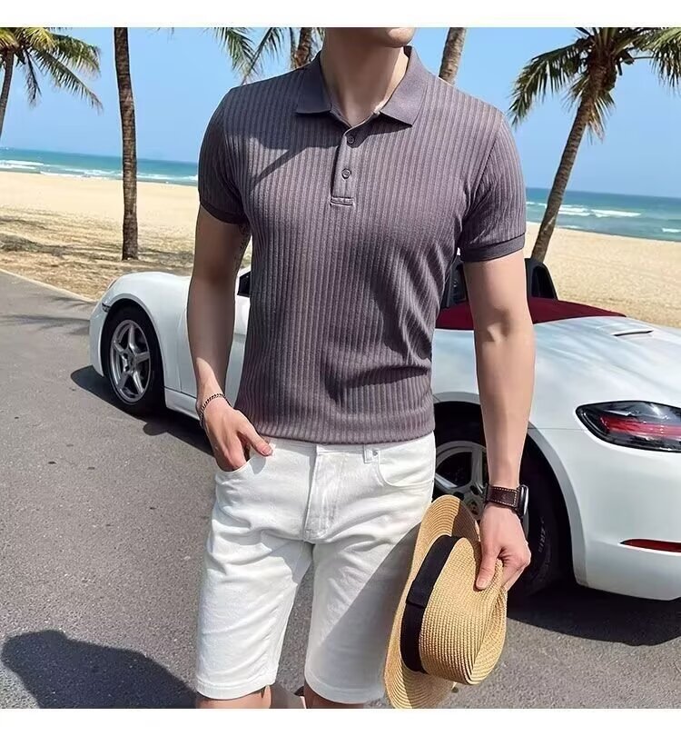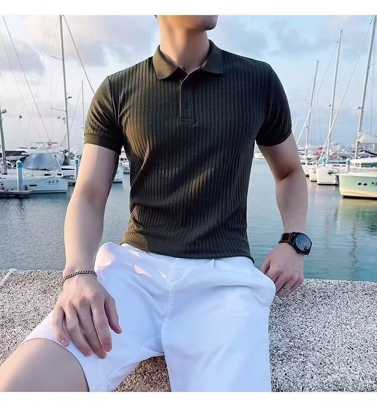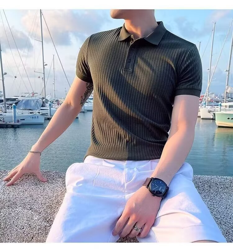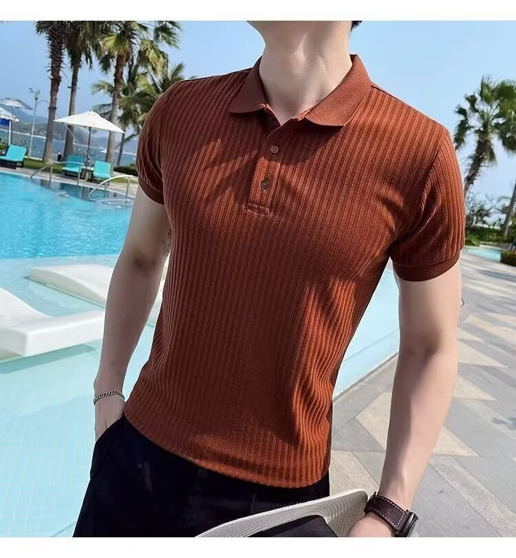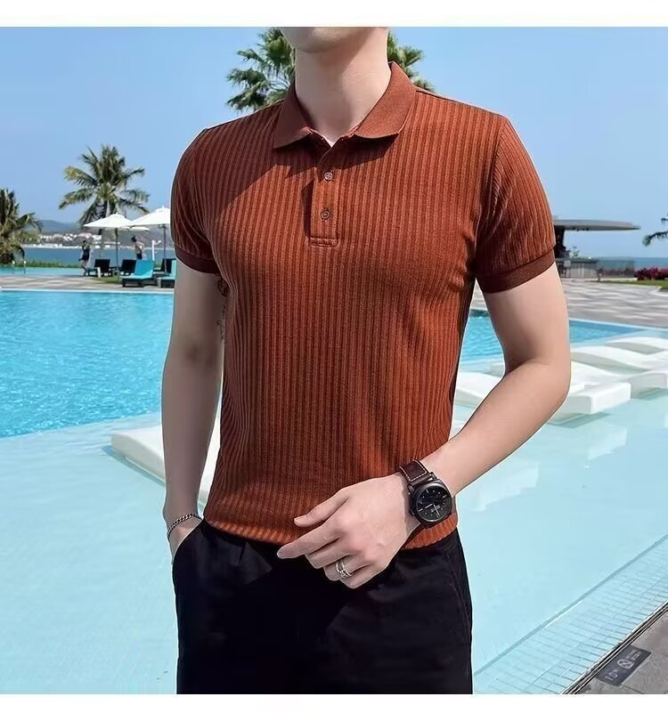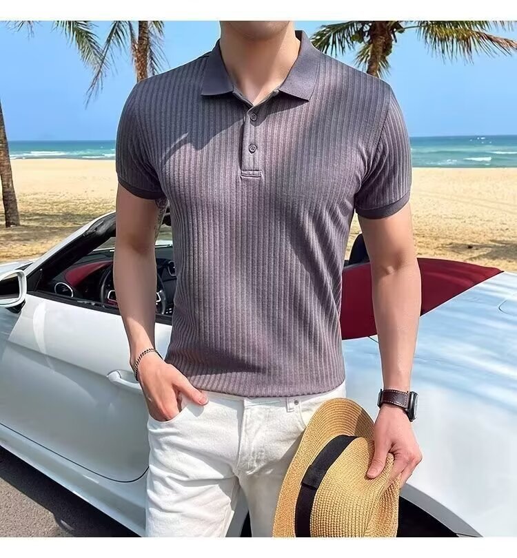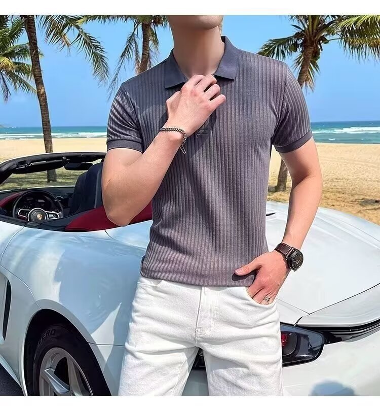 2025 년 여름 새로운 도착 줄무늬 니트 아이스 실크 티셔츠 남자 랩 짧은 소매 폴로 셔츠 남자 반소매 얇은 탑