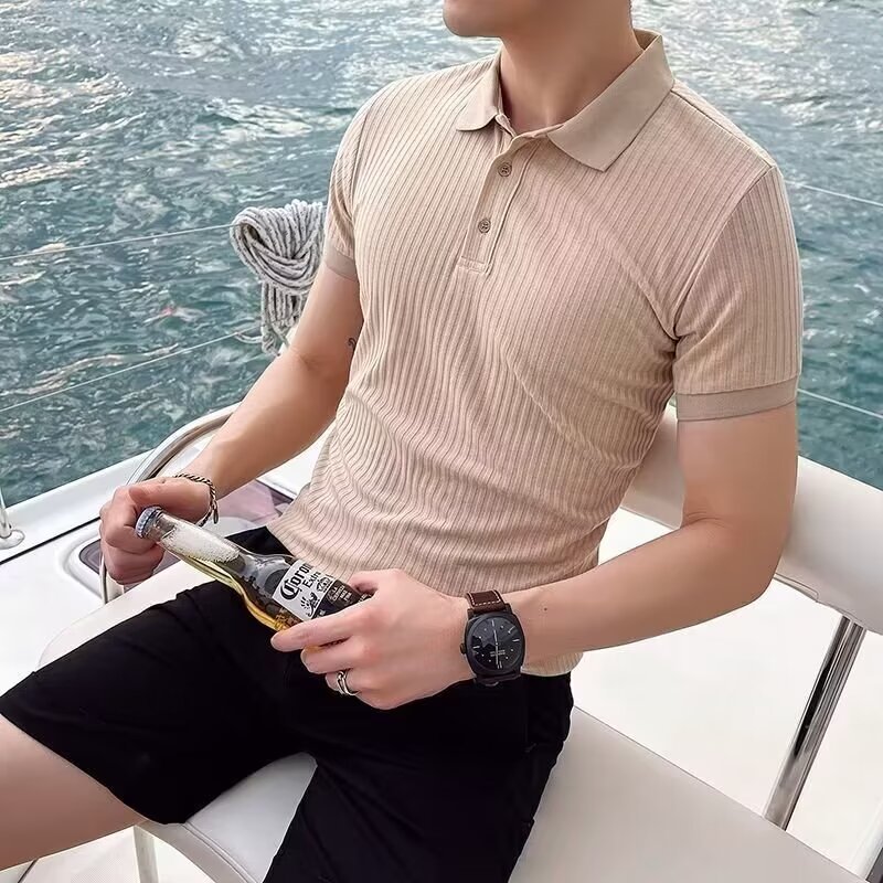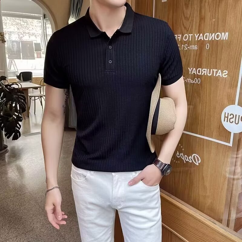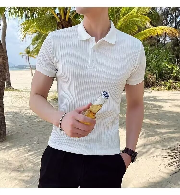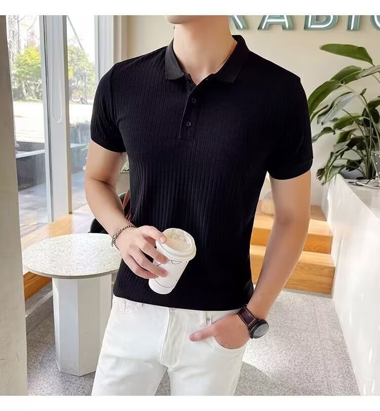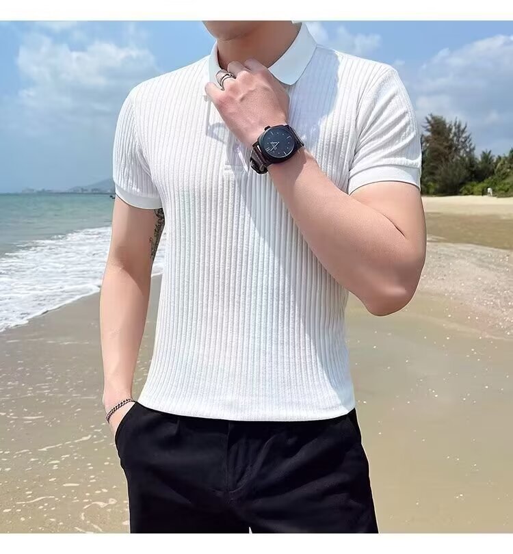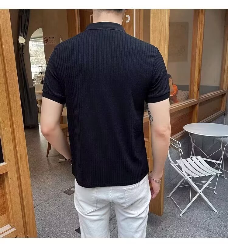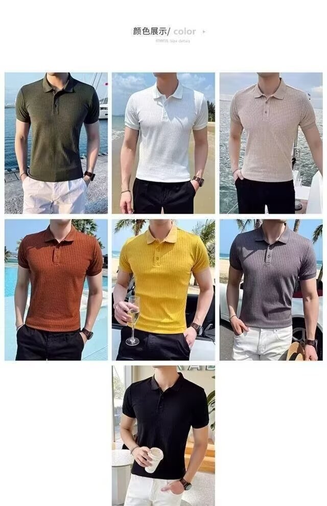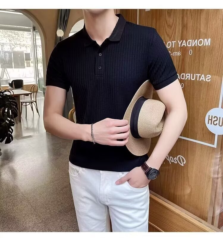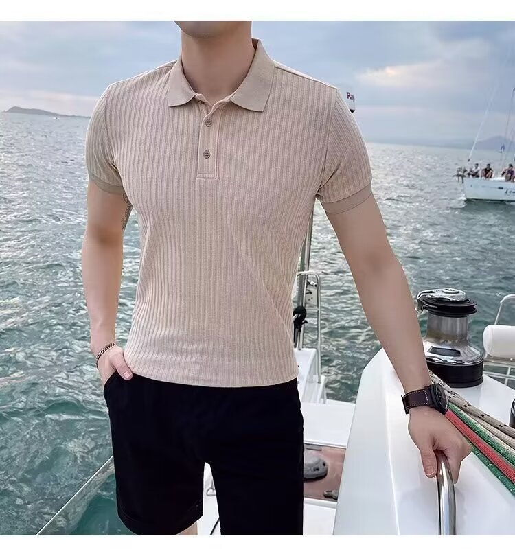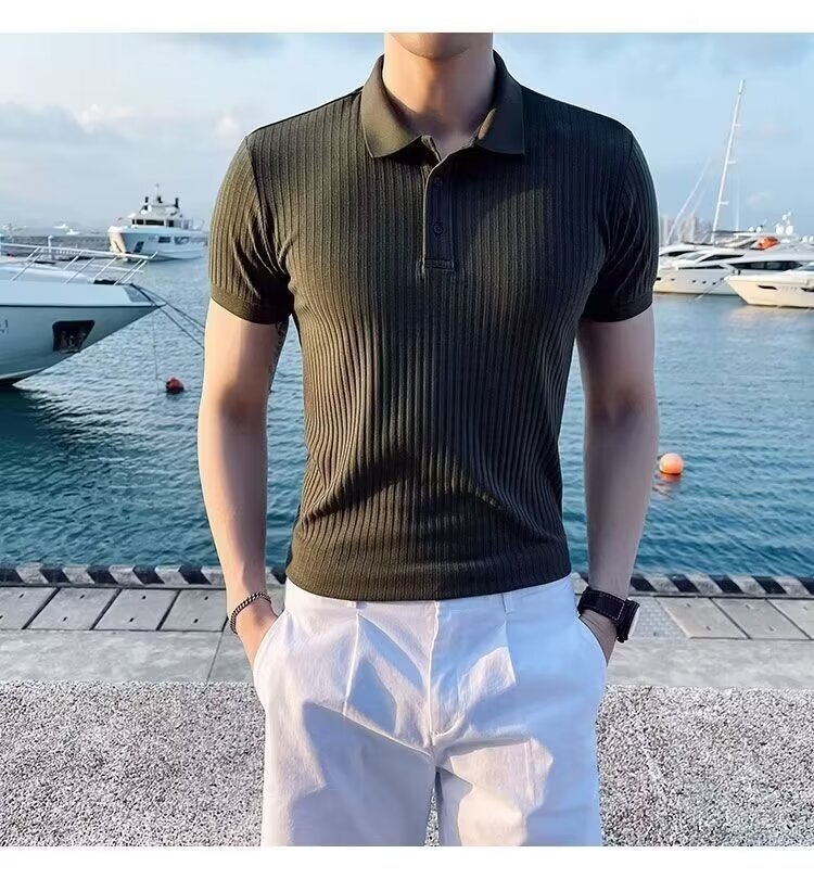 2025 년 여름 새로운 도착 줄무늬 니트 아이스 실크 티셔츠 남자 랩 짧은 소매 폴로 셔츠 남자 반소매 얇은 탑