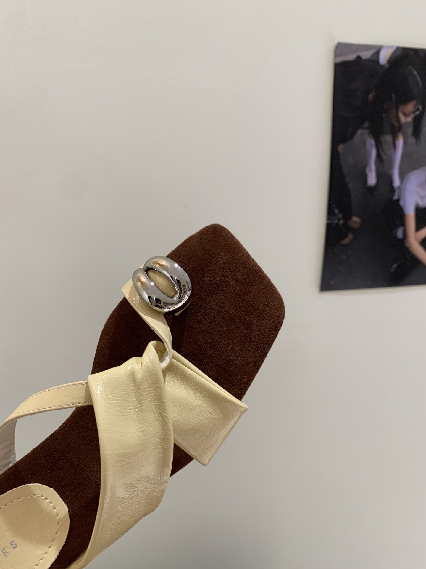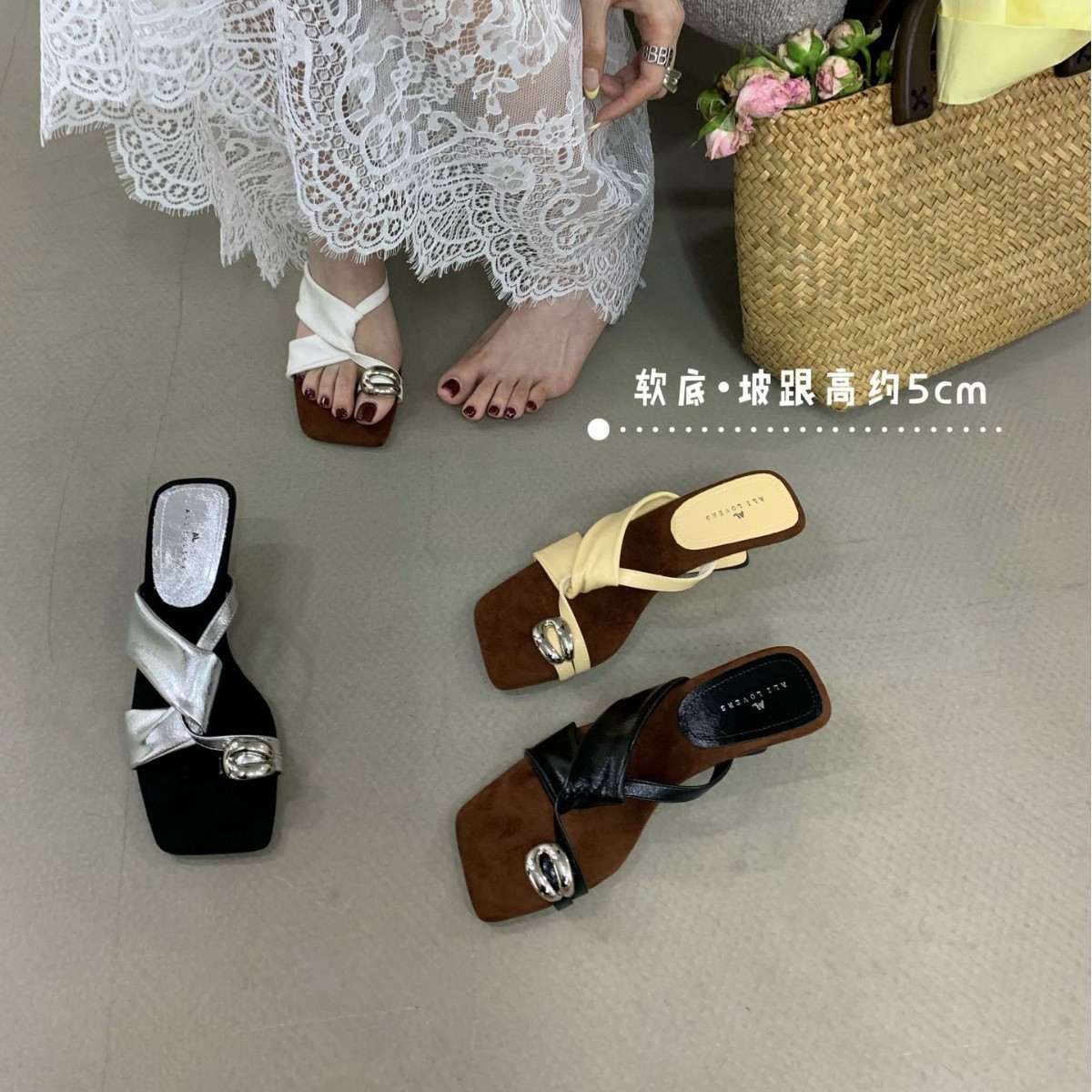 2025년 여름 신상 스퀘어토 원라인 중공 웨지힐 게으른 하프드로잉 오픈토 여성 샌들