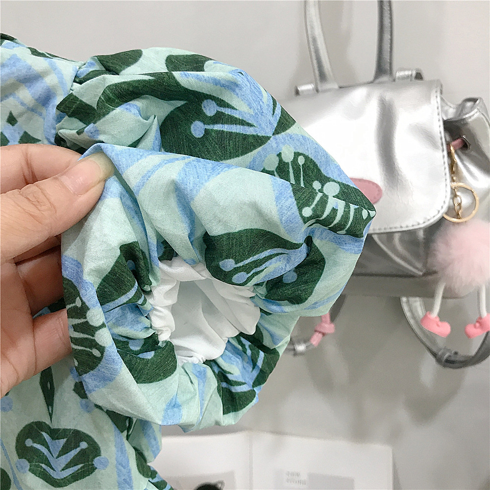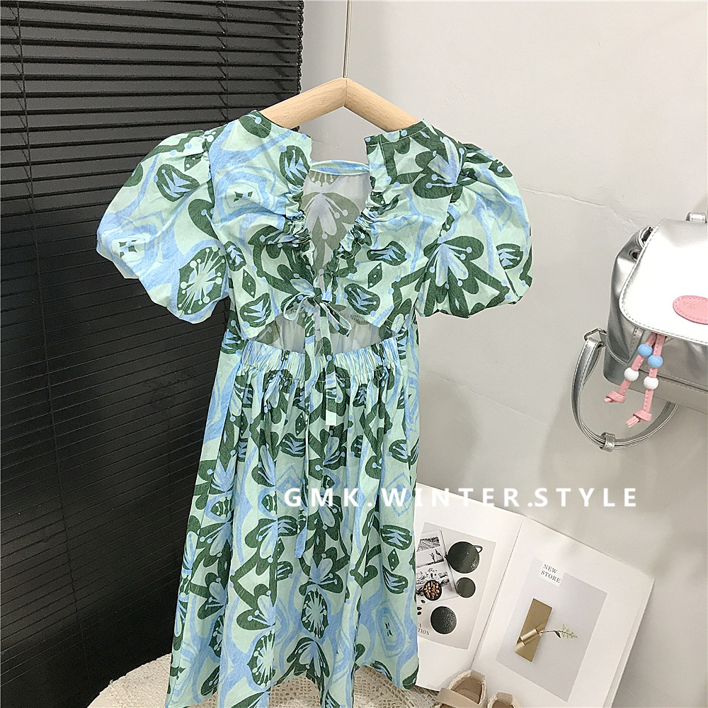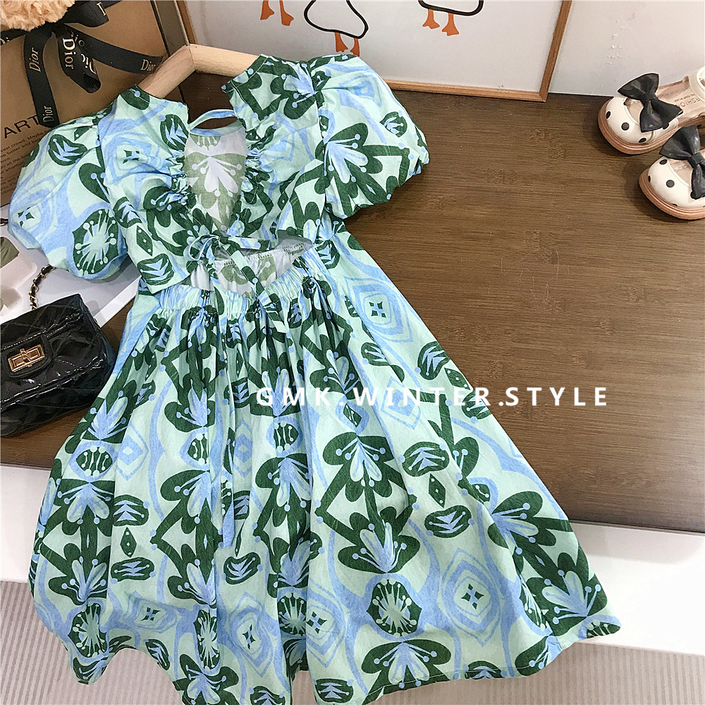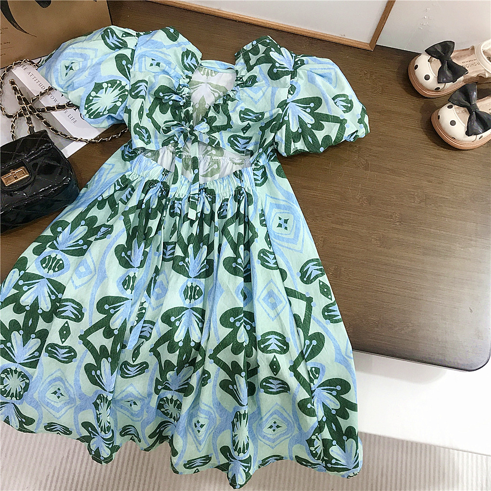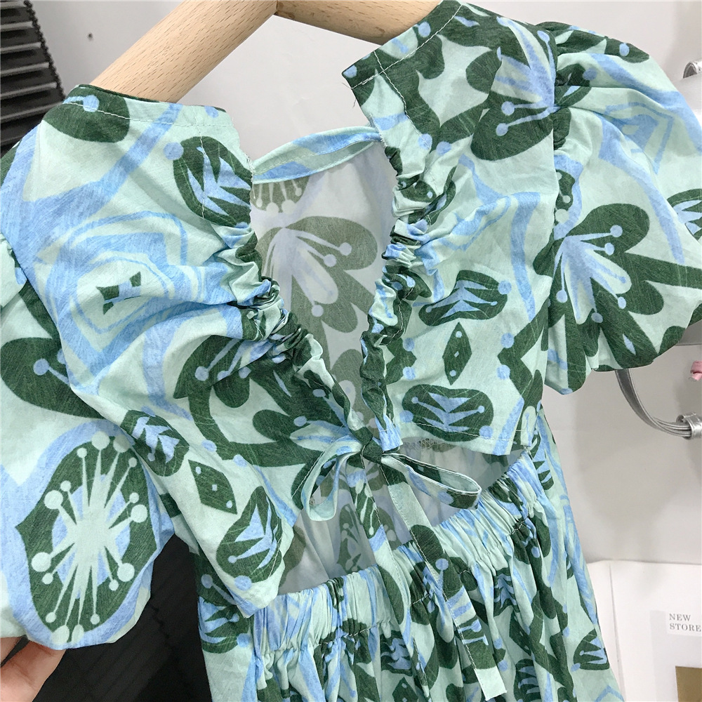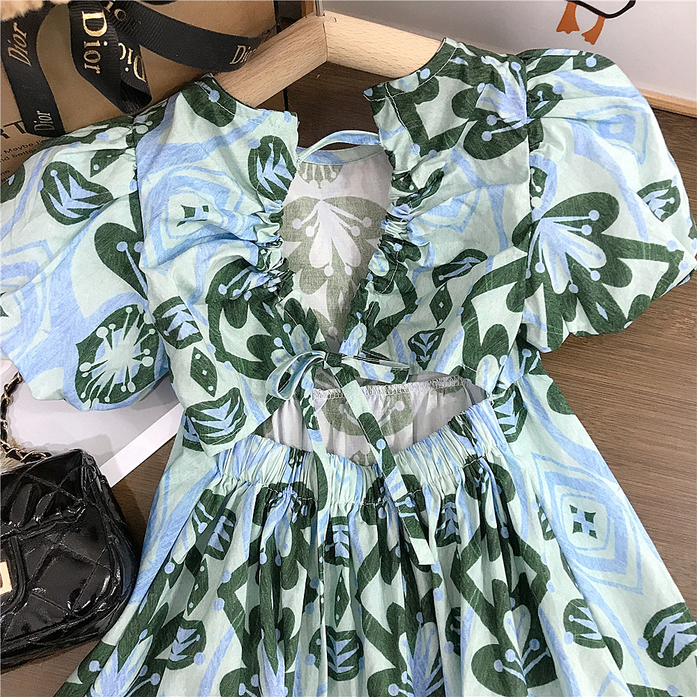 신선한 소녀의 등이없는 원피스 여름 착용 검열이없는 여성의 등 레이스 업 블루 플라워 퍼프 슬리브 원피스스토어 가기