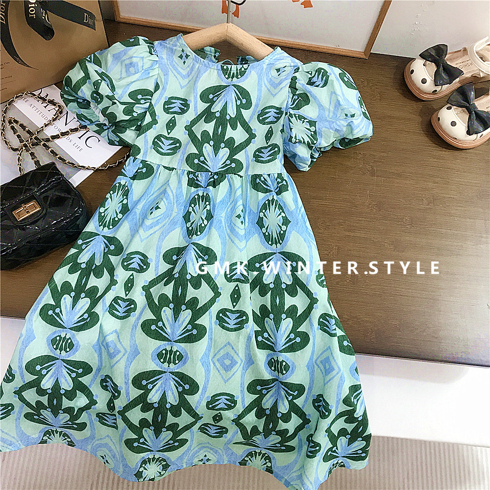 • 빅 블루 플라워 퍼프 슬리브 드레스