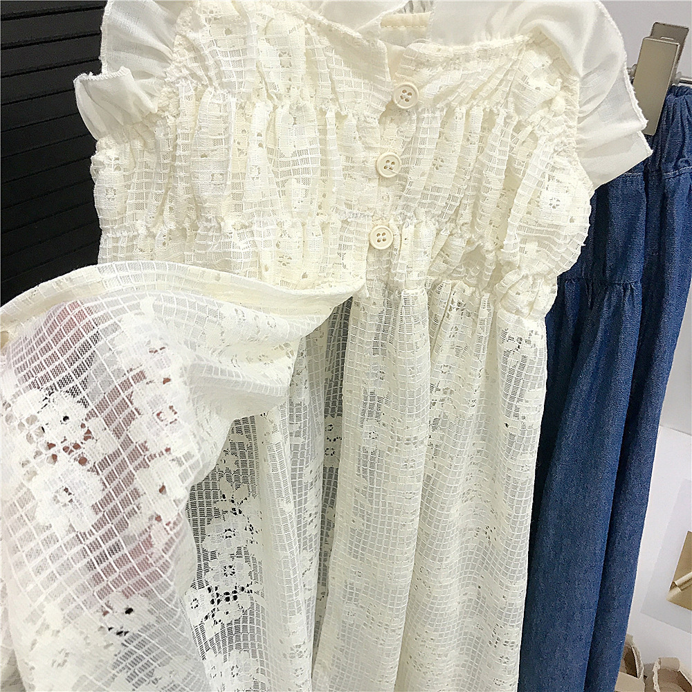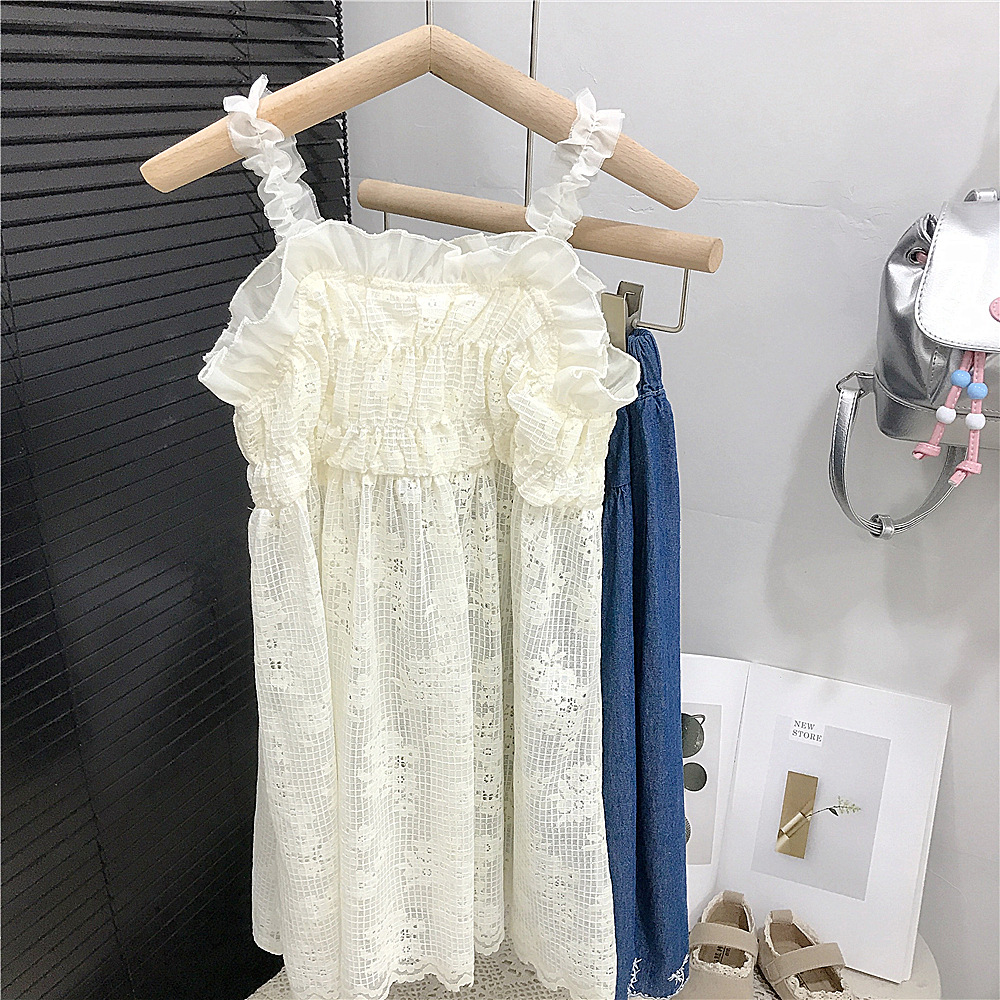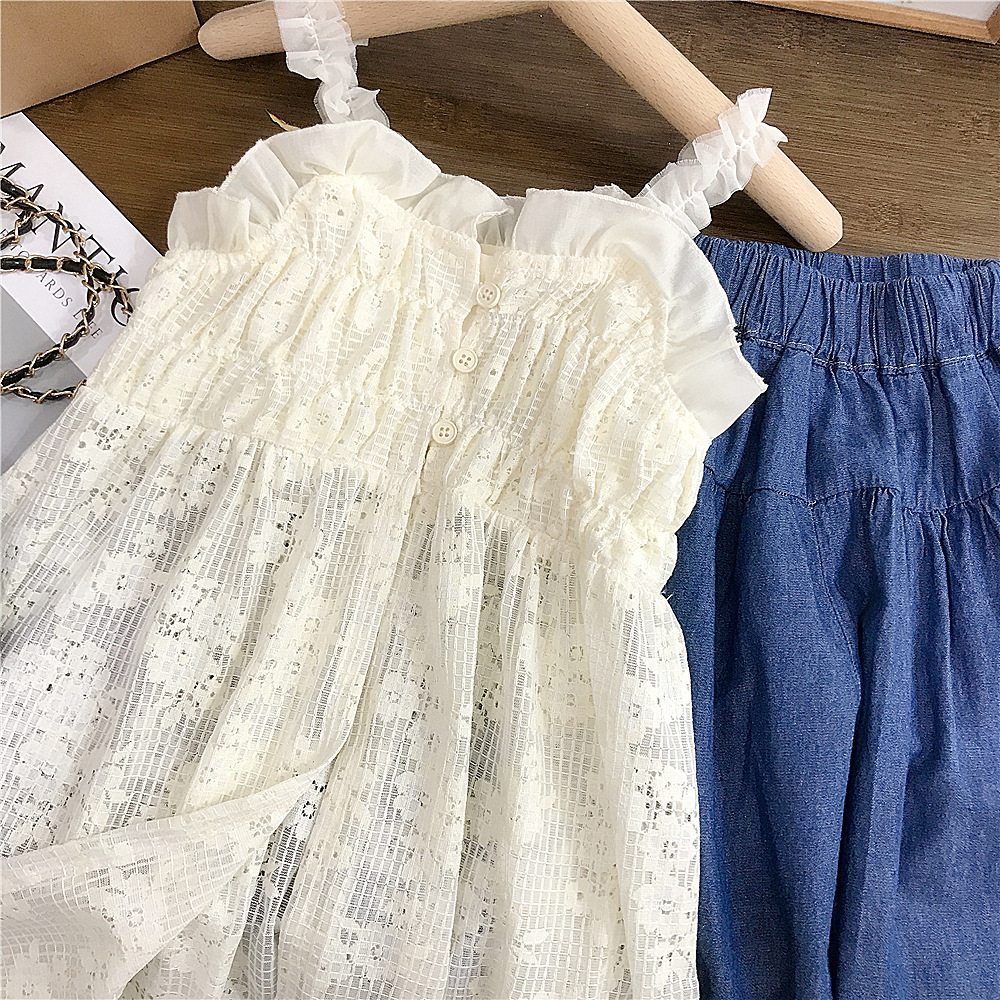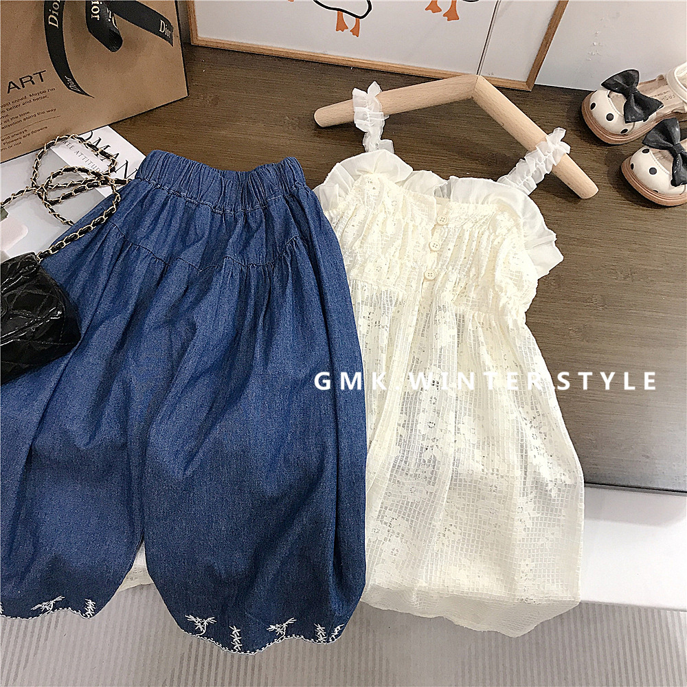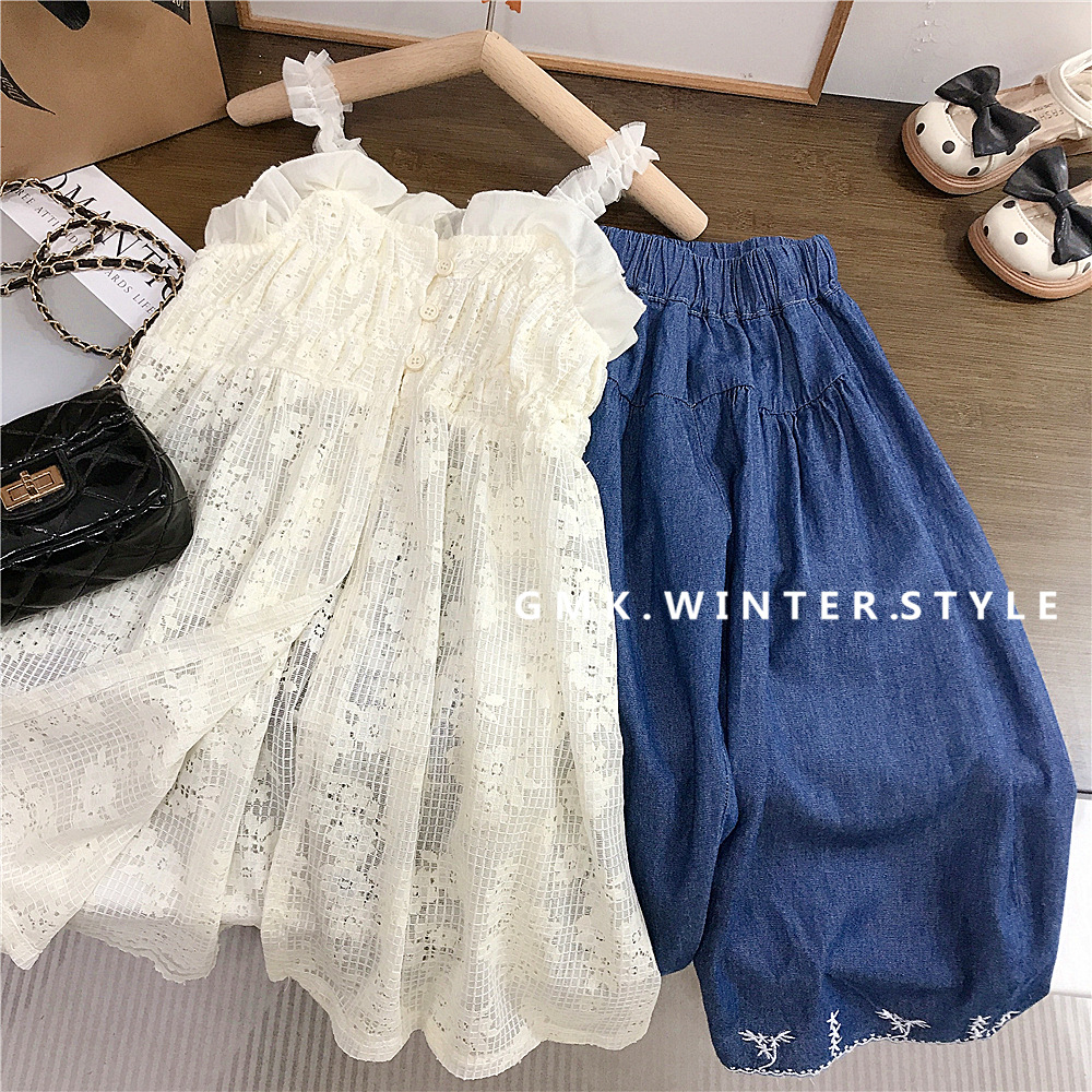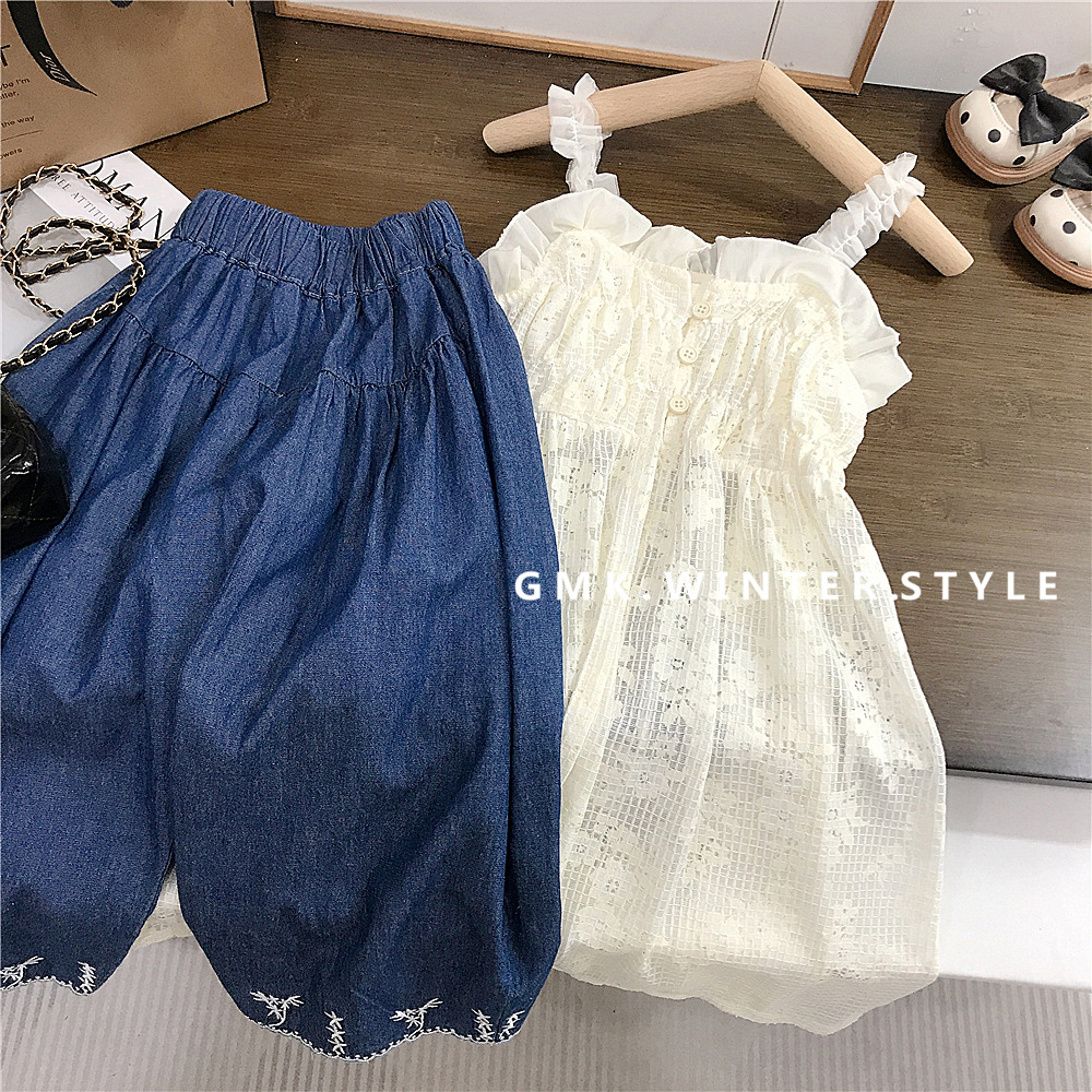 소녀 슬링 스커트 여름 새로운 달콤한 자수 청바지 레이스 슬링 공주 스커트 2 피스 대외 무역 세트