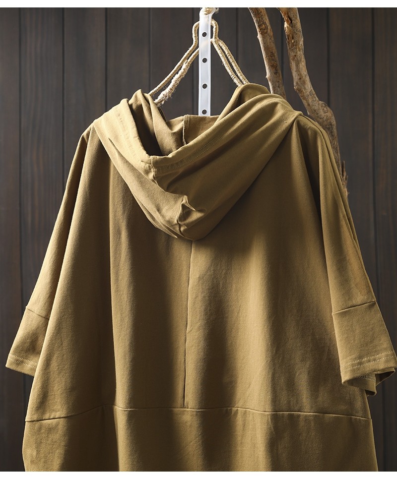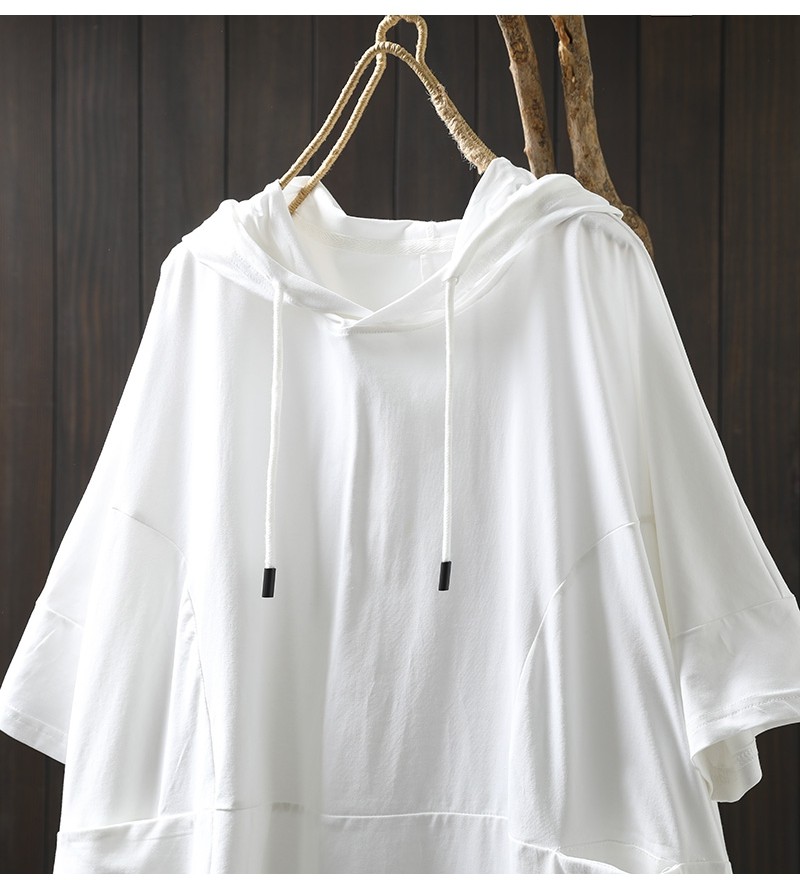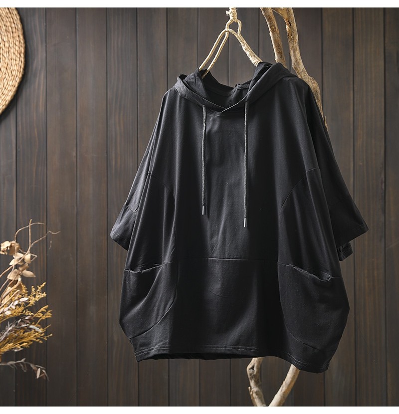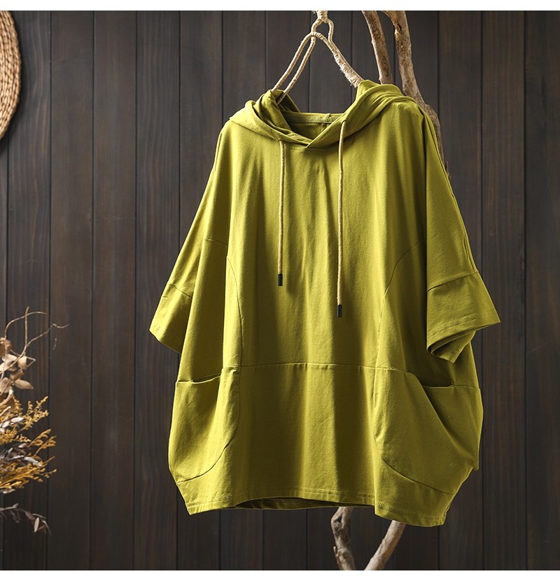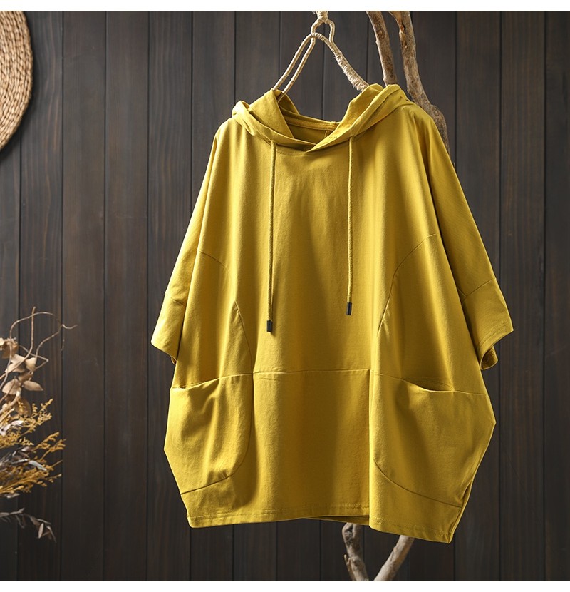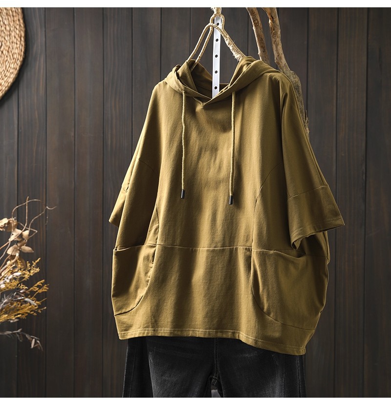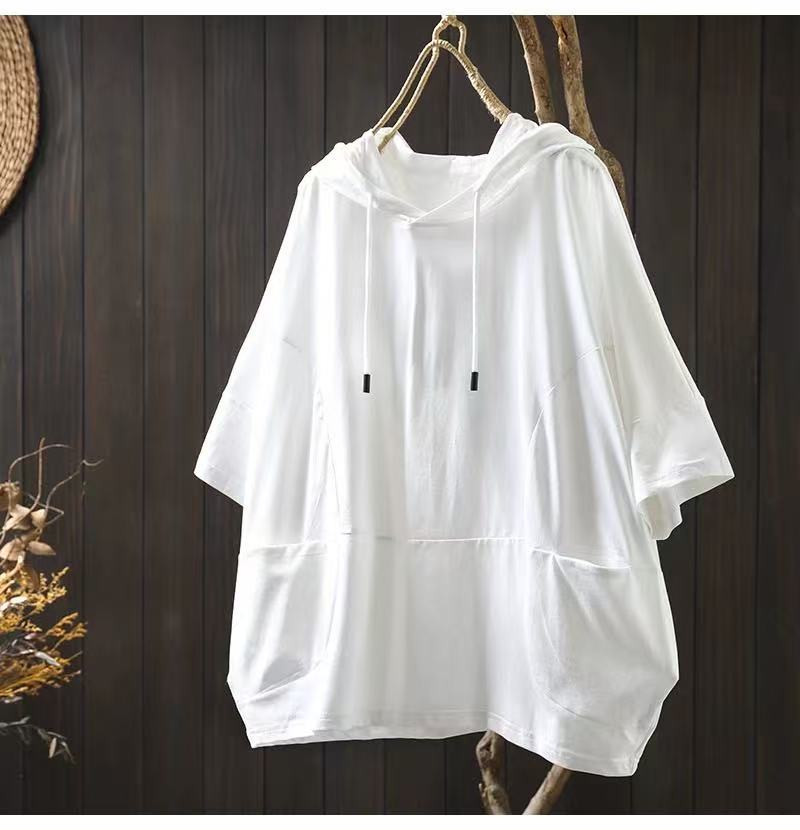 여름 새로운 더블 포켓 후드 반팔 티셔츠 여성용 느슨한 둥근 목 얇은 캐주얼 고기 커버 풀오버 81231
