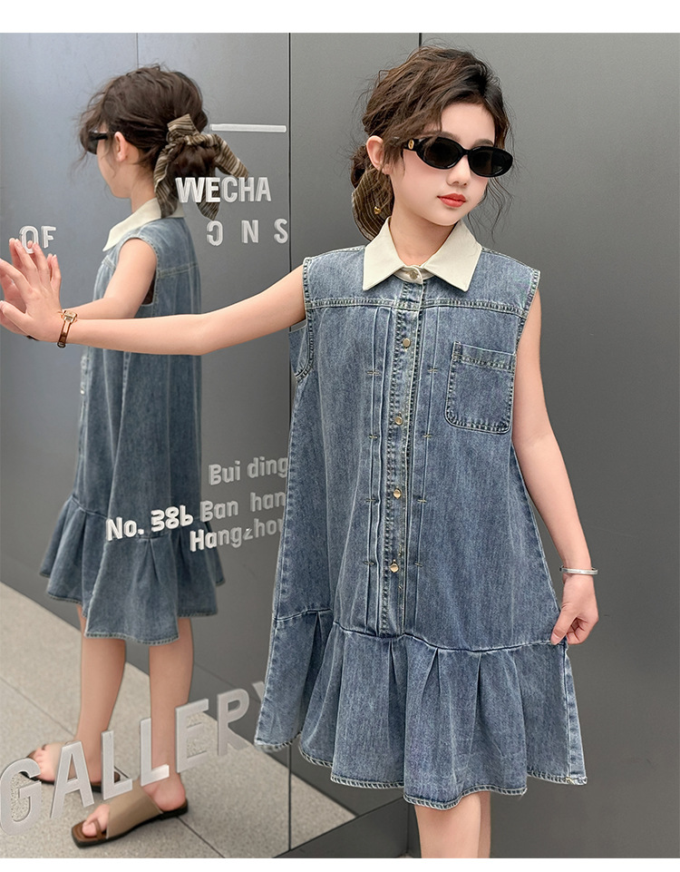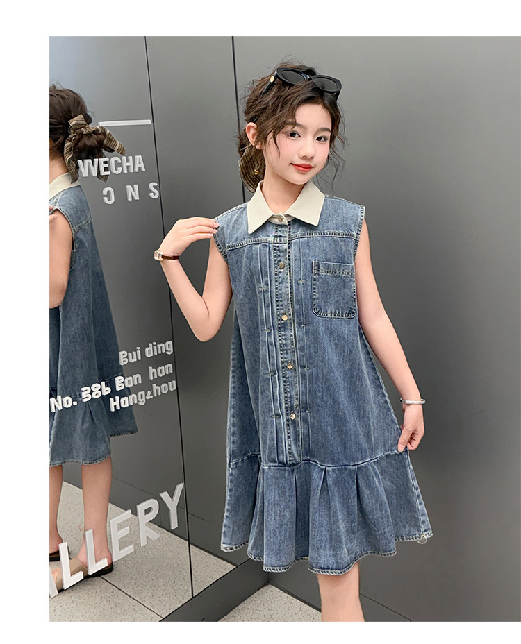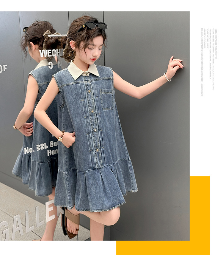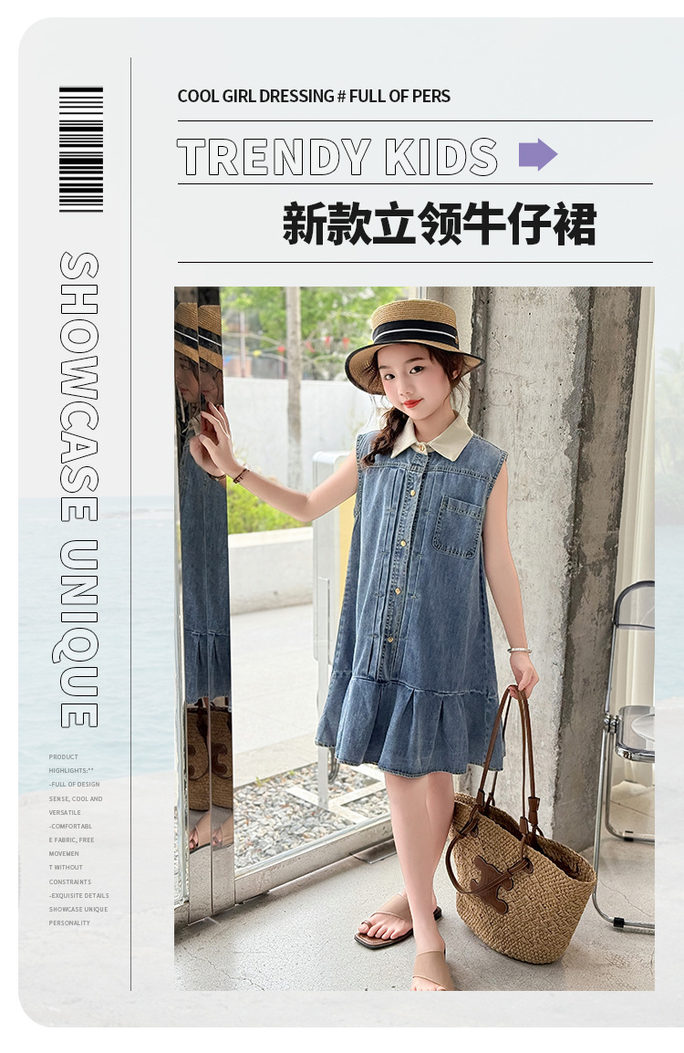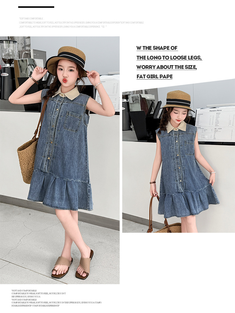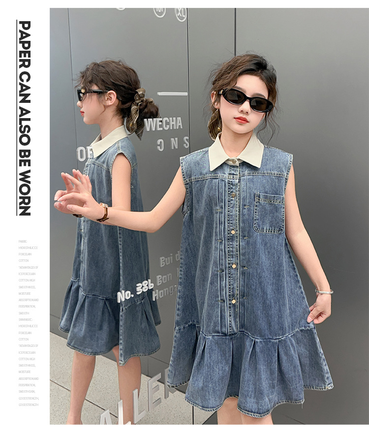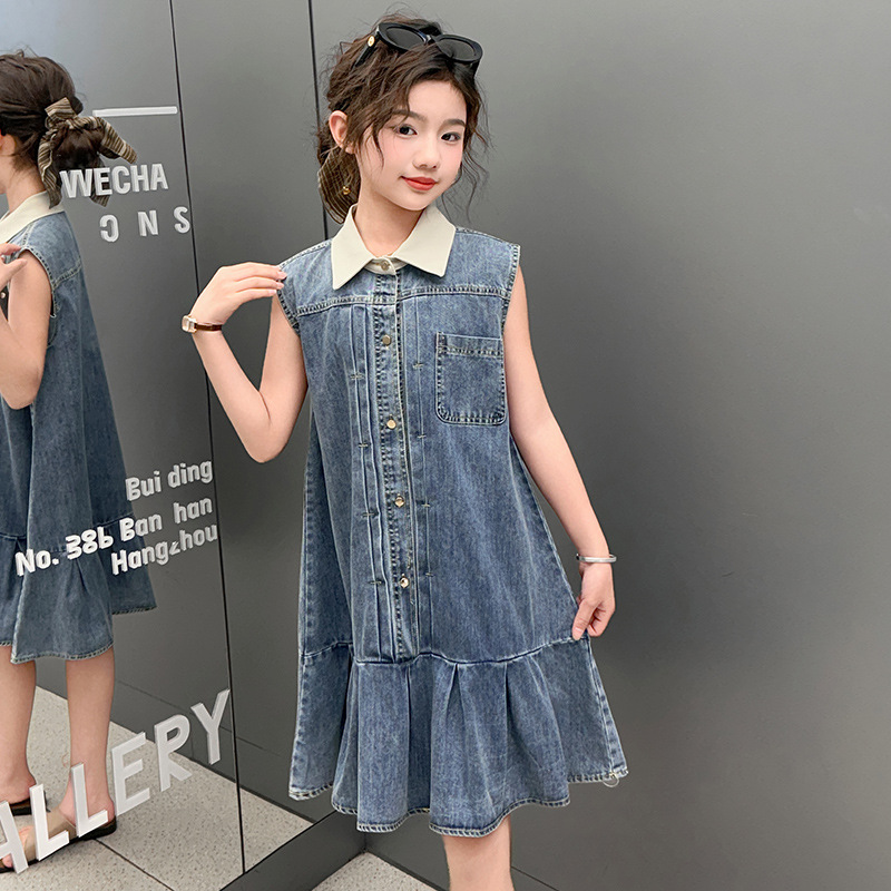 여자 여름 데님 스커트 2025 새로운 큰 어린이 한국 스타일 느슨한 조끼 드레스 어린이 여름 슈퍼 멋진 드레스스토어 가기