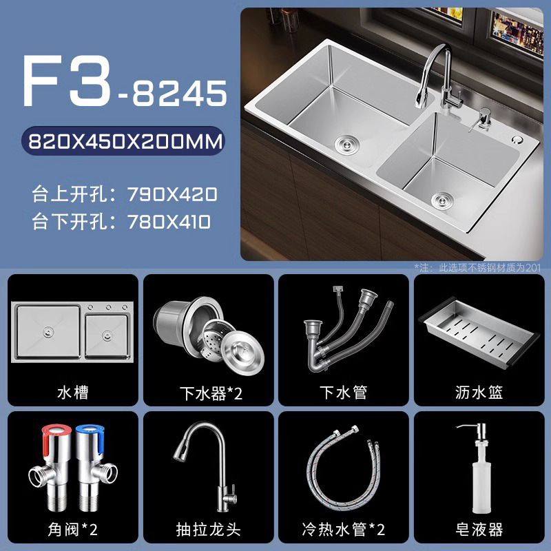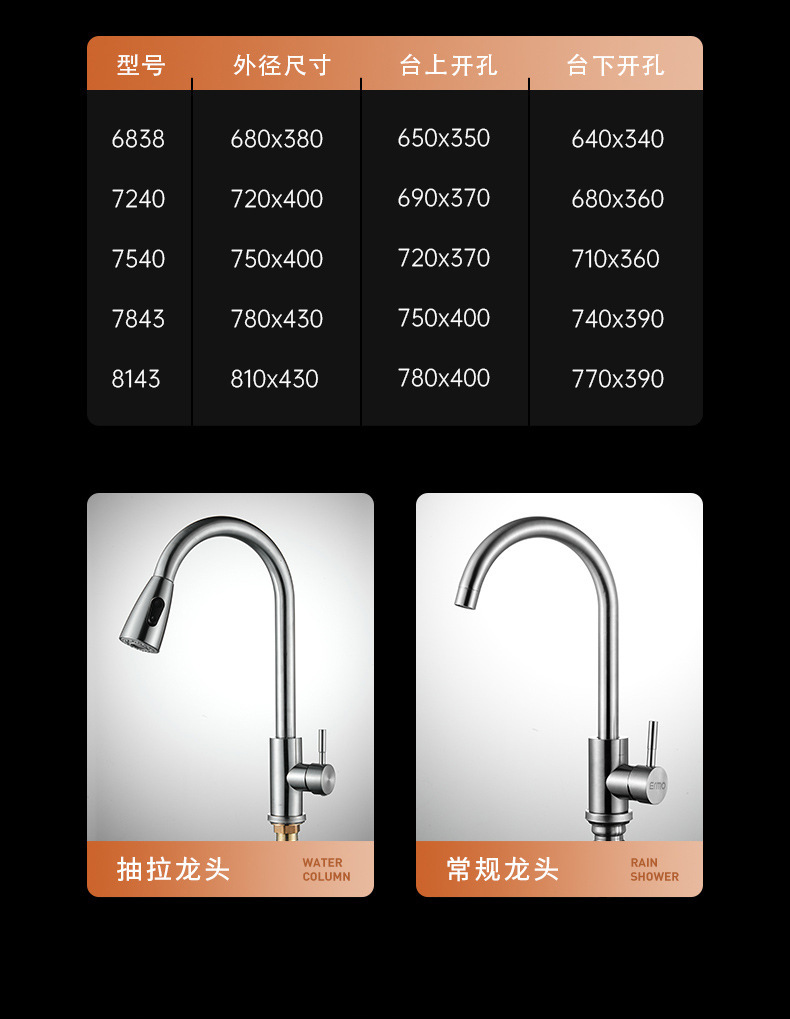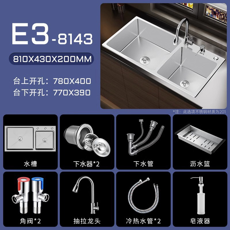 • SUS304—8143 싱크대 + 2단 인출식 수도꼭지 + 비누 디스펜서 + 접이식 바구니