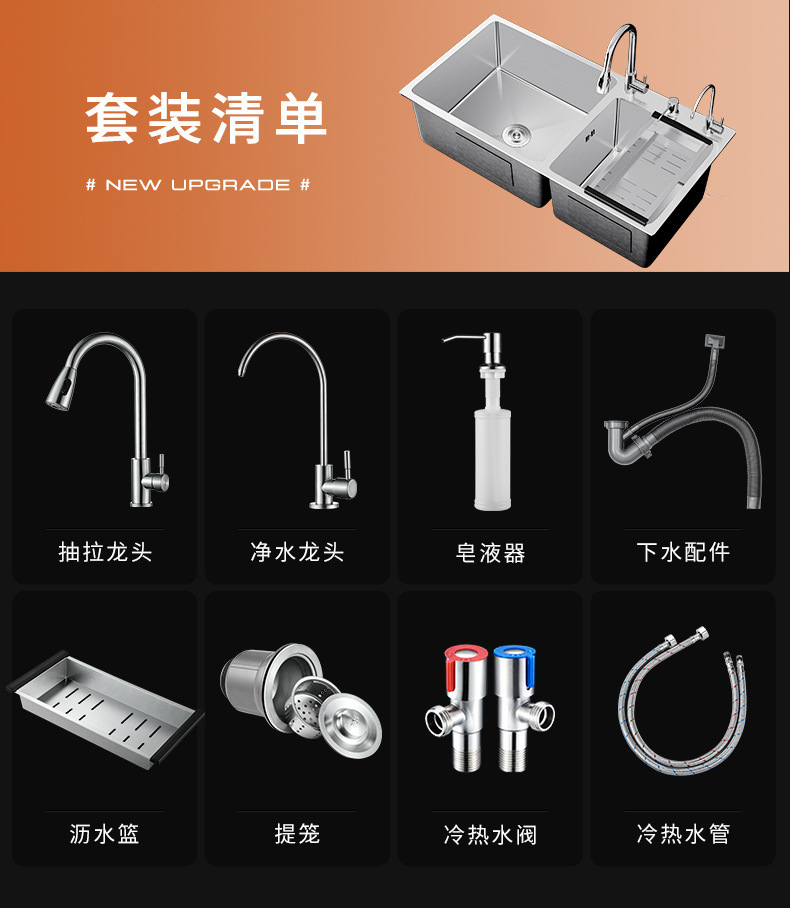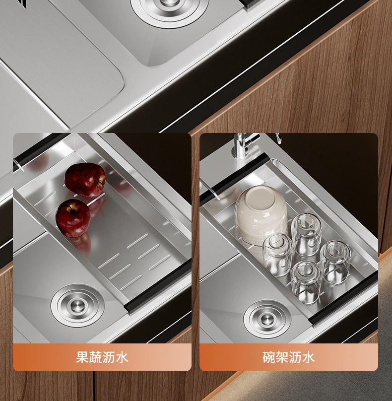 • SUS304—7240 싱크대 + 2단 인출식 수도꼭지 + 비누 디스펜서 + 접이식 바구니