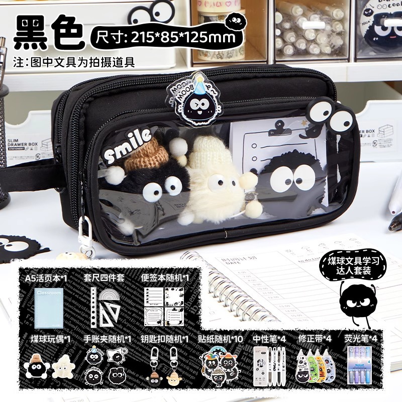 • [석탄 가치 노트 학습 상자] 쿨 블랙 필통 + 연탄 젤펜 + 형광펜 + 메모장 + 노트북 홀더 + 연탄 인형 + 스티커*10