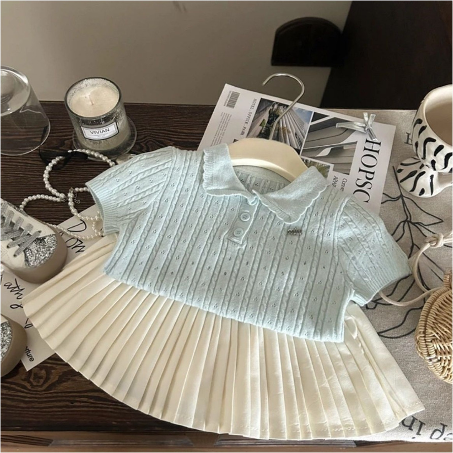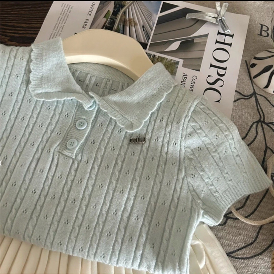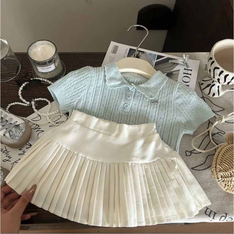 여자 여름 새 세트 2025 아기 대학 한국 니트 폴로 반팔 주름 치마 투피스 유행 세트