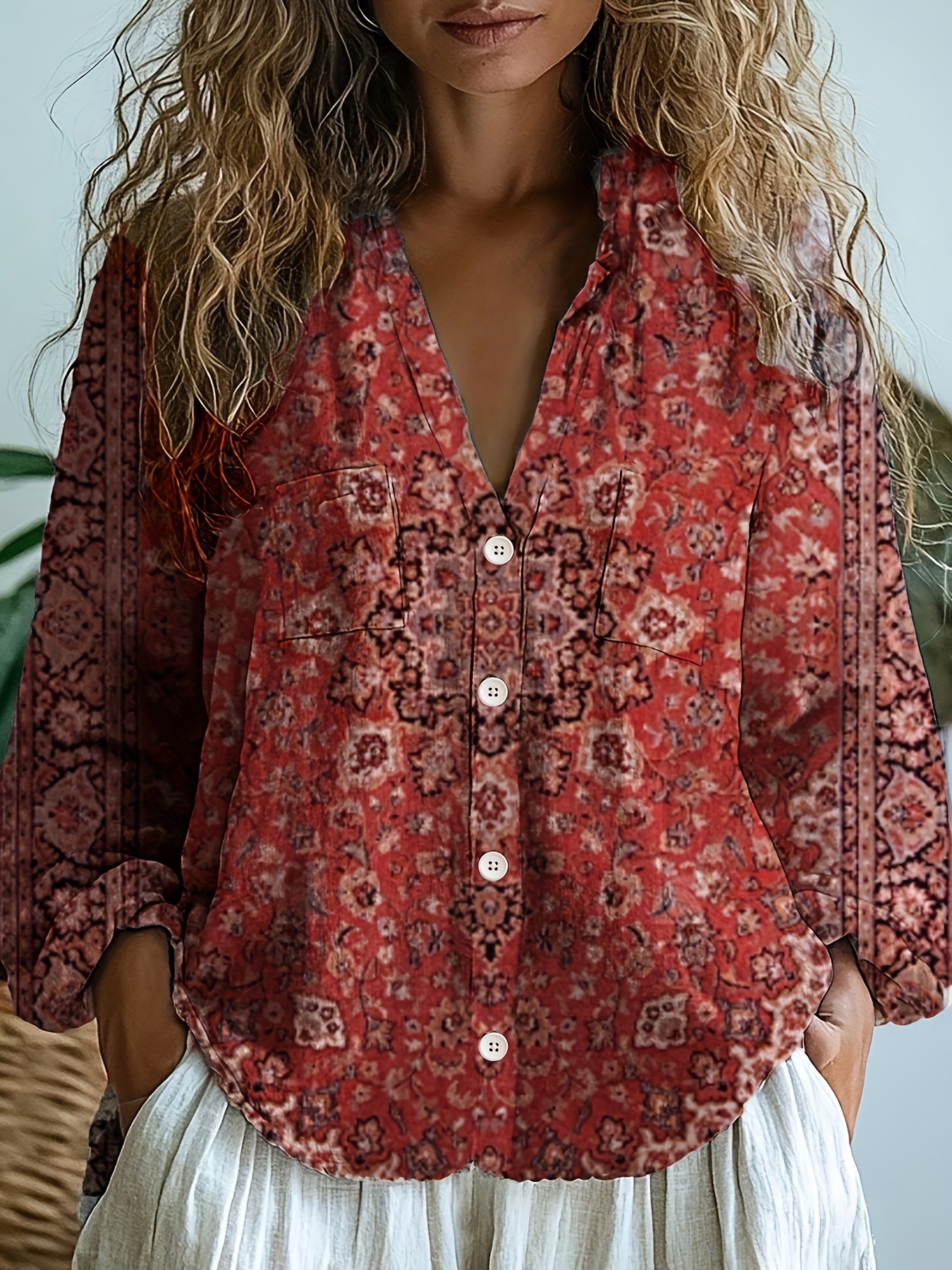 스팟 크로스보더 여성 캐주얼 통근 셔츠 서양 민족 스타일 기하학 프린트 긴팔 여성 셔츠스토어 가기