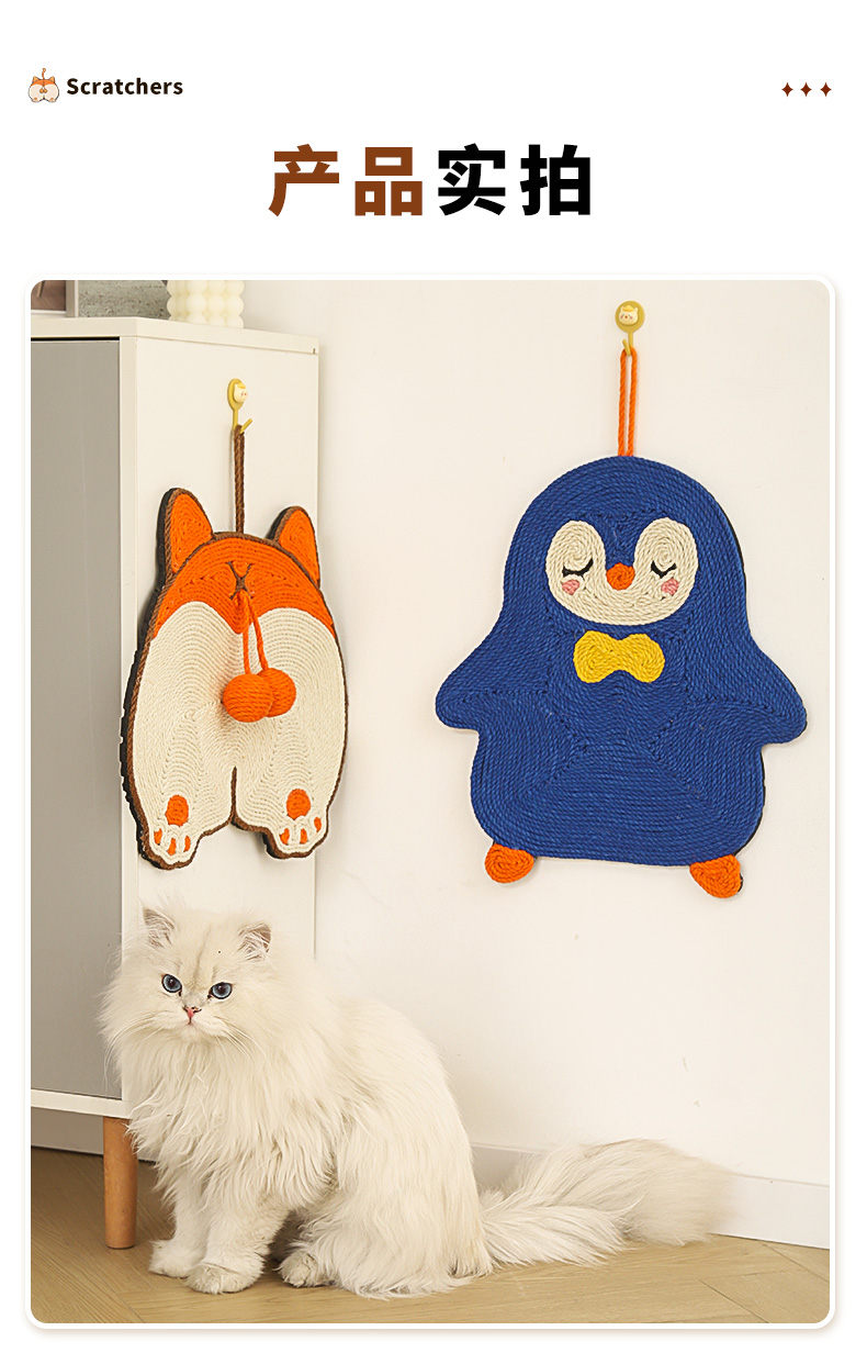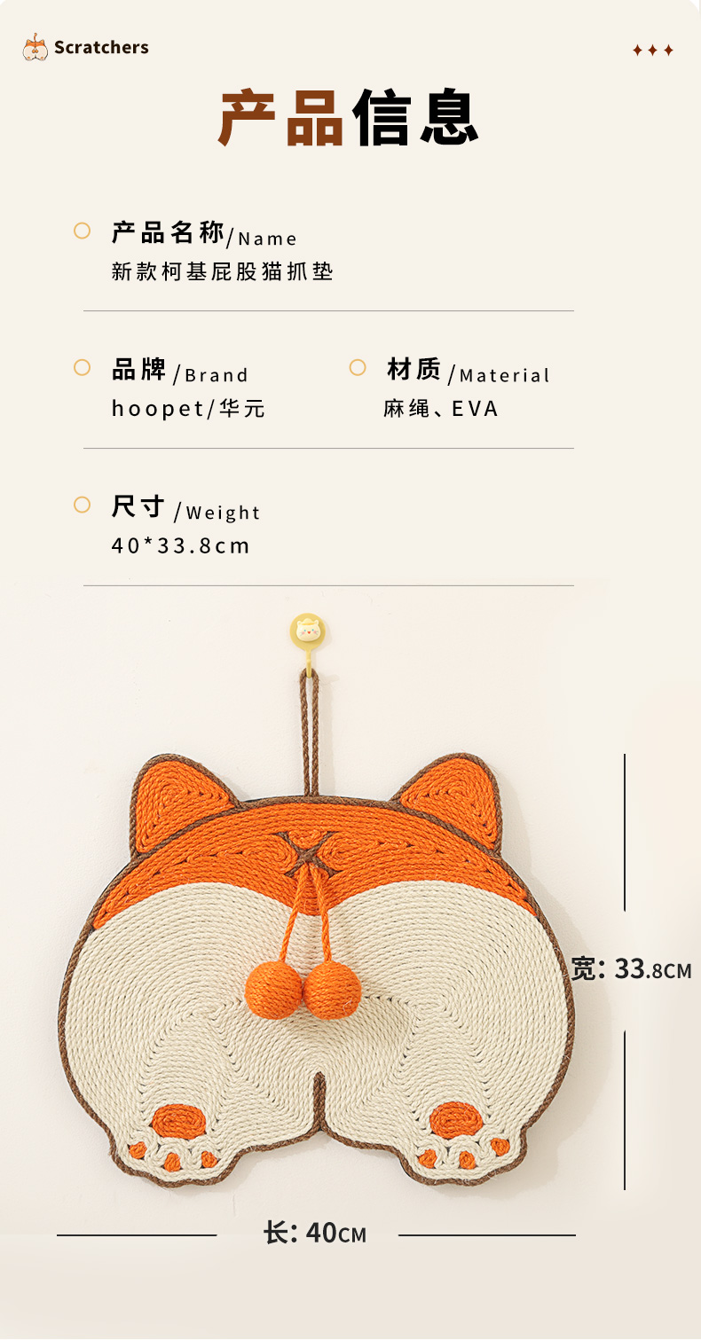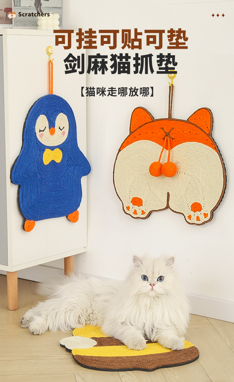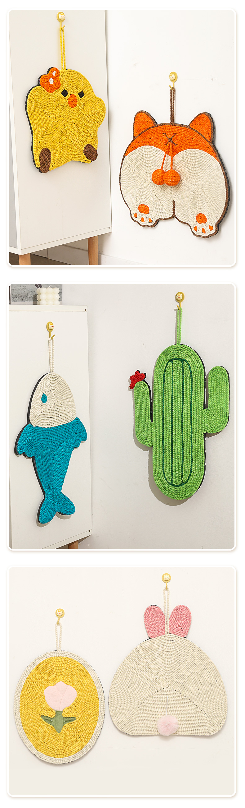 【品名】:hoopet小鱼/仙人掌款剑麻猫抓垫/企鹅/蜜蜂/新版柯基屁股/开心小鸡/白兔子带毛球/郁金香猫抓垫