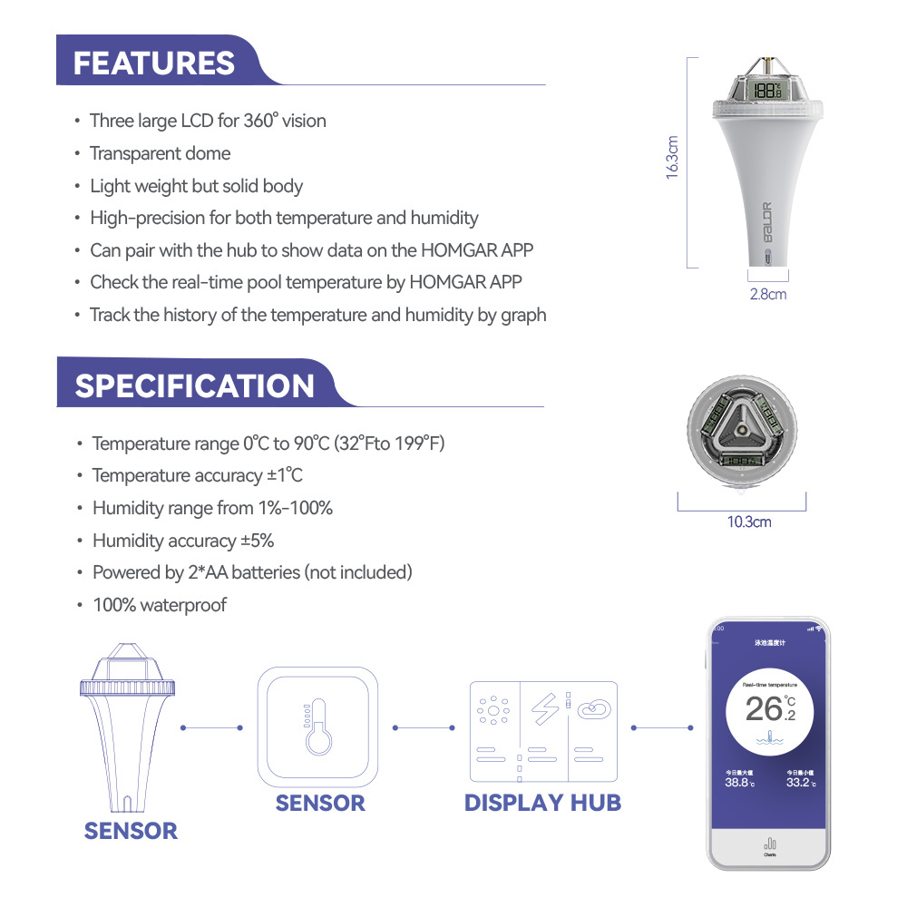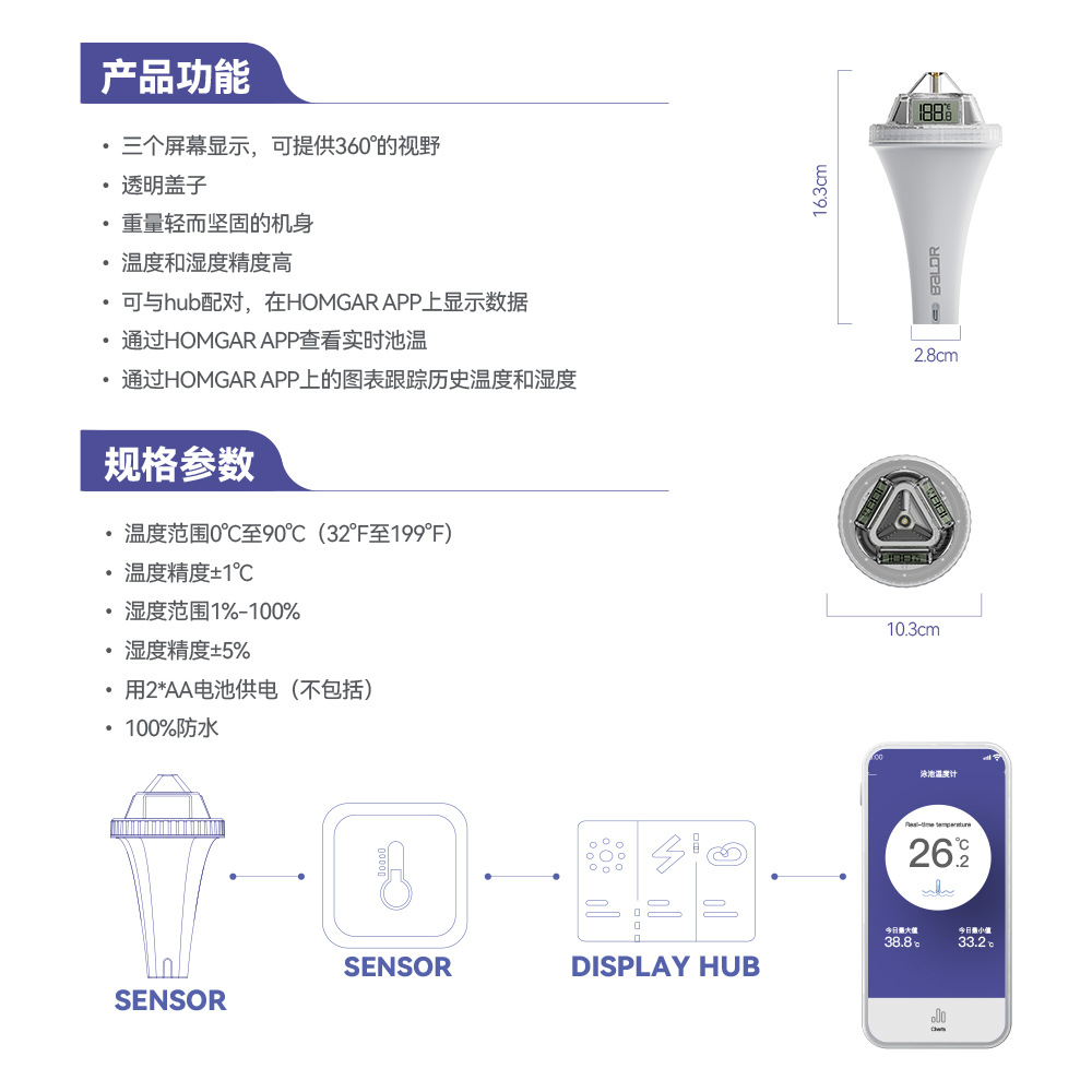 BALDR 수온 측정기 수영장 온도계 실내 온도 및 습도 측정기 360도 시각적 온도 측정기