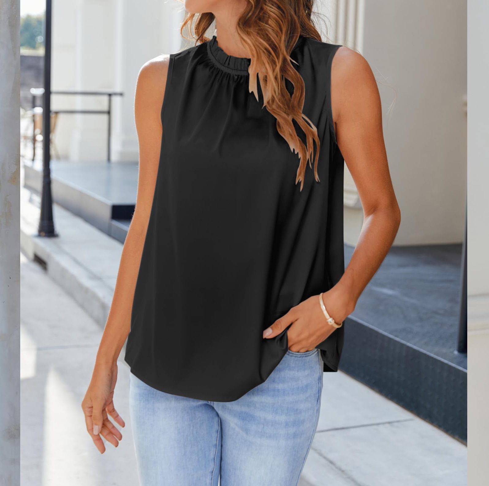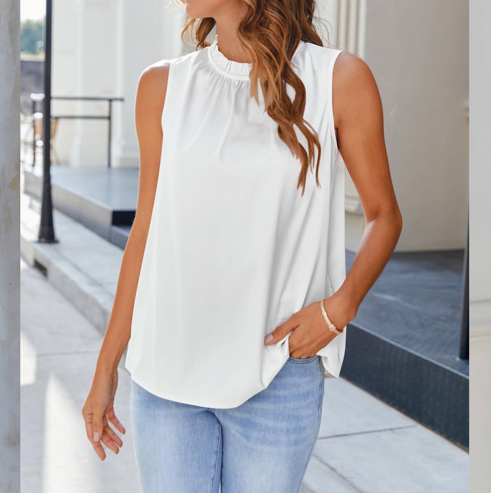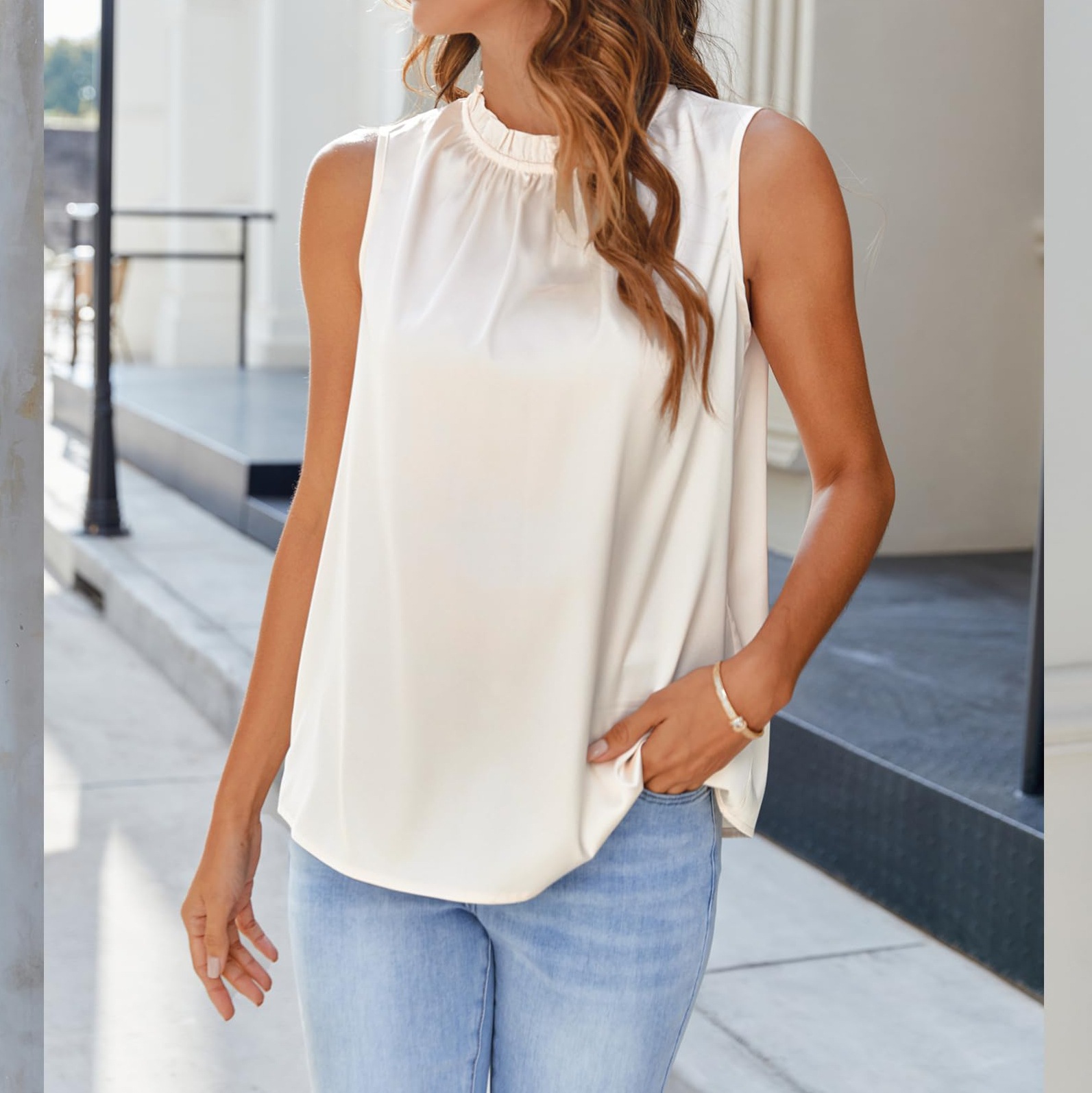 여성 실크 새틴 탱크 탑 비즈니스 캐주얼 셔링 트림 기업 칼라 민소매 여름 셔츠 블라우스